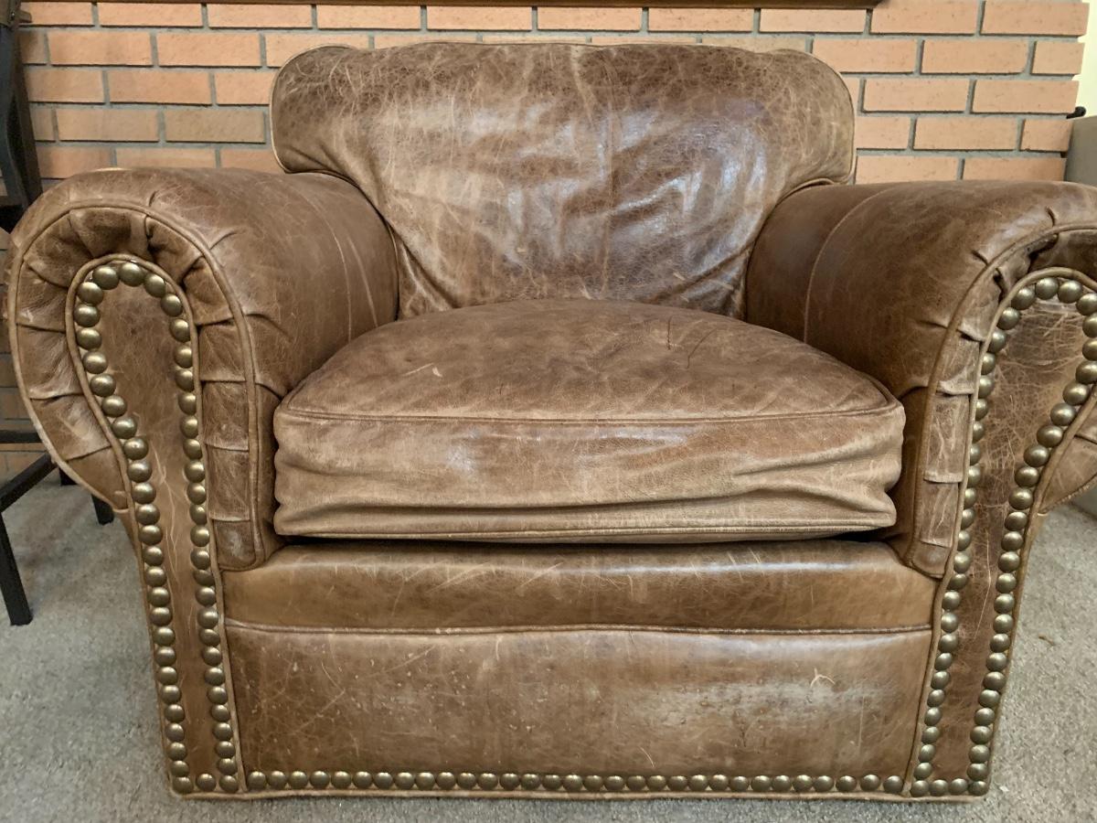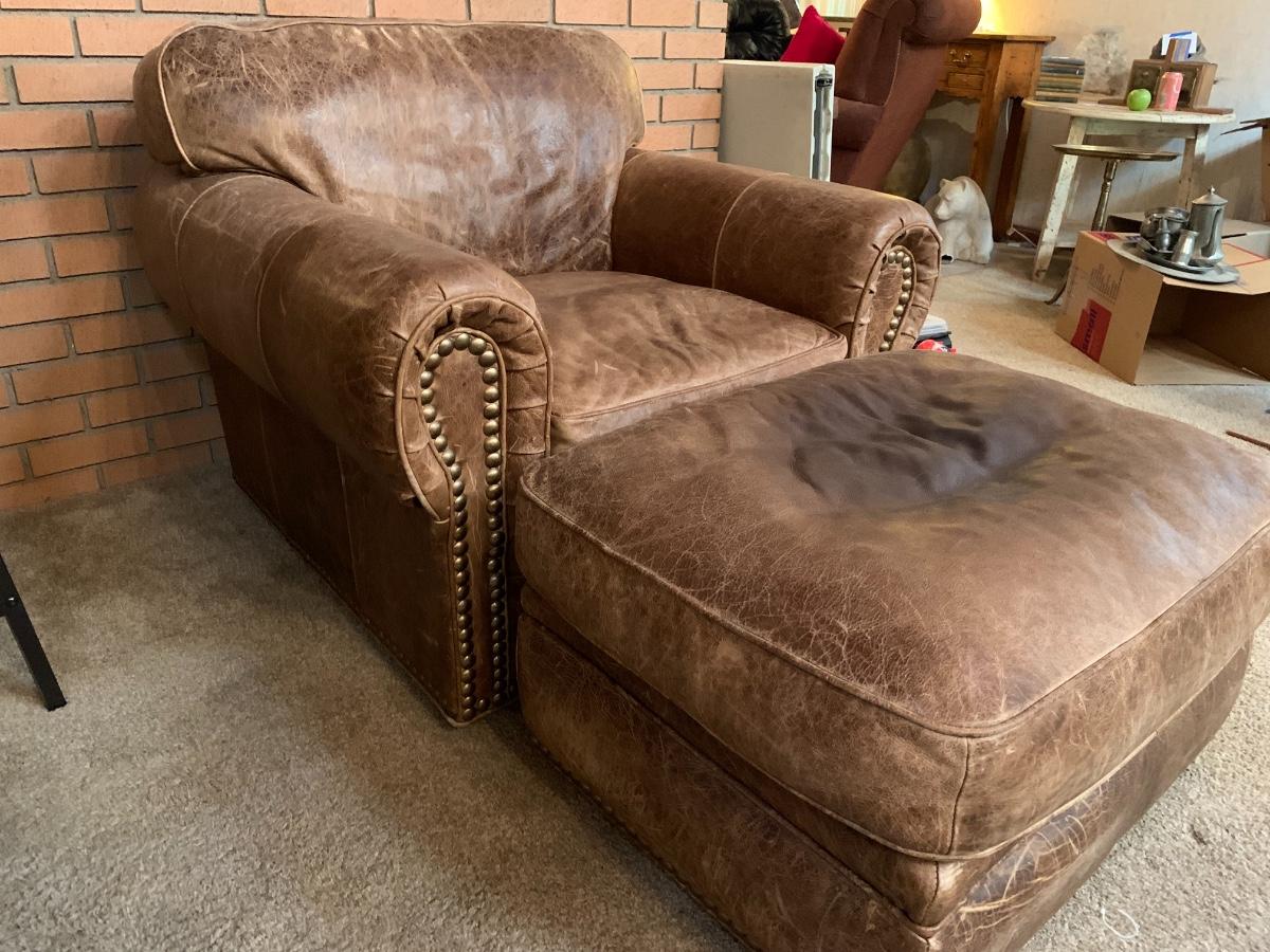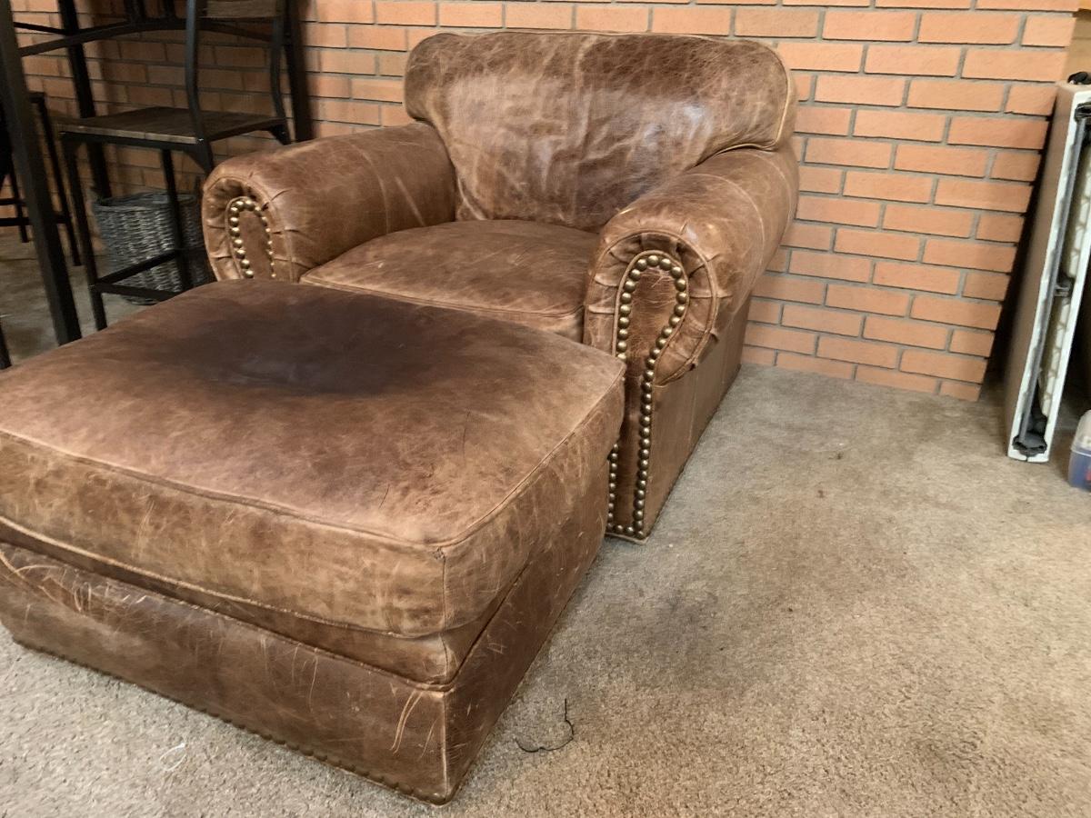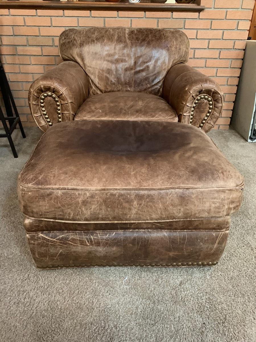 Distressed Lexington leather chair (2 feet and 7 inches in height, 3 feet and 2 inches in depth, 3 feet and 2 inches wide, seat height is 17 inches, seat depth is 22 inches) and ottoman which is on casters
