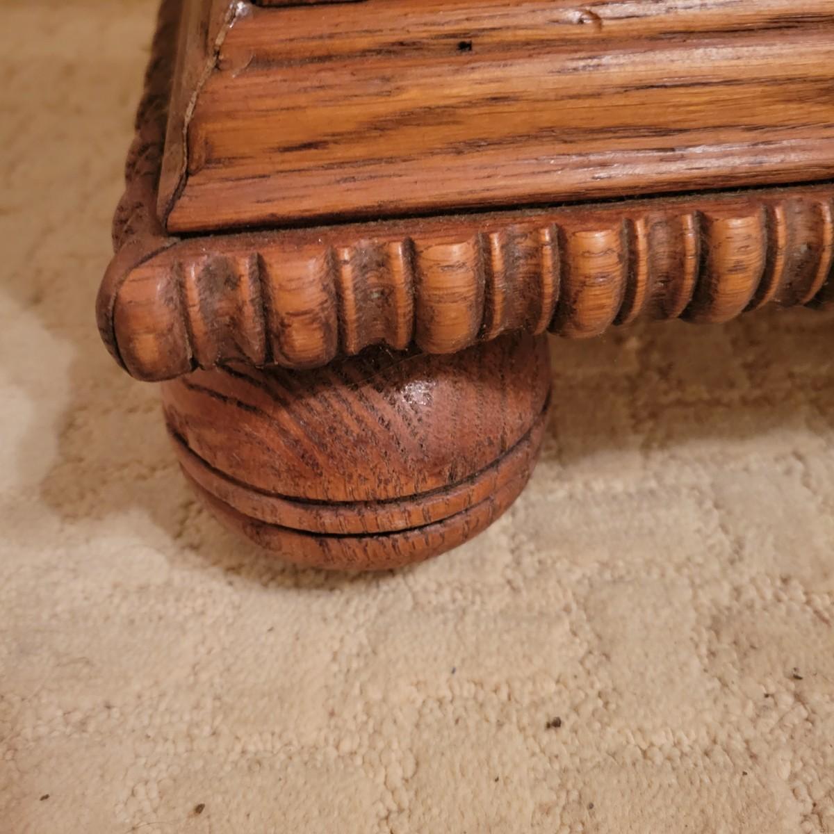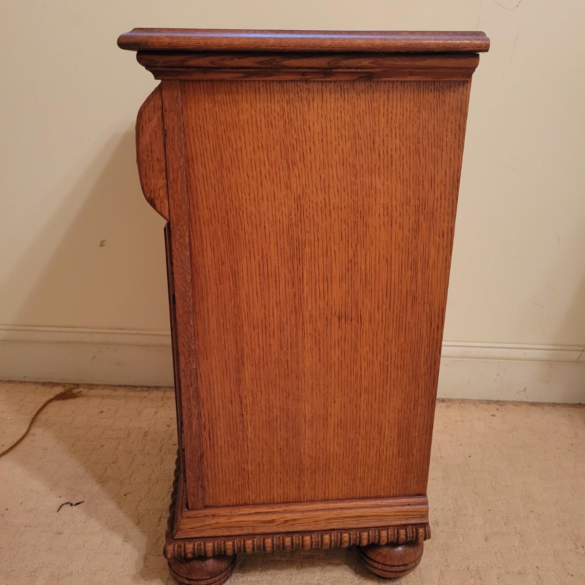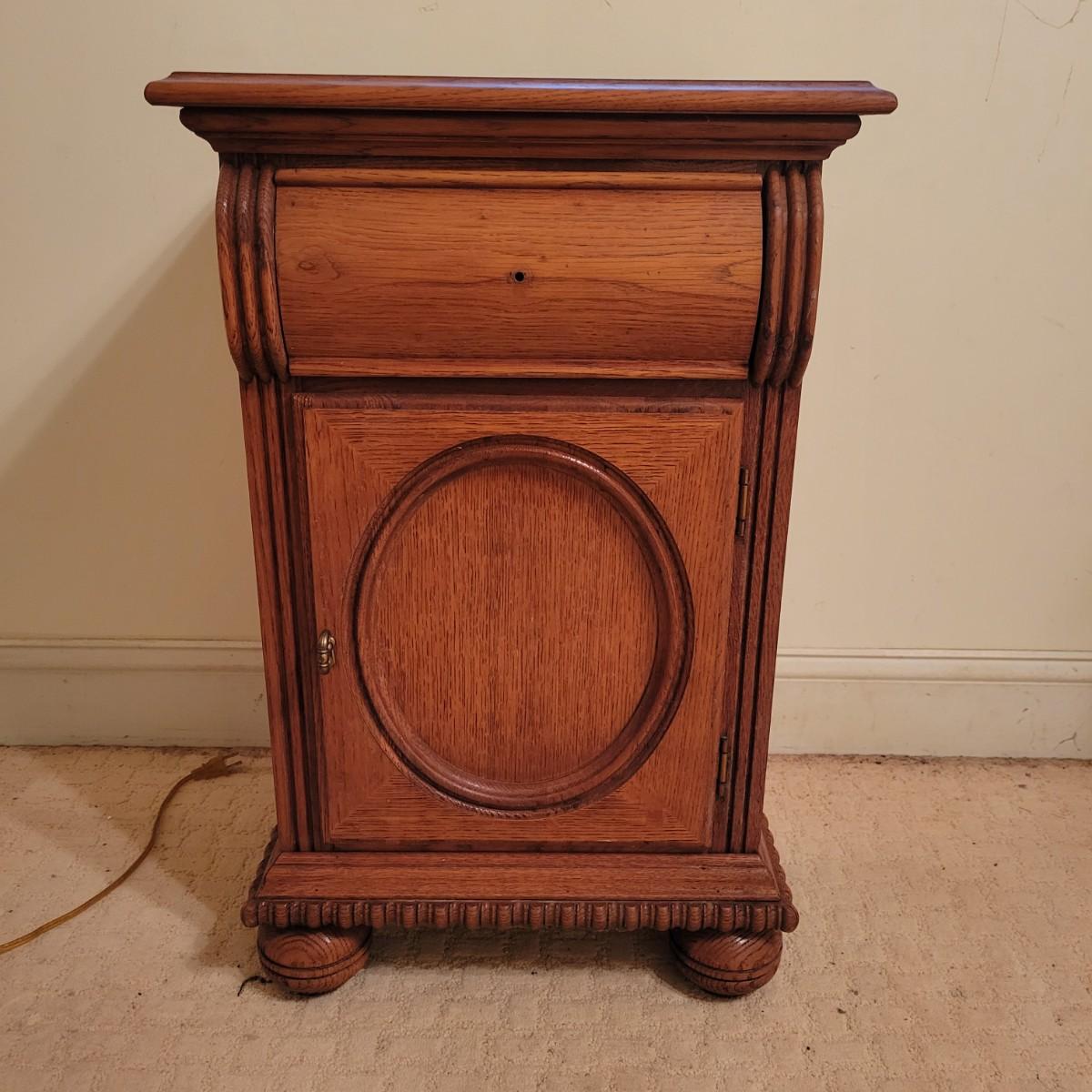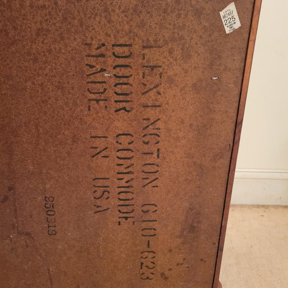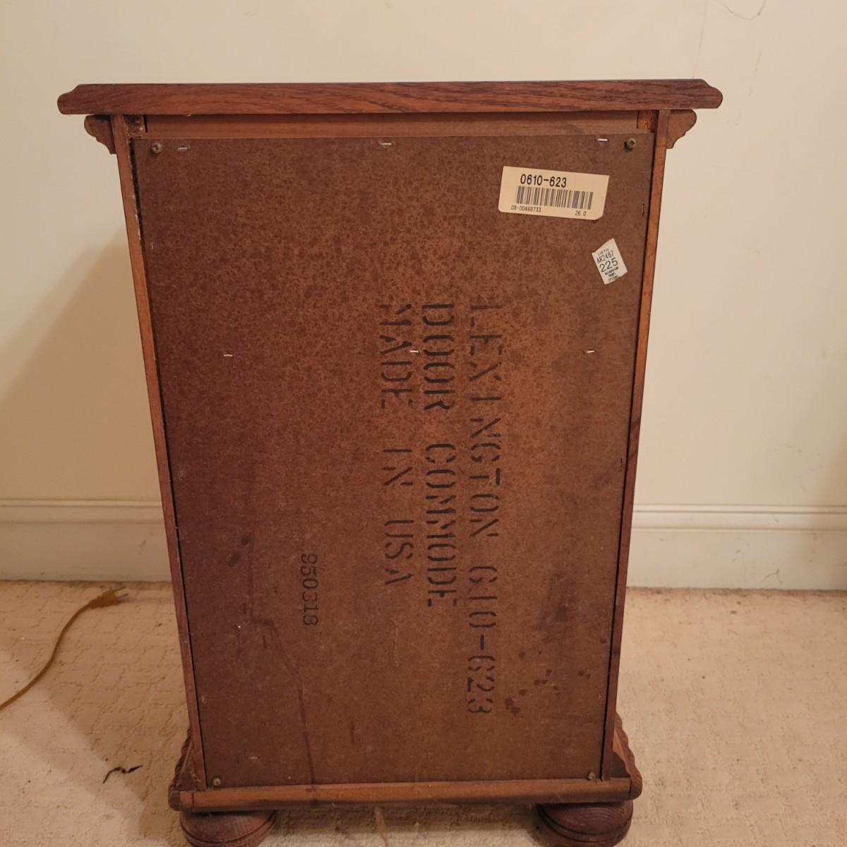A Lexington oak side table in good condition, but does have a few blemishes on its top and is missing the knobs on the drawer. This item matches the bedframe and dressing table in this auction. Measures approximately 18" x 14" x 28.5 ". There are a number of other lots that are in this sale in this Lexington collection Local pickup only