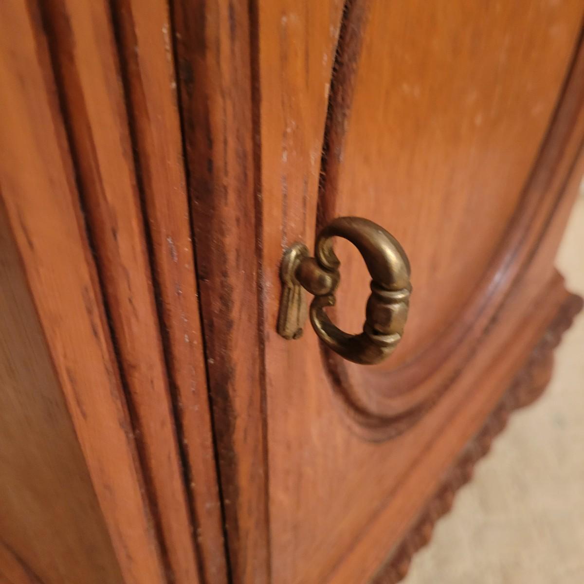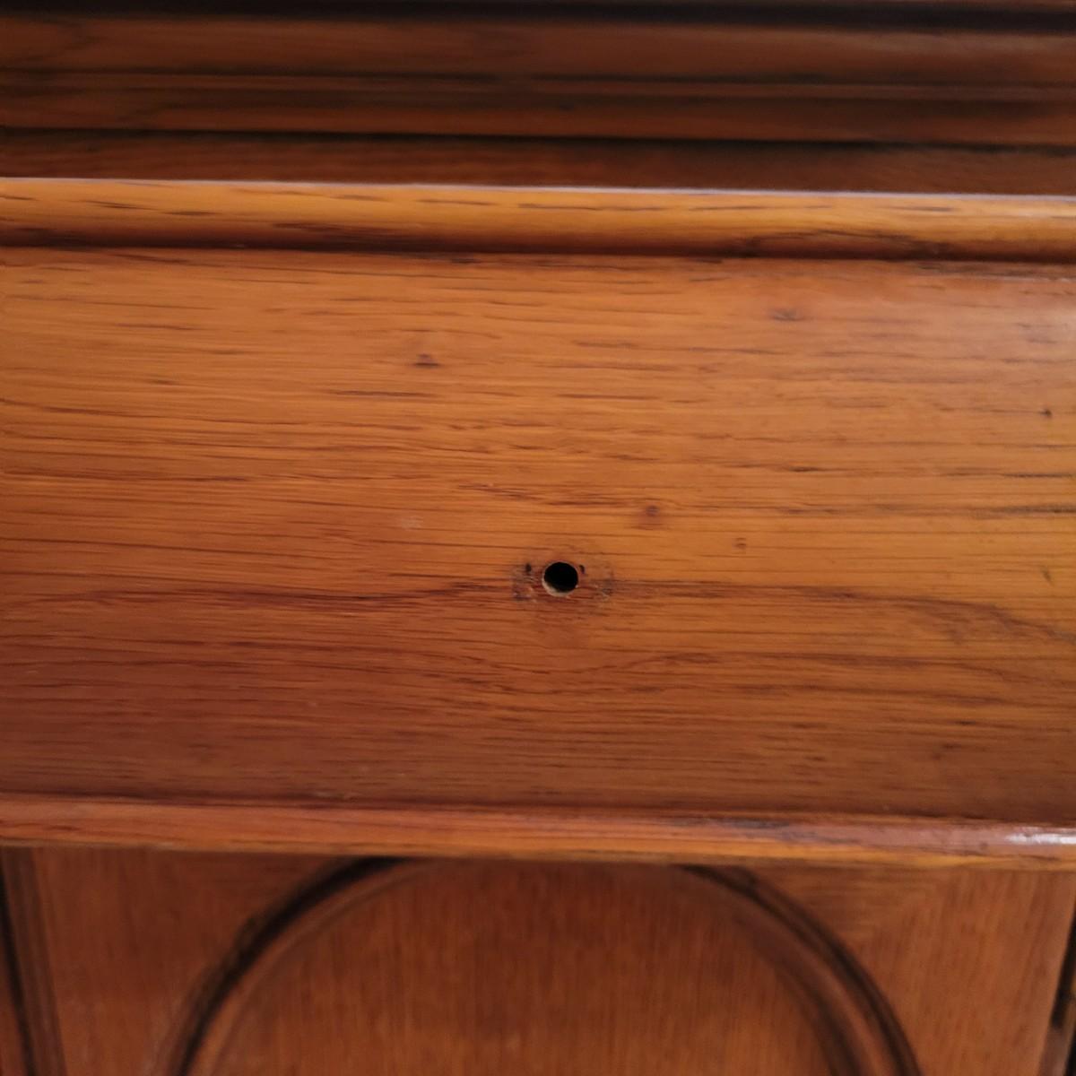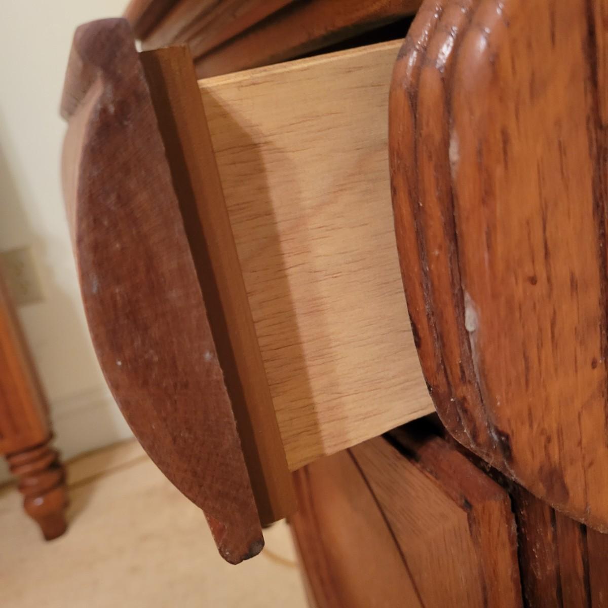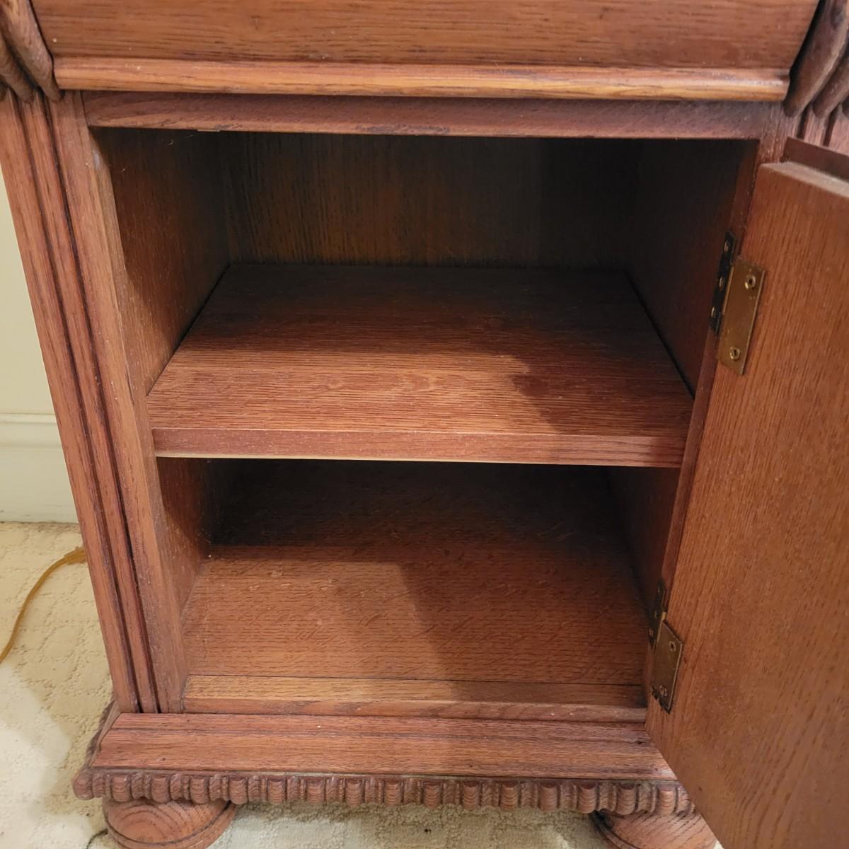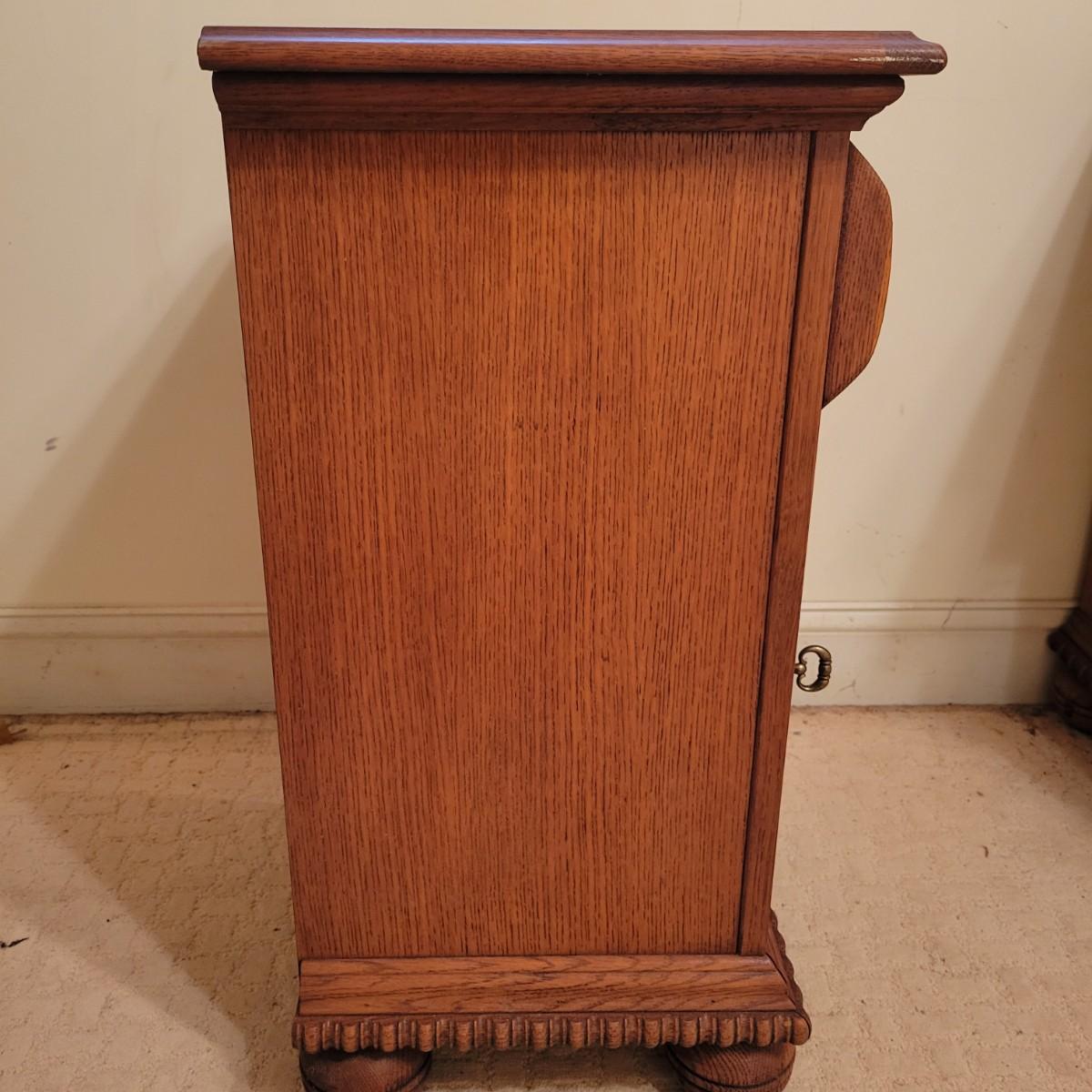 A Lexington oak side table in good condition, but does have a few blemishes on its top and is missing the knobs on the drawer. This item matches the bedframe and dressing table in this auction. Measures approximately 18" x 14" x 28.5 ". There are a number of other lots that are in this sale in this Lexington collection Local pickup only
