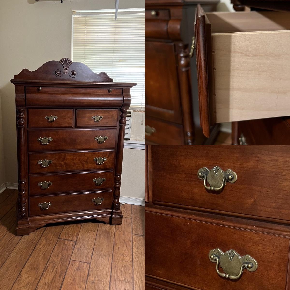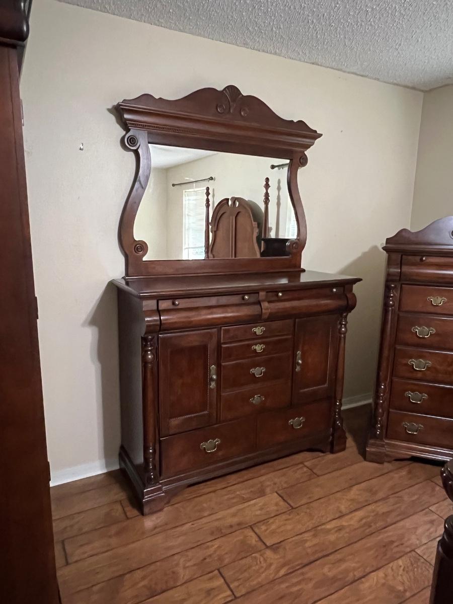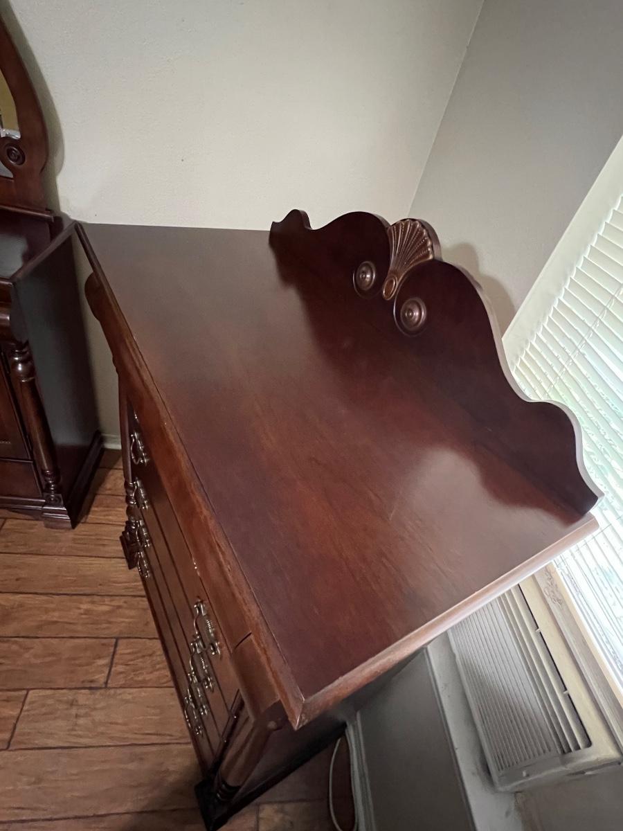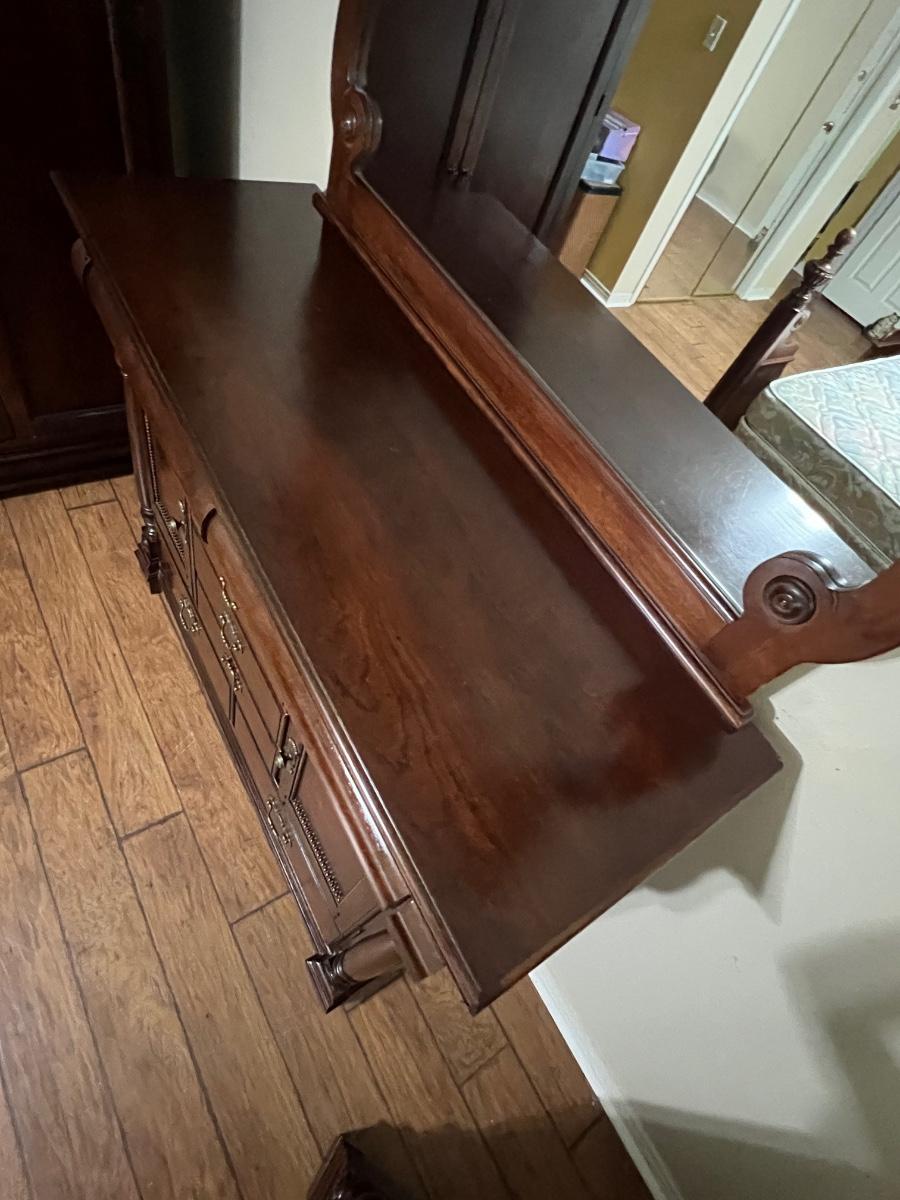 Overall Great Condition ~ No Major Damage ~ No name brand found. No night stands available. Mattress & box spring not included. Does have heel marks on side boards ~ Topper on the chest of drawers needs to be slightly tightened, see photos. Headboard = 78” H ~ Dresser only = 44.5” H x 54.25” W x 19” D ~ Dresser has 2 felt lined Drawers ~ Mirror = 42” H ~ Chest of drawers = 60.5” H x 40.25” W x 19” D. ** Although we have cleaned and polished the entire set, the owner did have a cat and there are a few minor surface scratches. Looks Great!