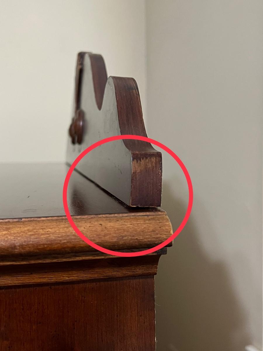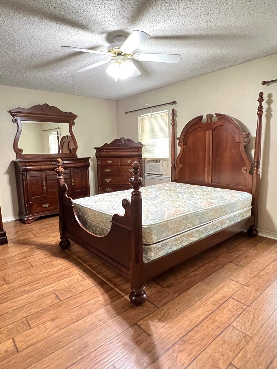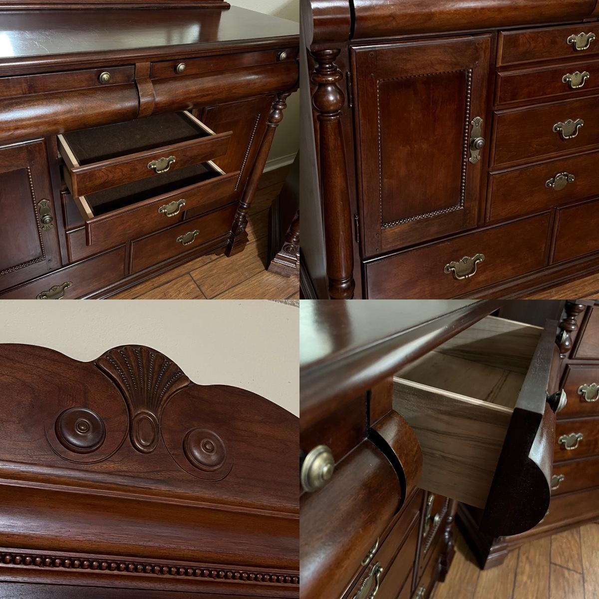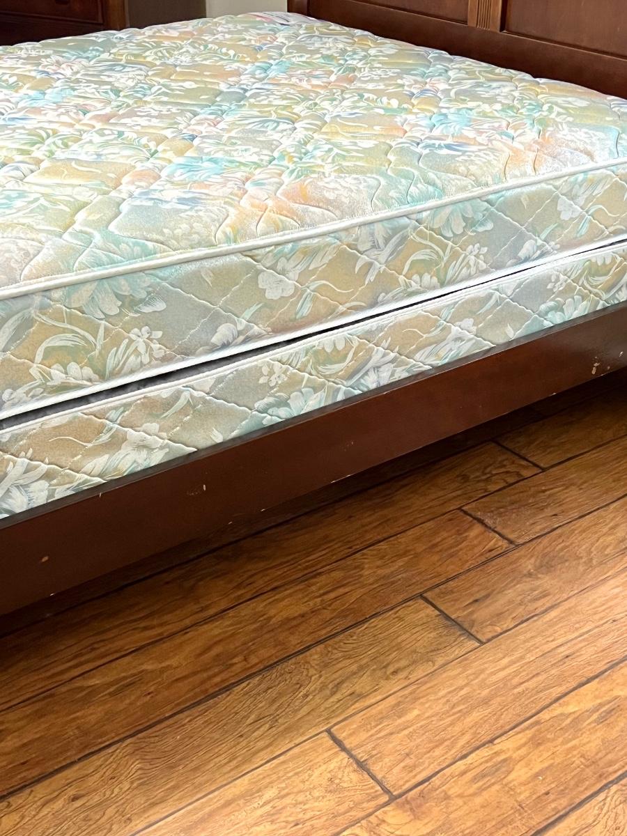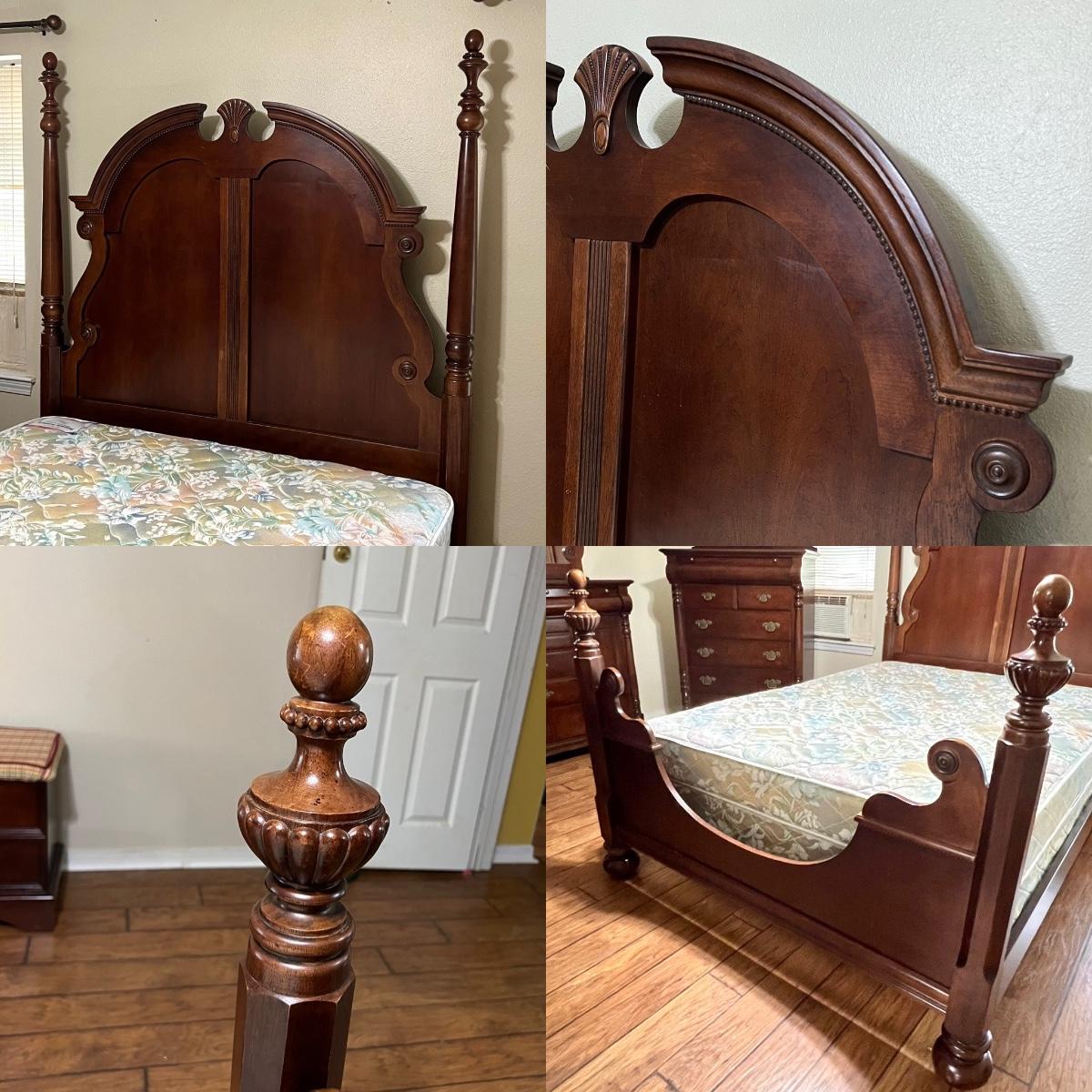 Overall Great Condition ~ No Major Damage ~ No name brand found. No night stands available. Mattress & box spring not included. Does have heel marks on side boards ~ Topper on the chest of drawers needs to be slightly tightened, see photos. Headboard = 78” H ~ Dresser only = 44.5” H x 54.25” W x 19” D ~ Dresser has 2 felt lined Drawers ~ Mirror = 42” H ~ Chest of drawers = 60.5” H x 40.25” W x 19” D. ** Although we have cleaned and polished the entire set, the owner did have a cat and there are a few minor surface scratches. Looks Great!