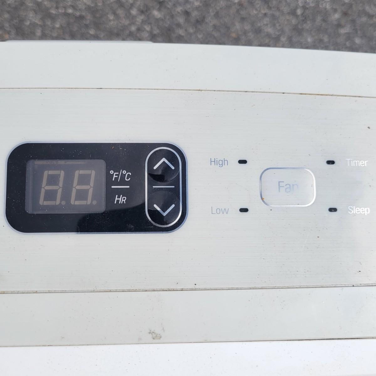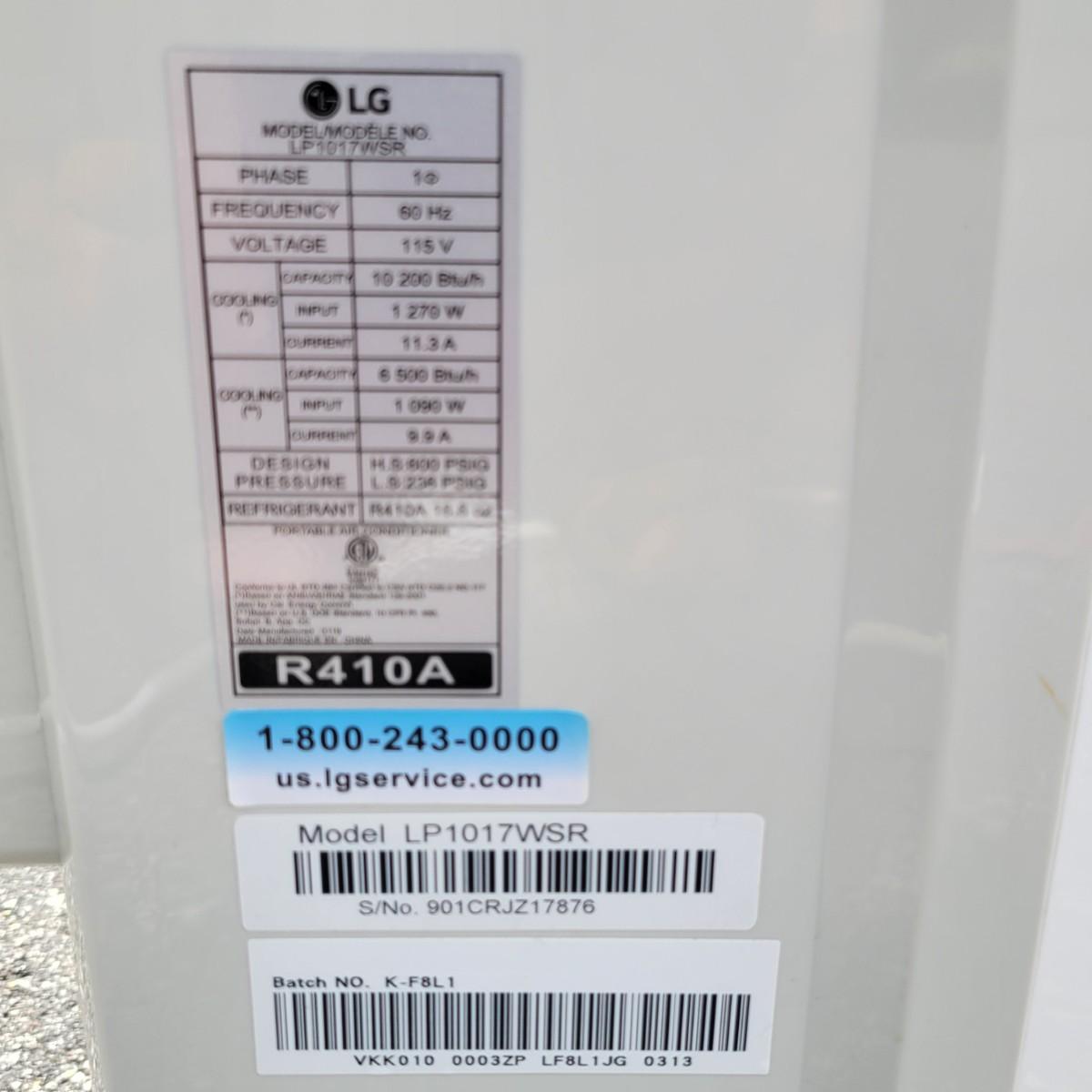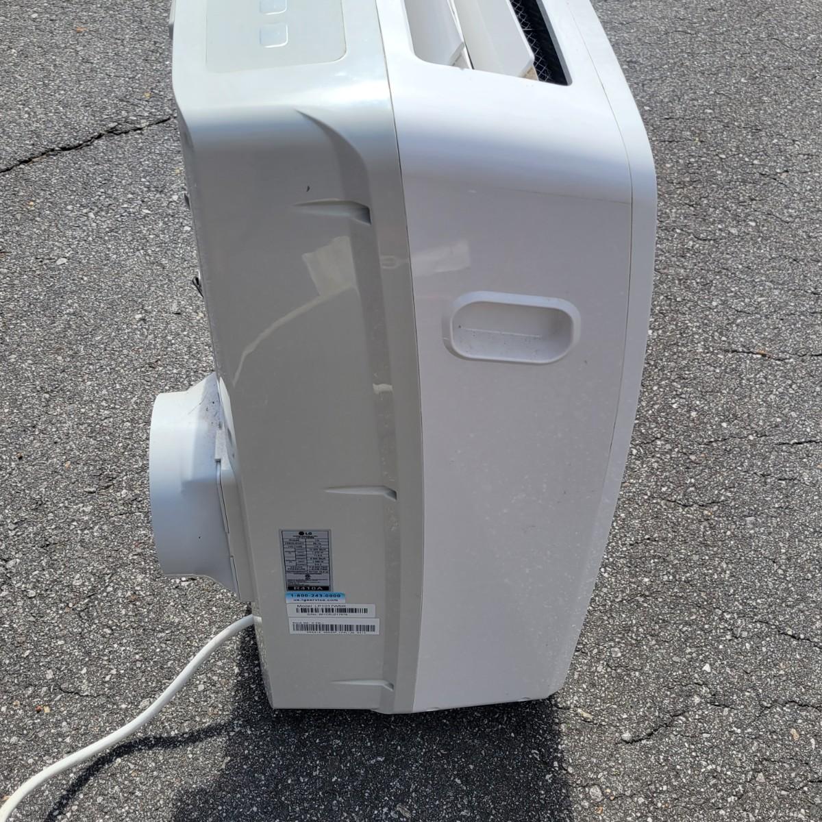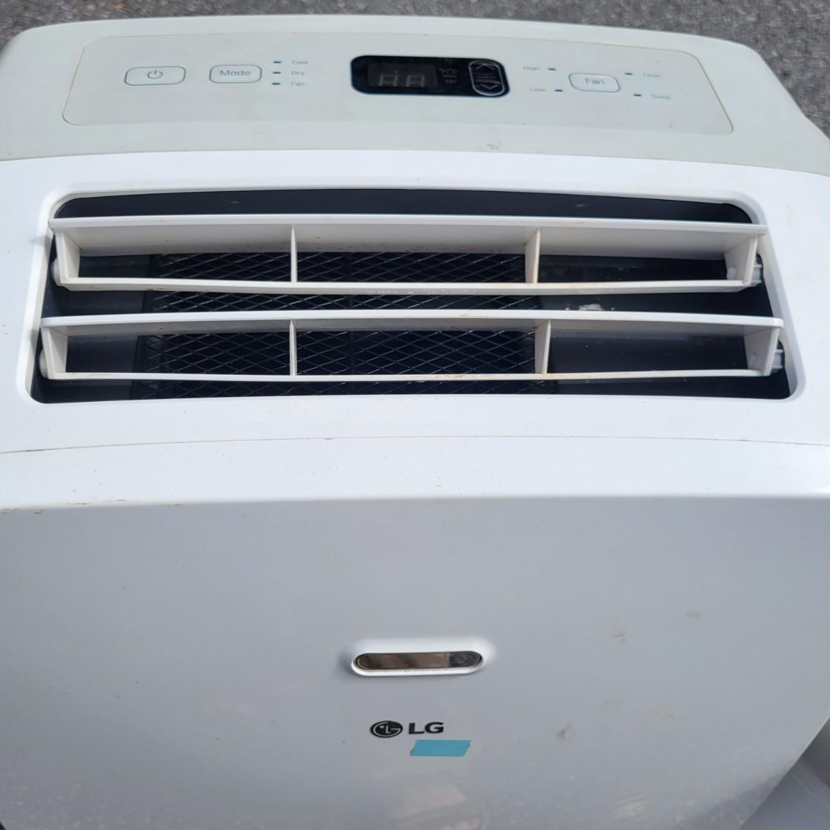 An LG portable ac unit that powered on when plugged in. Model# LP1017WSR that has a 10,200 btu cooling capacity. It measures approximately 17" x 12" x 27"H and includes a window exhaust hose. Local pickup only