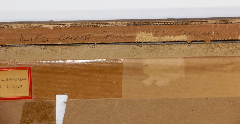 Luis German Cajigas (listed artist) vintage serigraph, frame shows wear, 26" x 20" framed.