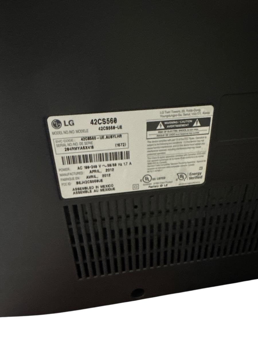 LG 42CS560 42” LCD flat screen TV with full HD 1080p resolution. Manufactured in 2012, this model offers a clear picture and vibrant colors, ideal for everyday viewing. Features include HDMI ports and a sleek, black design with a sturdy stand.