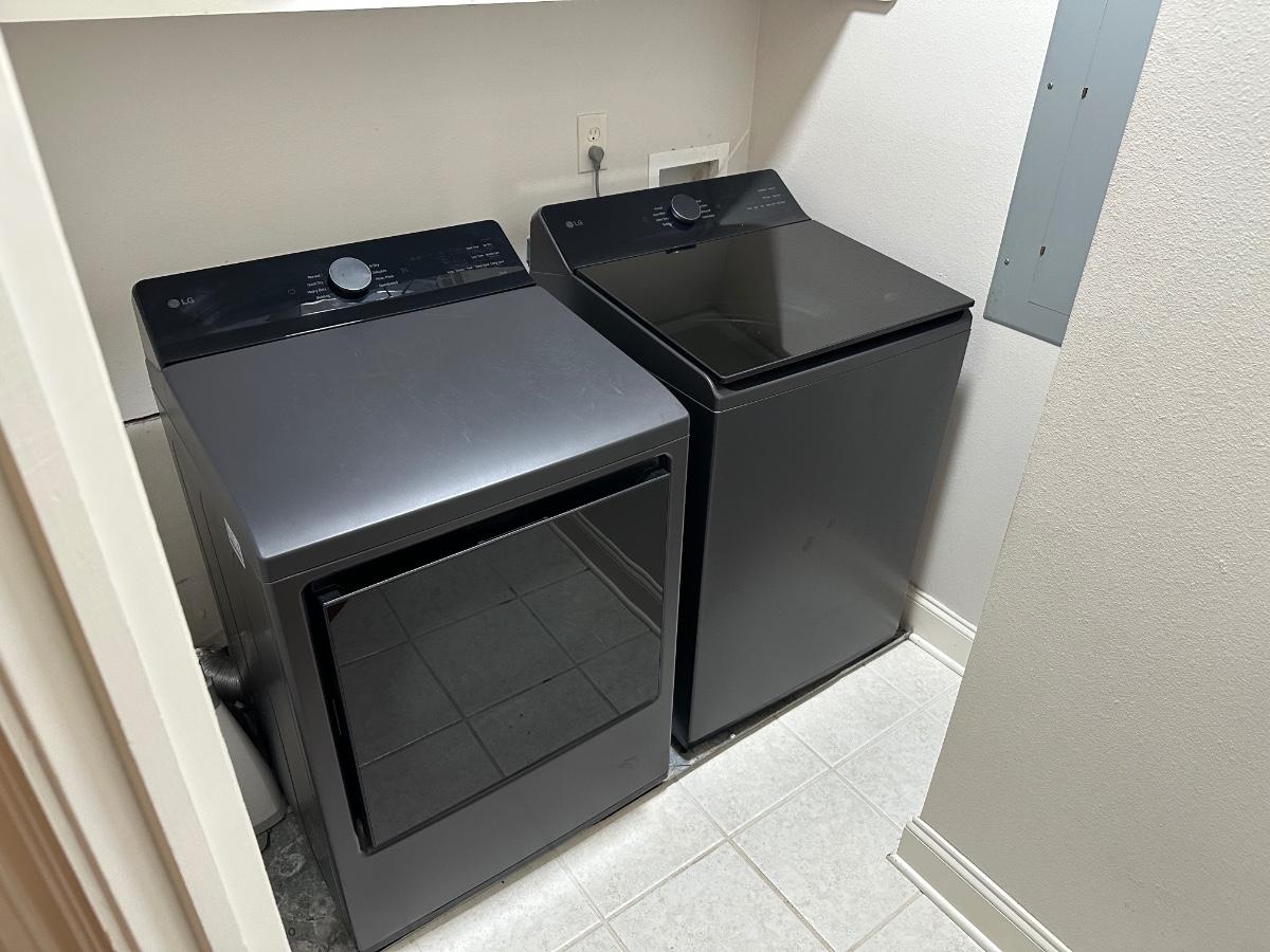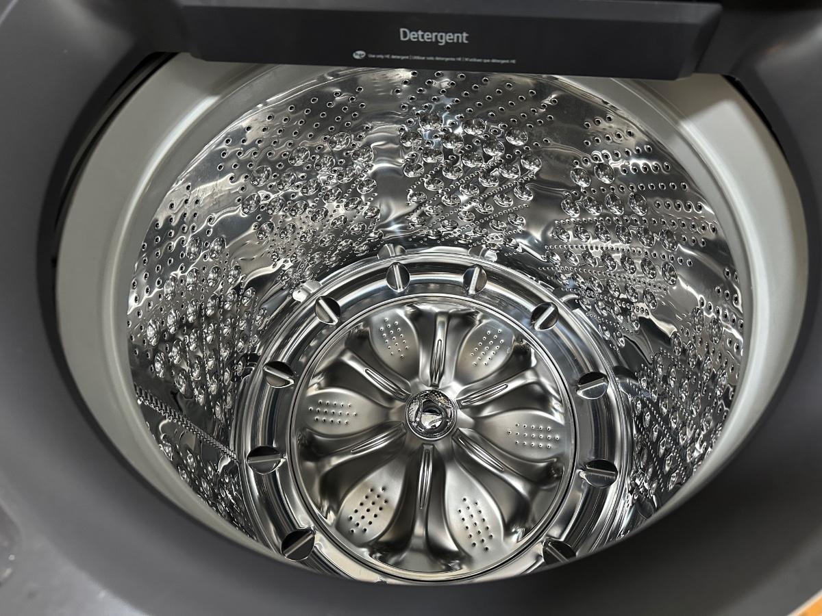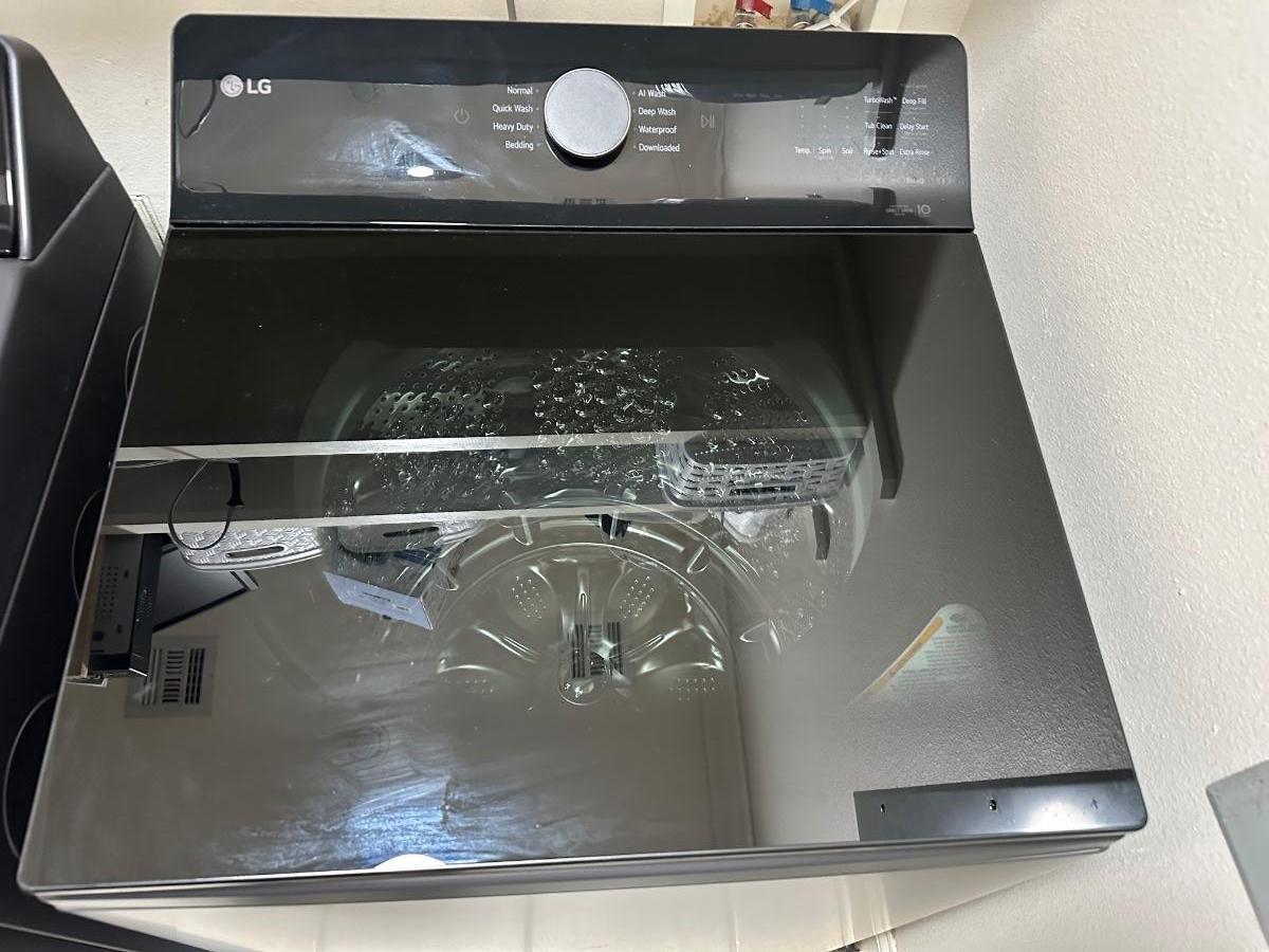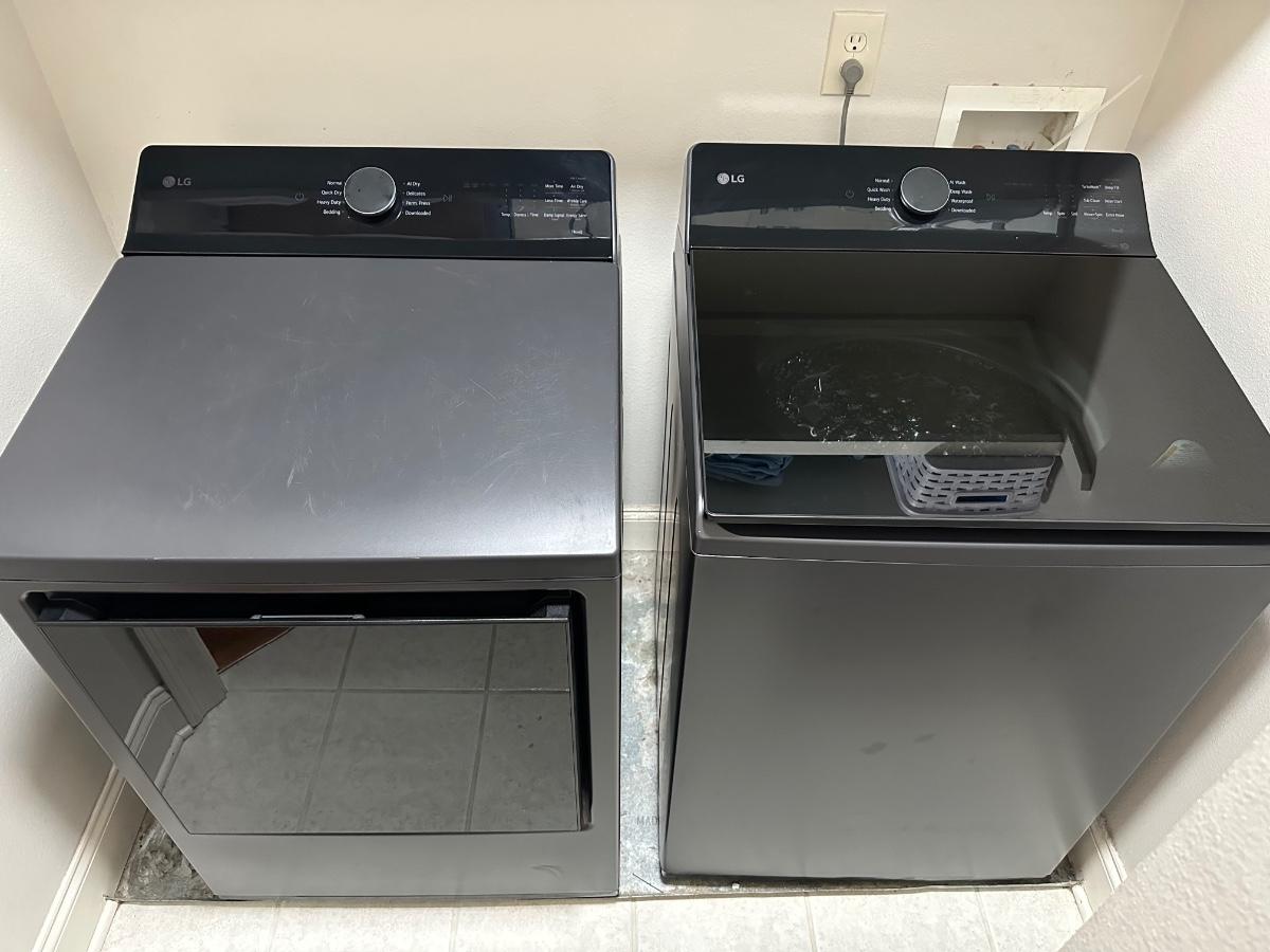 Modern high-capacity LG top-load washer and matching electric dryer in sleek graphite steel finish.