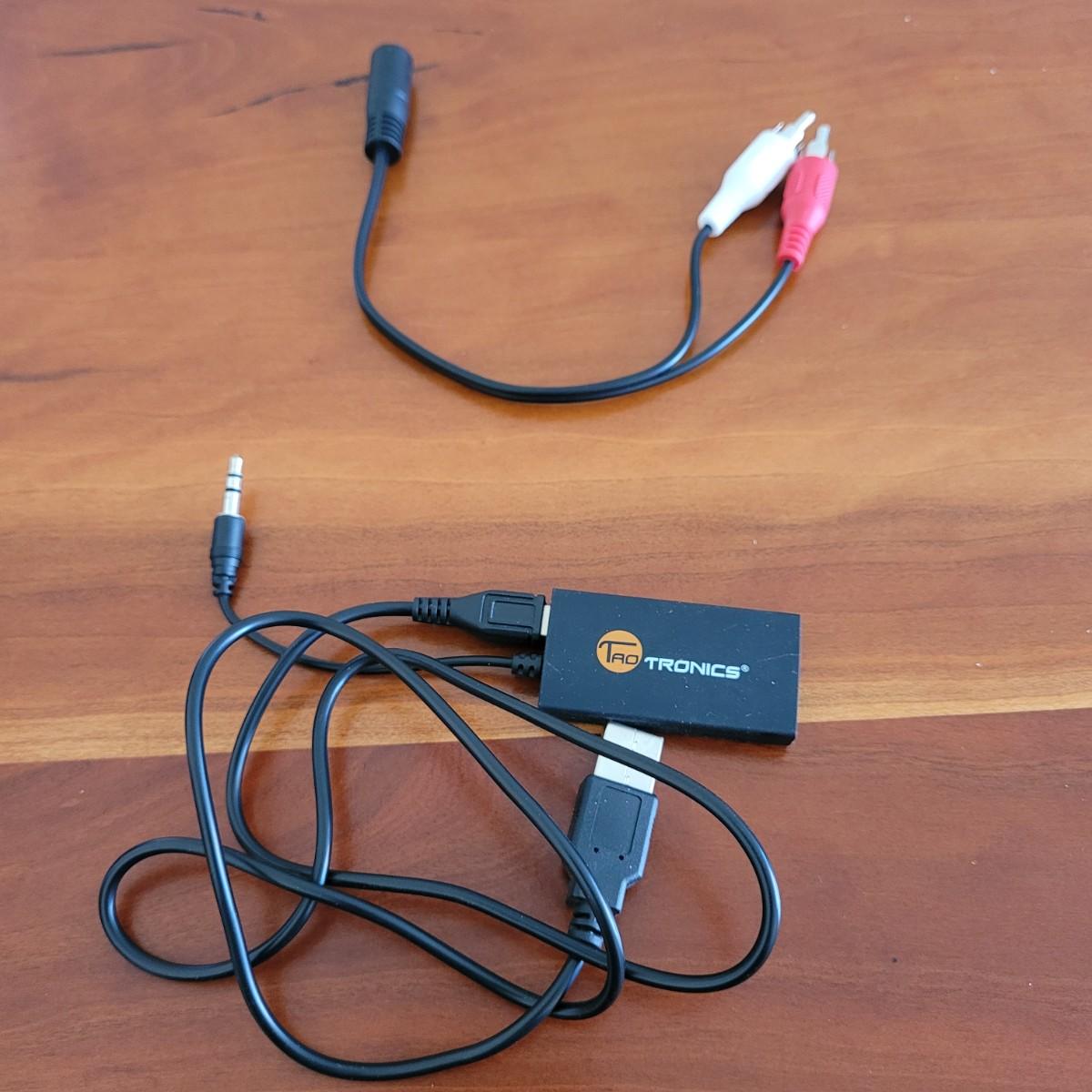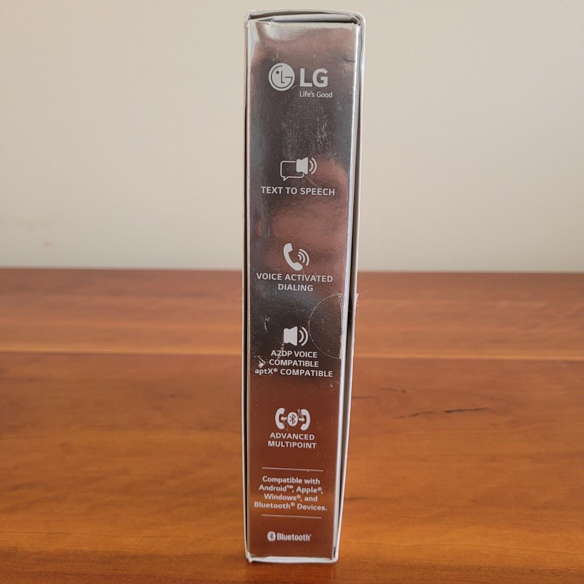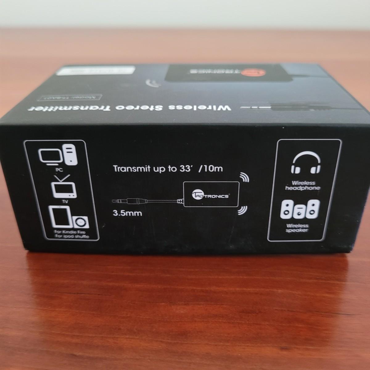 This lot includes an LG brand Bluetooth headset and wireless stereo transmitter. The headset is designed for use with a mobile phone and supports media and sms calling. Packaging boasts 10.5 hours battery time for music and 16 hours battery time for calling. Includes charging cord and original packaging. The wireless stereo transmitter is TaoTronics brand and is designed to turn any device with a 3.5mm auxiliary jack into a radio transmitter for streaming to a radio. It includes adapter cables and original packaging.