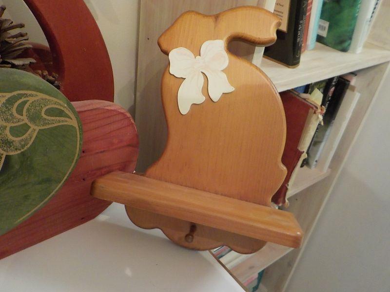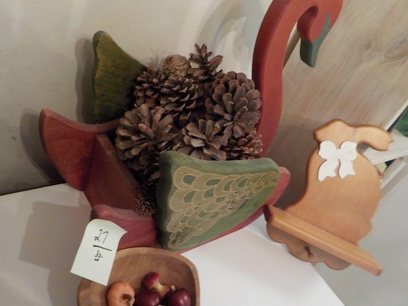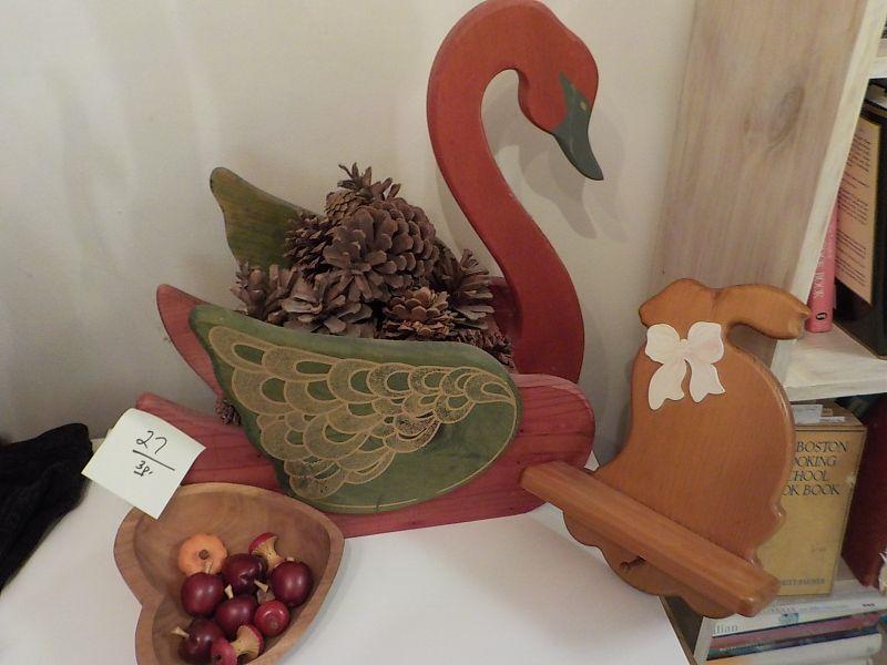 Hand made wood designs a swan with pine cones 24 x 25 x 8 and a shelve with bunny 12 x 8 plus a heart shape bowl with fake fruit.