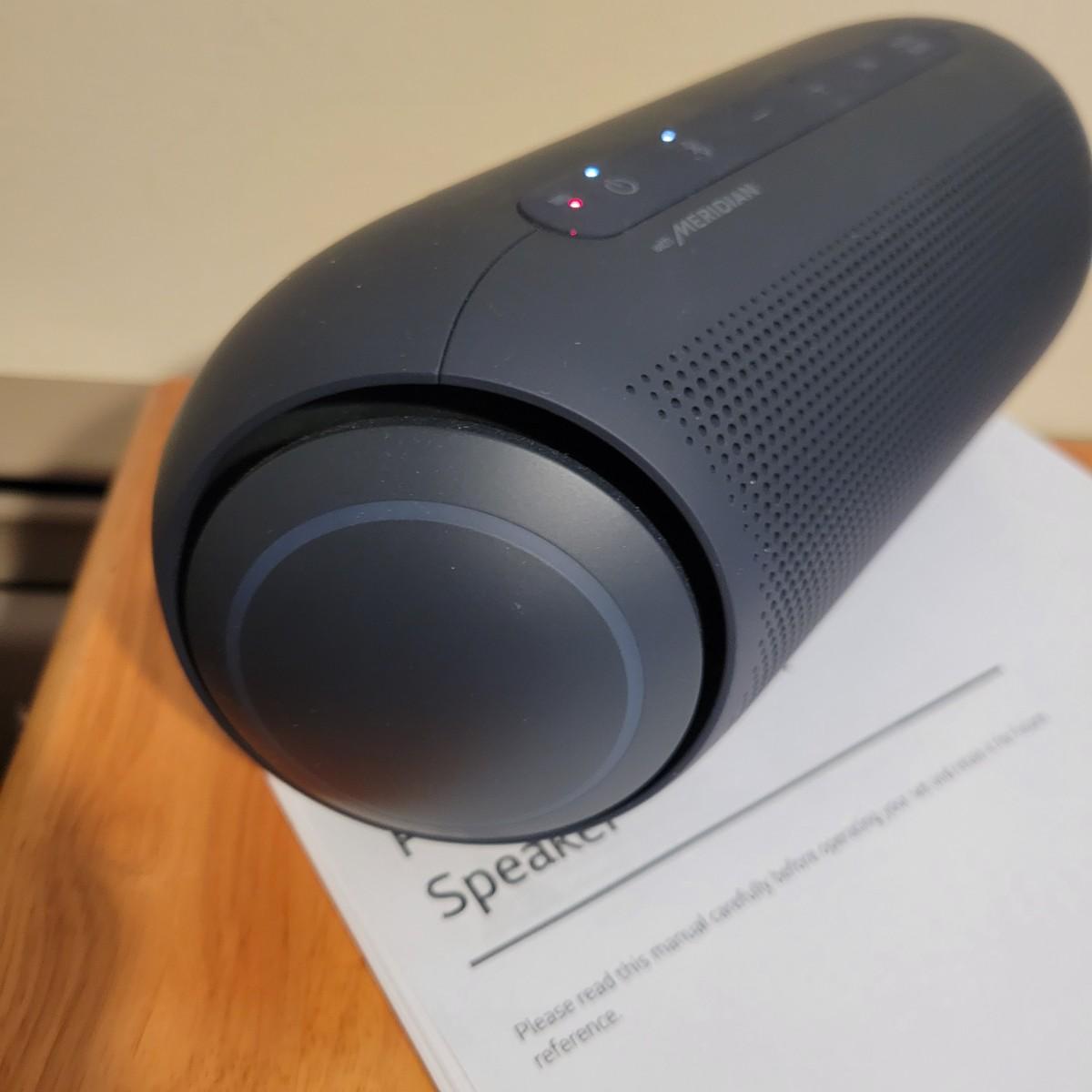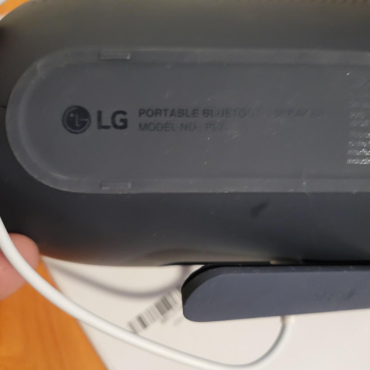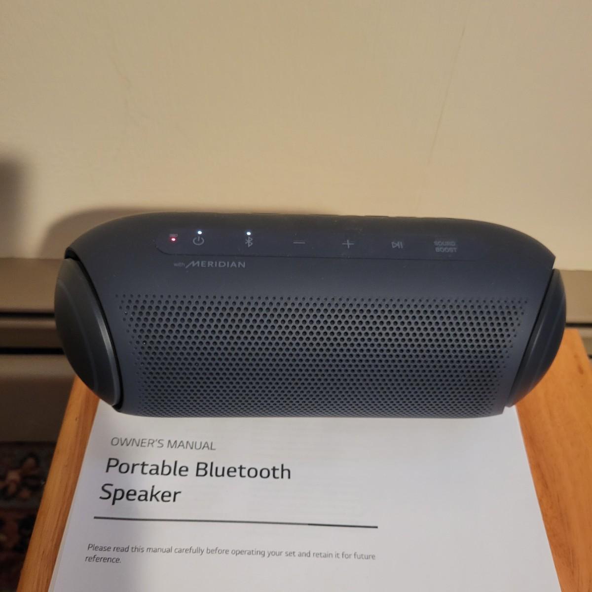 A LG XBOOM portable Bluetooth Speaker that powered on when plugged in. It measures approximately 4"D x 9.5" L. A manual and an USB-C charging cord is included. Shipping available