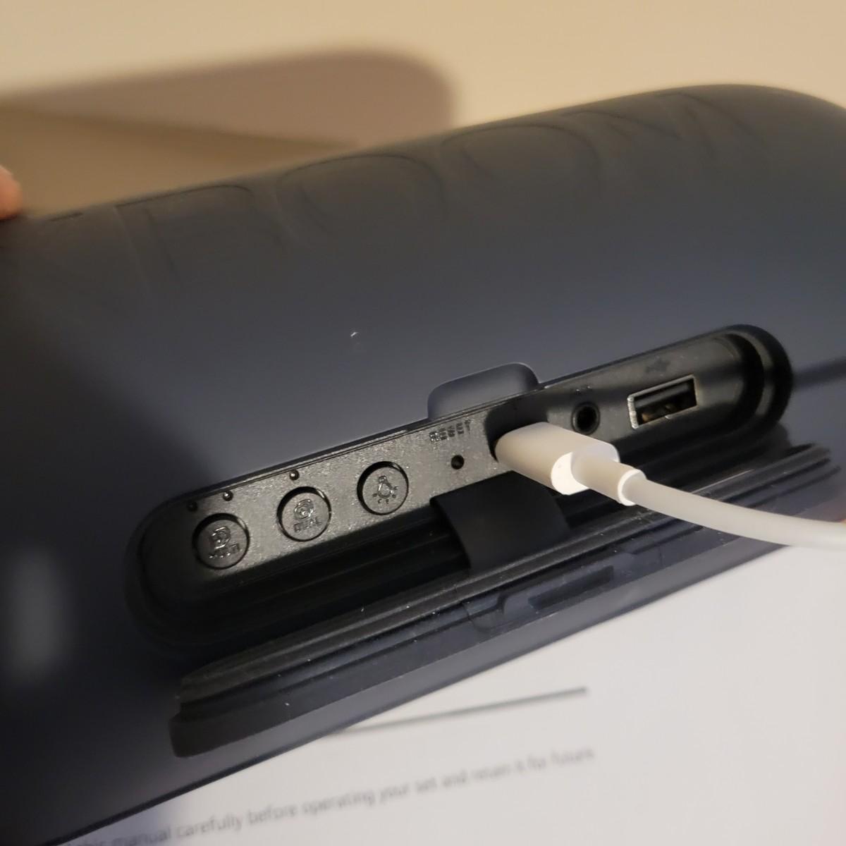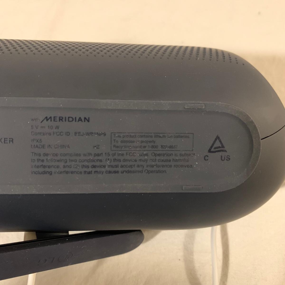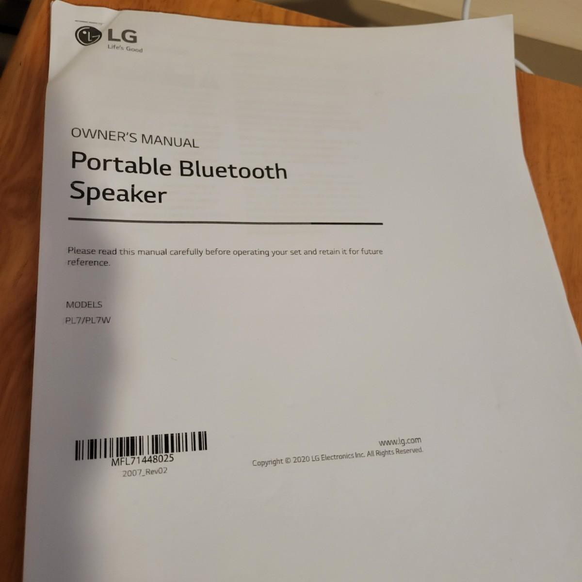 A LG XBOOM portable Bluetooth Speaker that powered on when plugged in. It measures approximately 4"D x 9.5" L. A manual and an USB-C charging cord is included. Shipping available