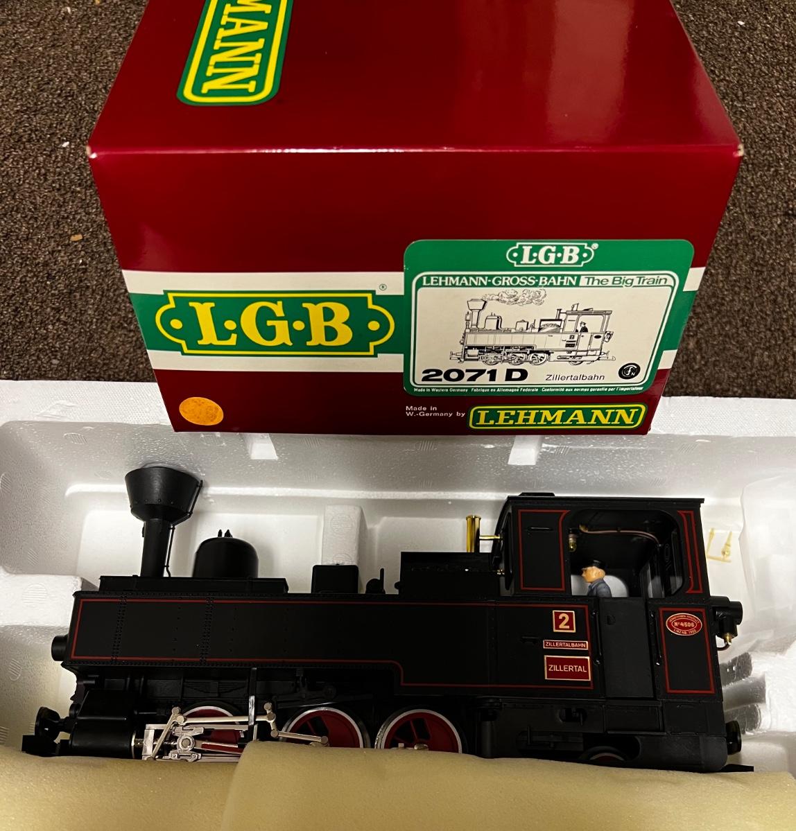 Here is a LGB 2071D G Gauge 2-6-2T Tank Steam Locomotive with Smoke. This powered steam locomotive features a motor, directional lights, operating smoke, plastic hook and latch couplers, an engineer figure, and metal wheels.