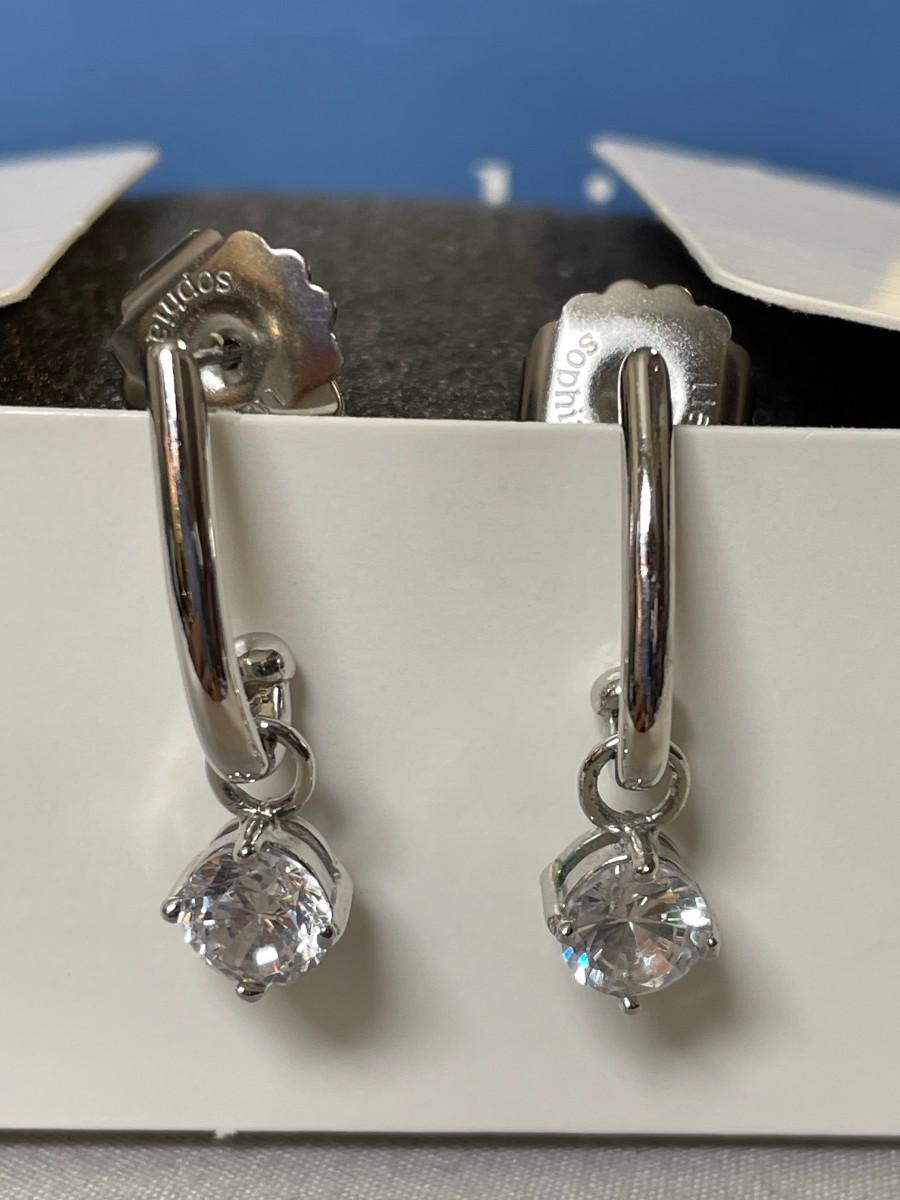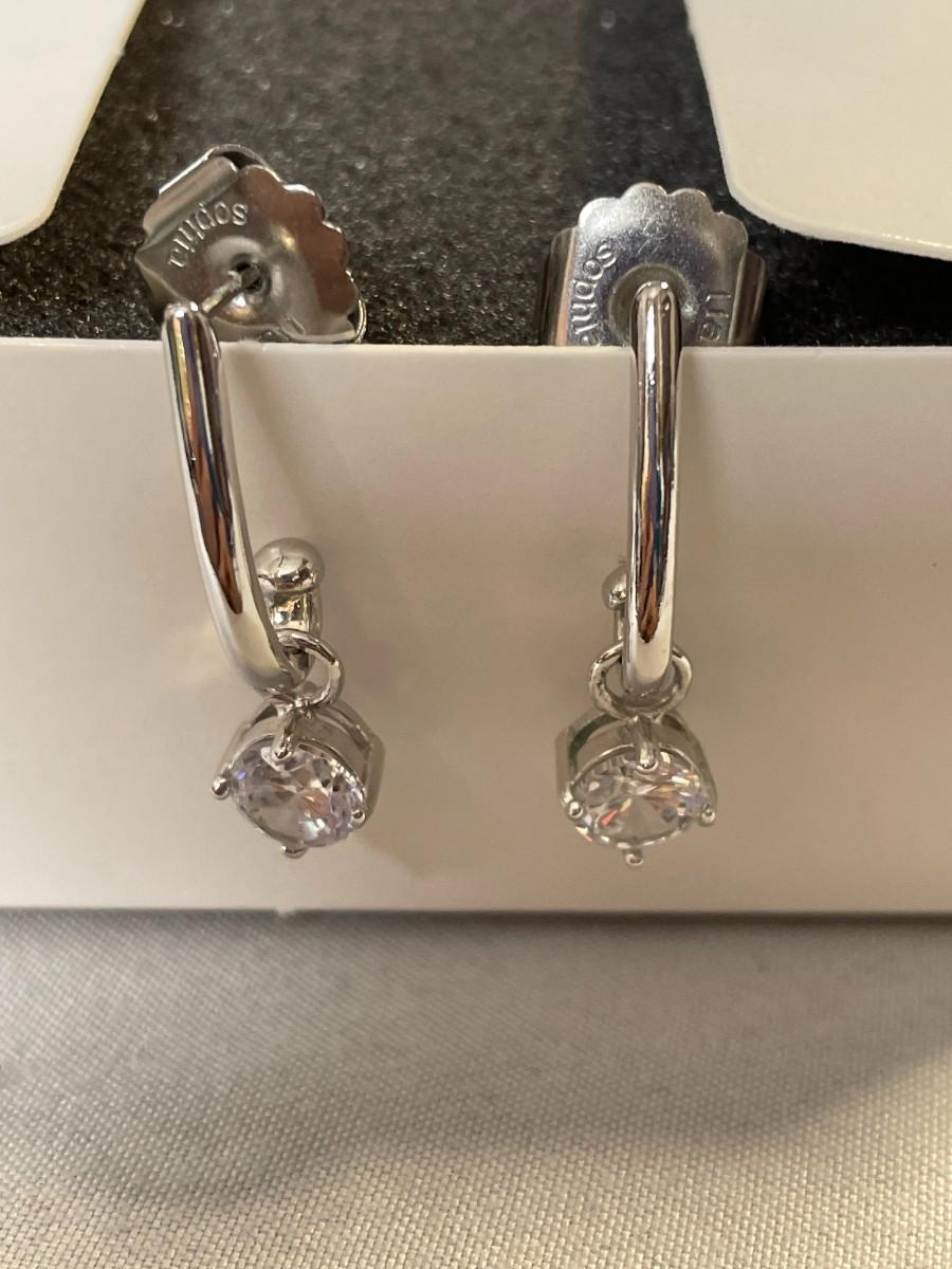 These earrings have never been worn. They are made of a silver colored metal and they have a rhinestone that hangs from them. The rhinestones can be removed or you can add other charms if you wish.