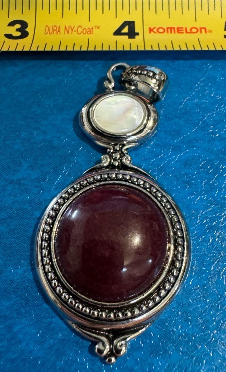 Design and Materials: The pendant showcases a prominent round red jasper stone and a smaller, oval Mother of Pearl inlay, both secured within an ornate silver-tone setting with a Victorian meets Bo-Ho motif featuring flourishes and domed beads.