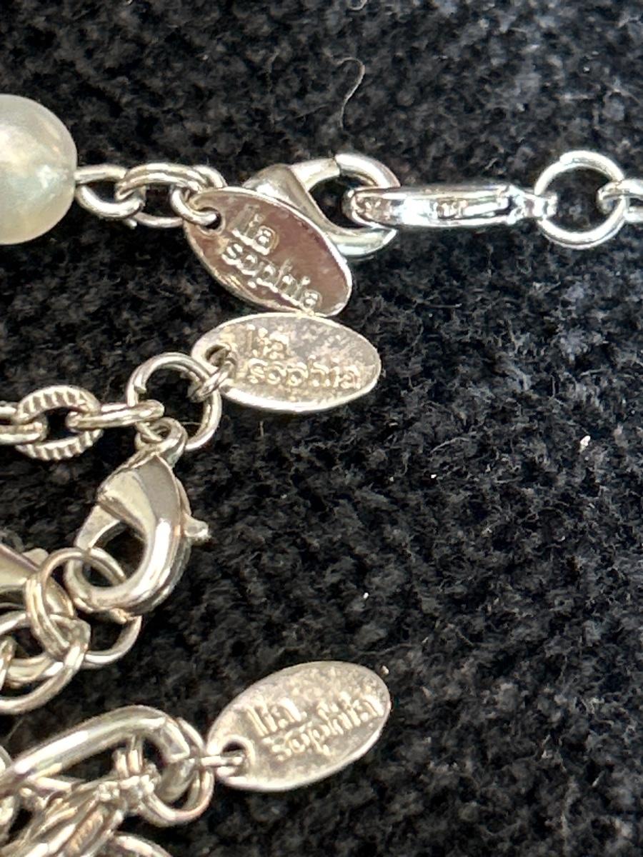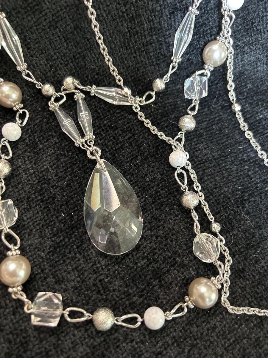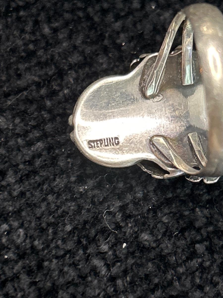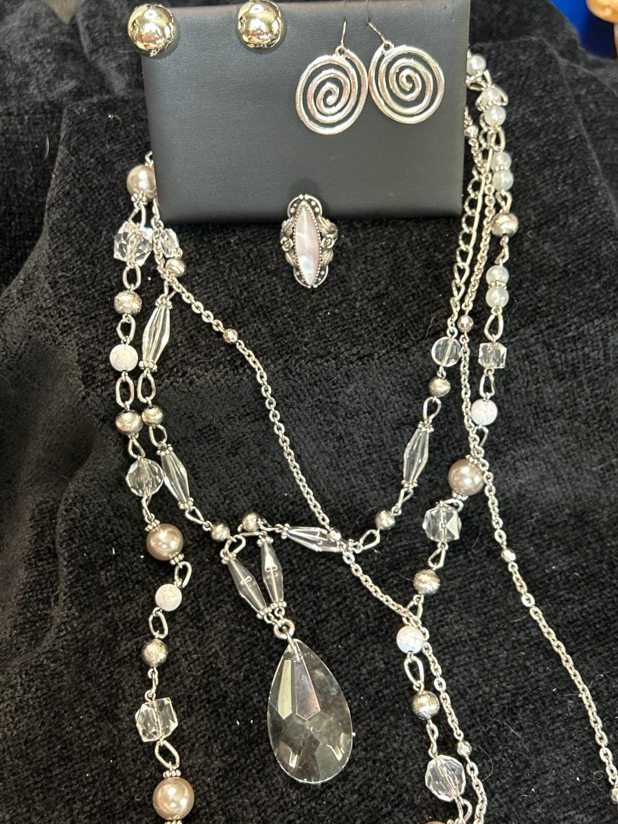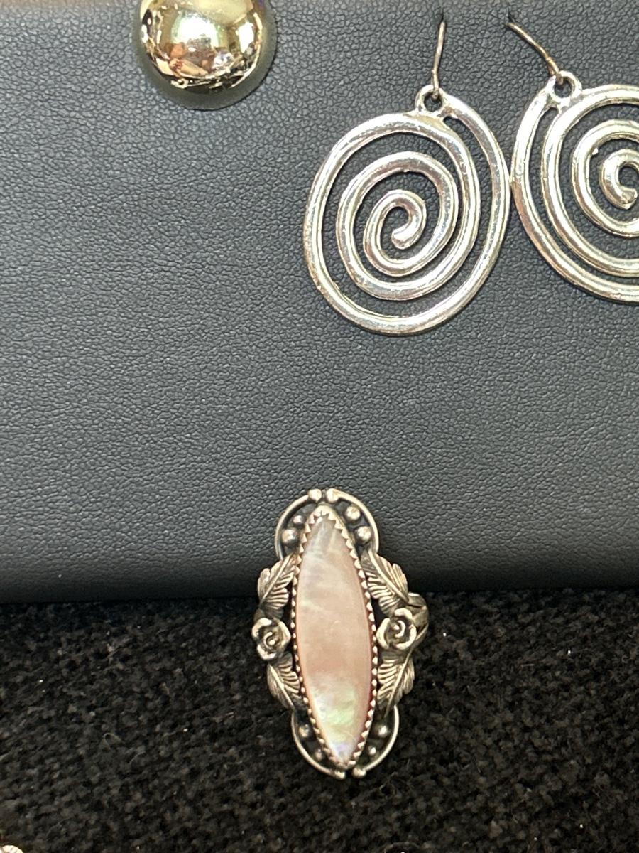 The three silver tone necklaces can be hooked together, both earrings are pierced, and the ring is sterling silver with mother of pearl in the center