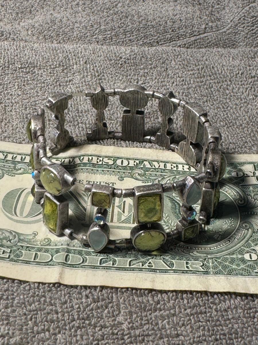 More specifically, it appears to be a style similar to the "Lia Sophia Pretty Green Foil Glass & Blue Stretch Bracelet" or a "LIA SOPHIA STRETCH BRACELET GREEN Crystal AB Aurora Borealis Matte Silver". The stones likely have a reflective or iridescent quality, described as "foil glass" or "crystal AB / Aurora Borealis," which gives them a varied and sparkling appearance.