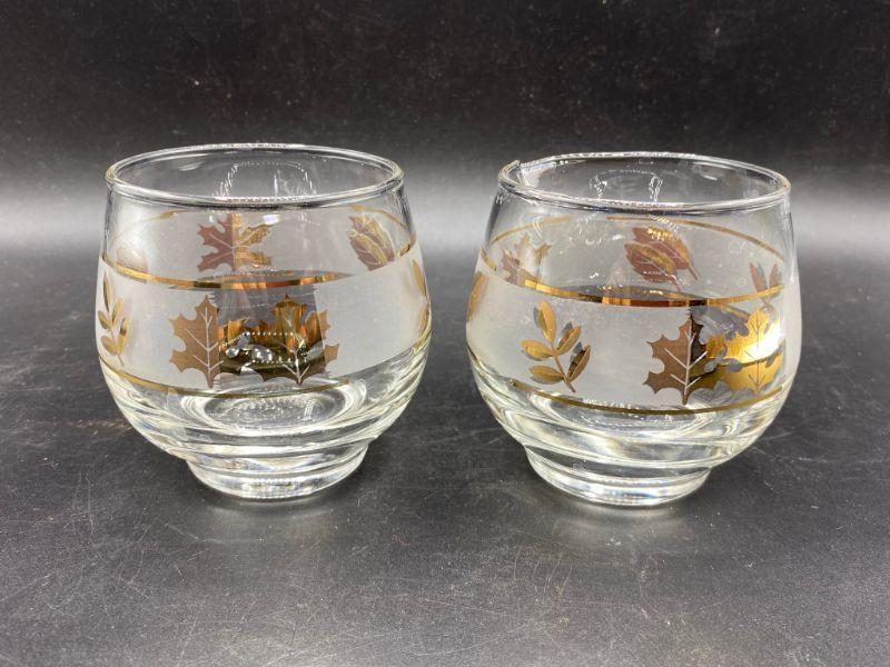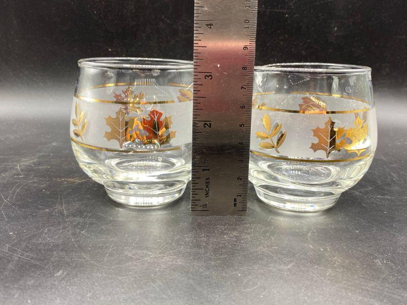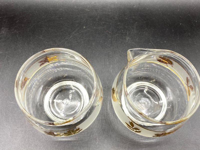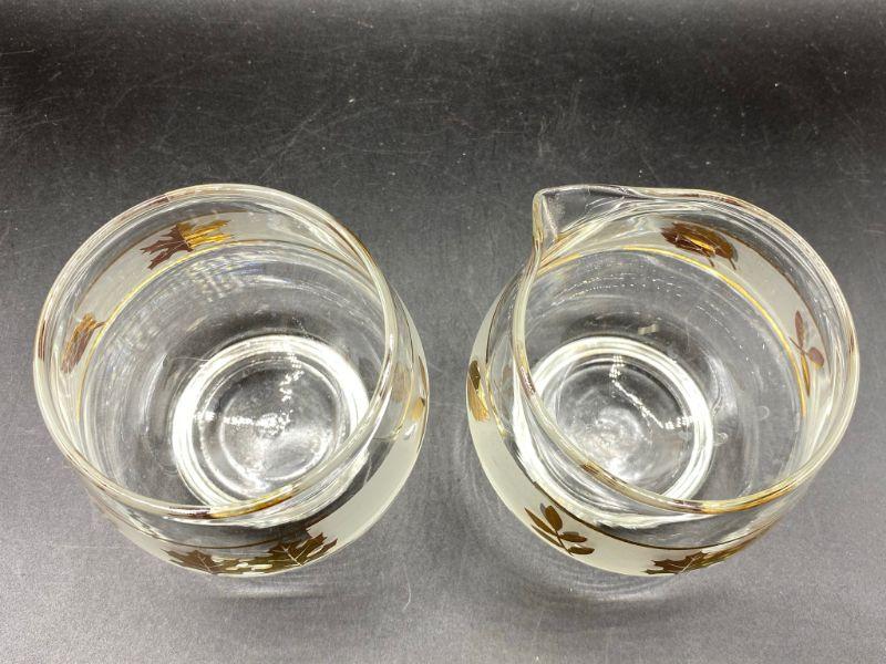 Vintage Libbey Glass cream and sugar set. Mid Century gold leaf pattern. In great condition. Originally the set came with a metal holder for the pair, we did not find the holder. Stand about 3".