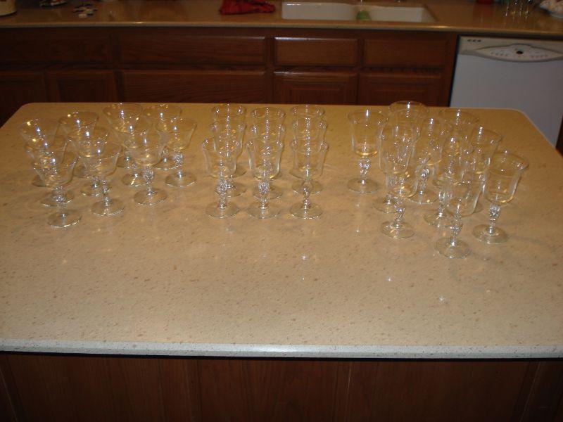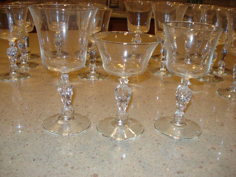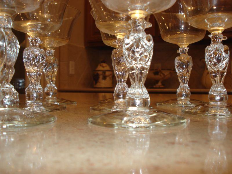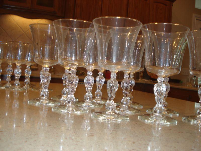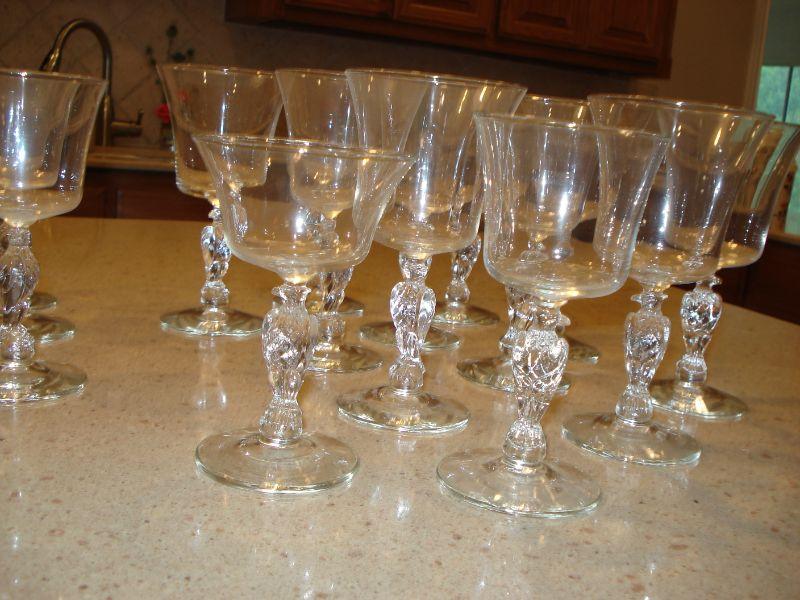 Have the most unusual wine, water, champagne or Juice glasses in town! Eagles on the stems of these fun glasses. 10 tall stems at 7" tall, 9 glasses at 6 1/2", and 11 at 5 1/2" for a total of 30! I see no damage, chips of any kind. GREAT ITEMS FOR JULY THE 4TH PARTY!!