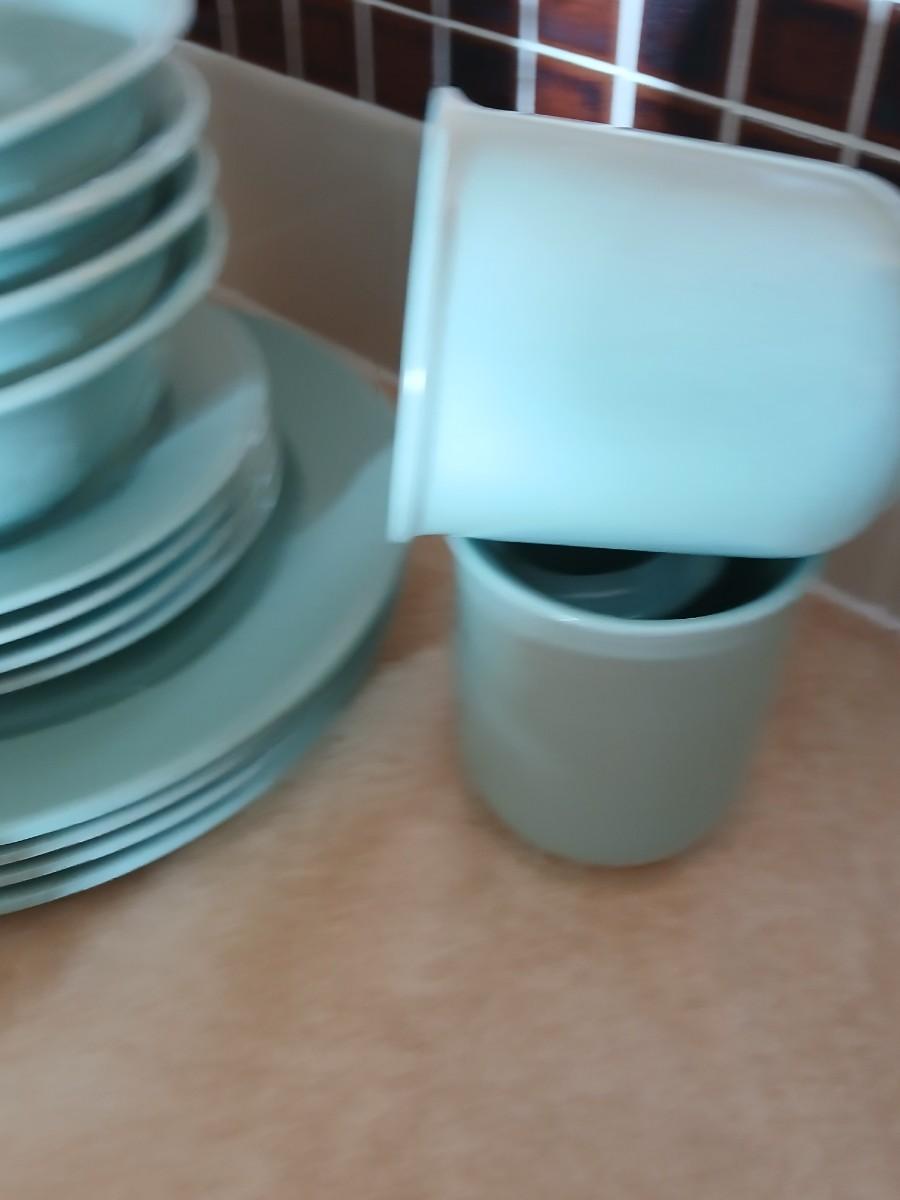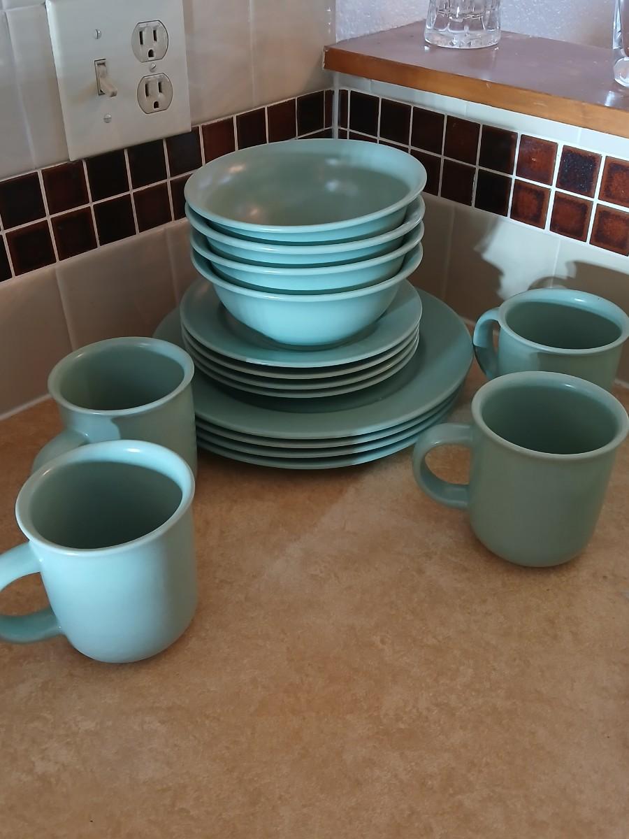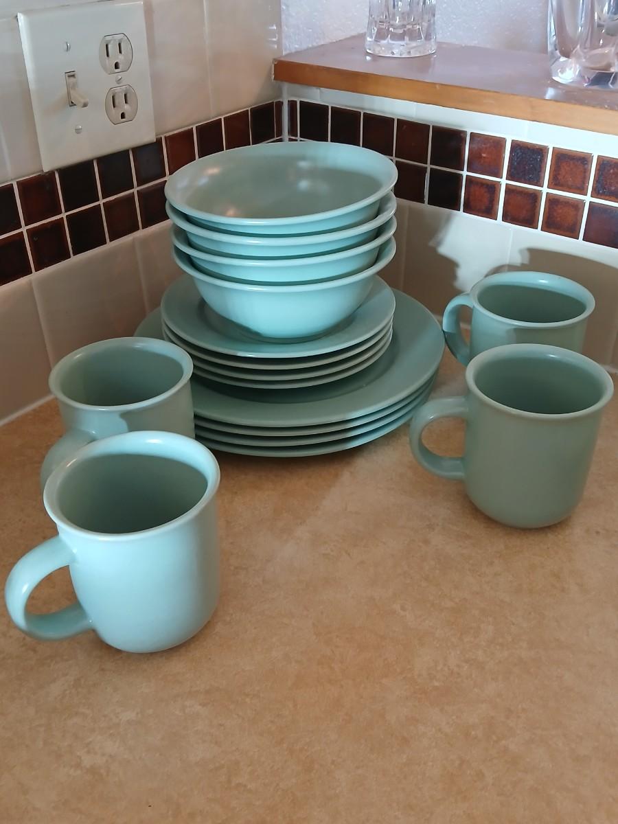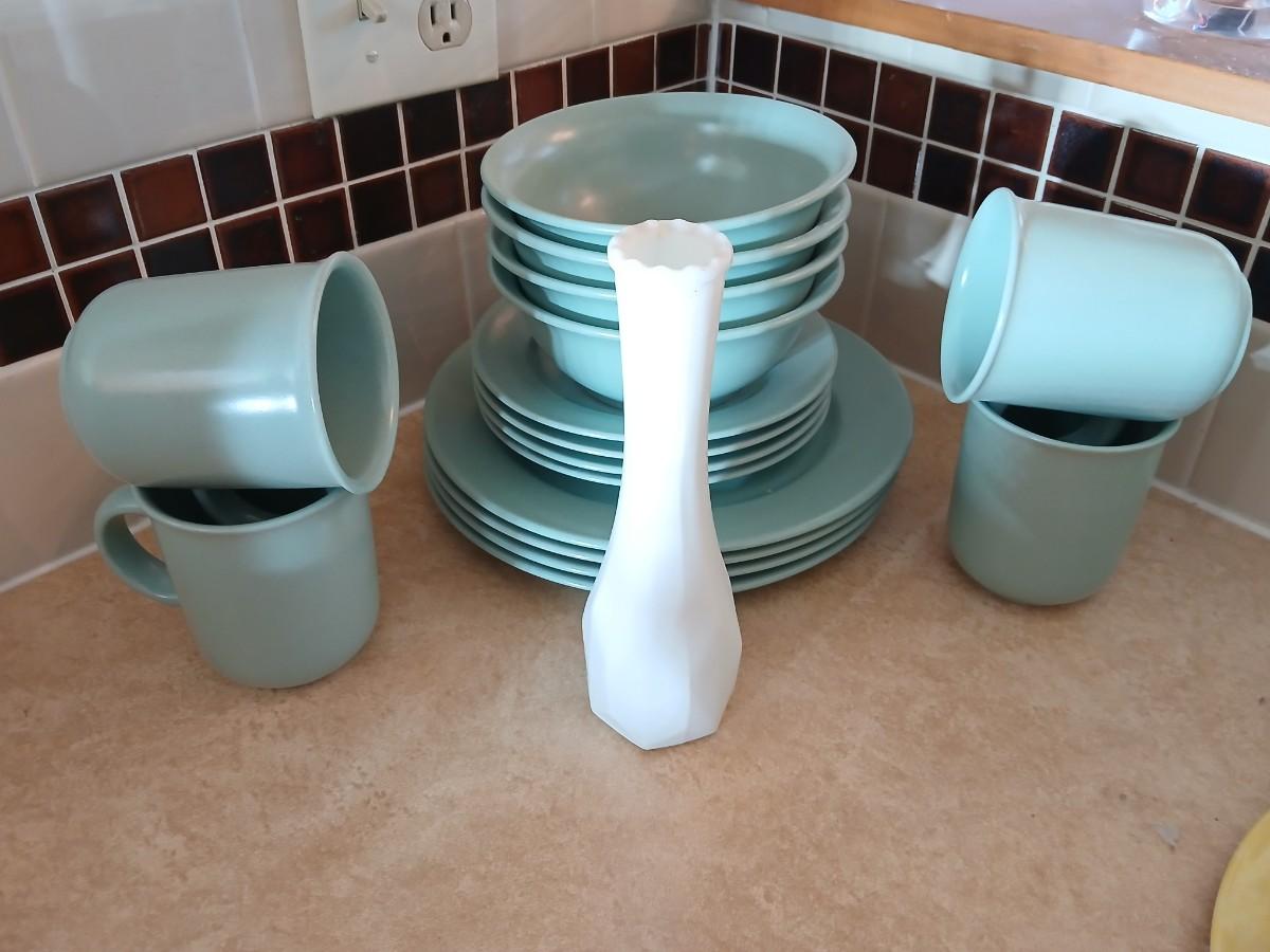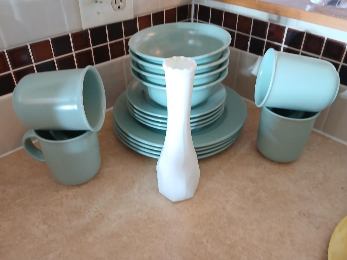 Libbey light blue stoneware like dinner set 16-pieces with white milk glass vase