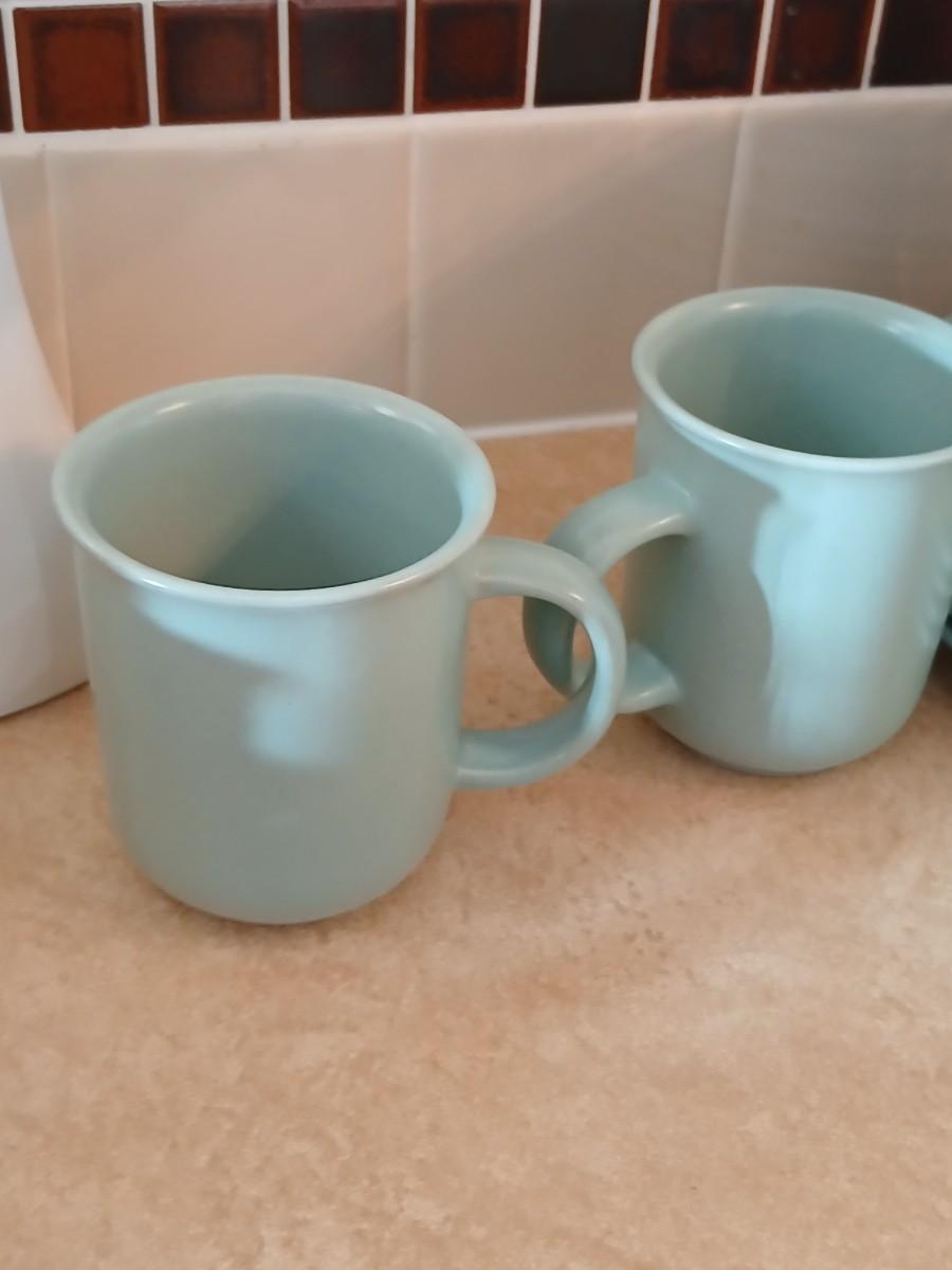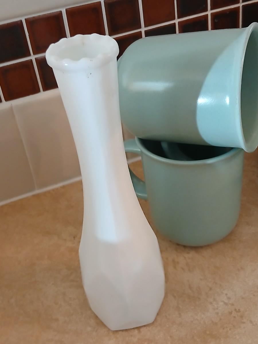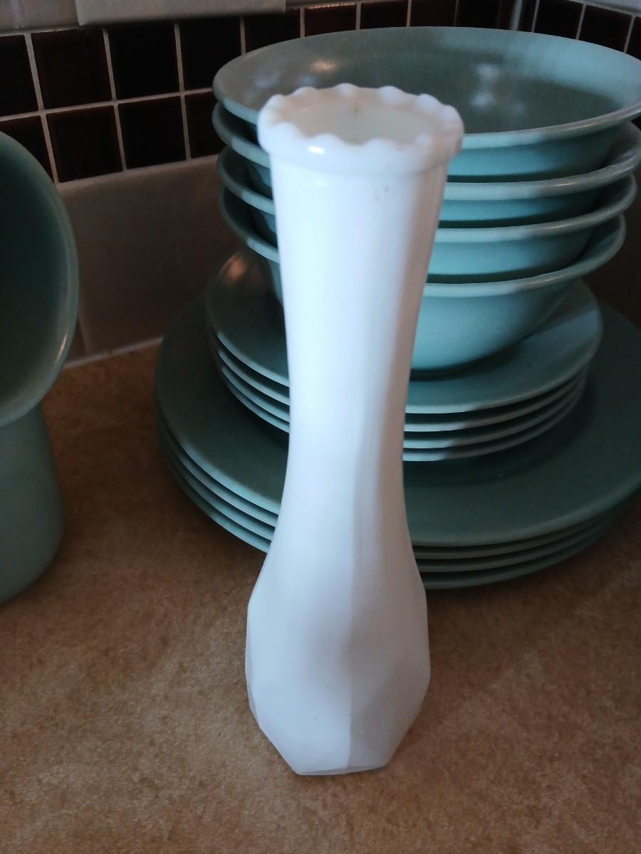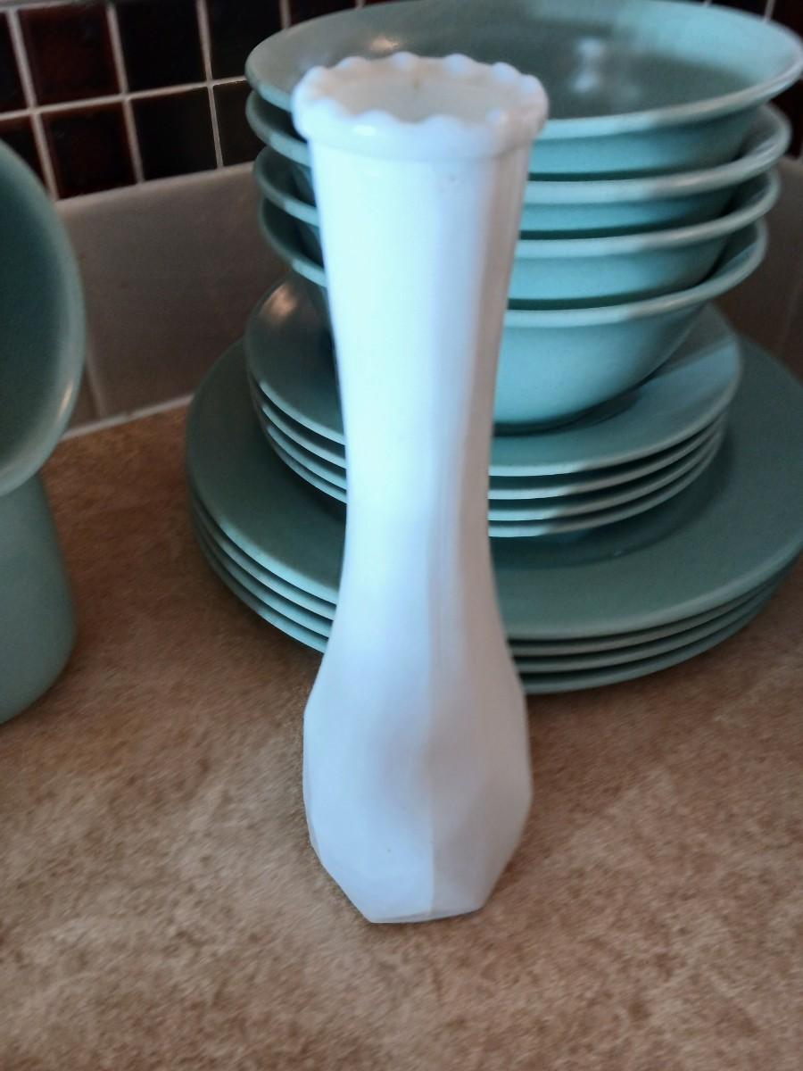Libbey light blue stoneware like dinner set with white milk glass vase
