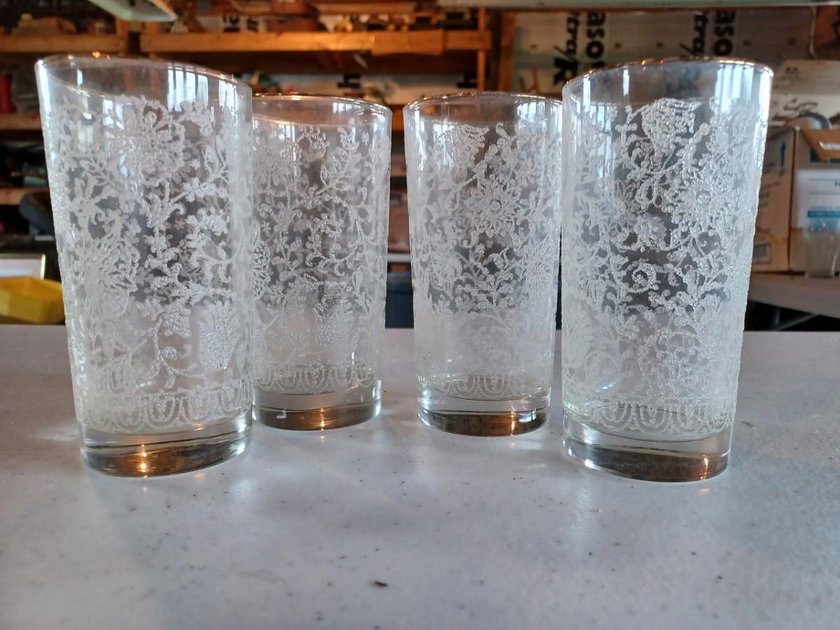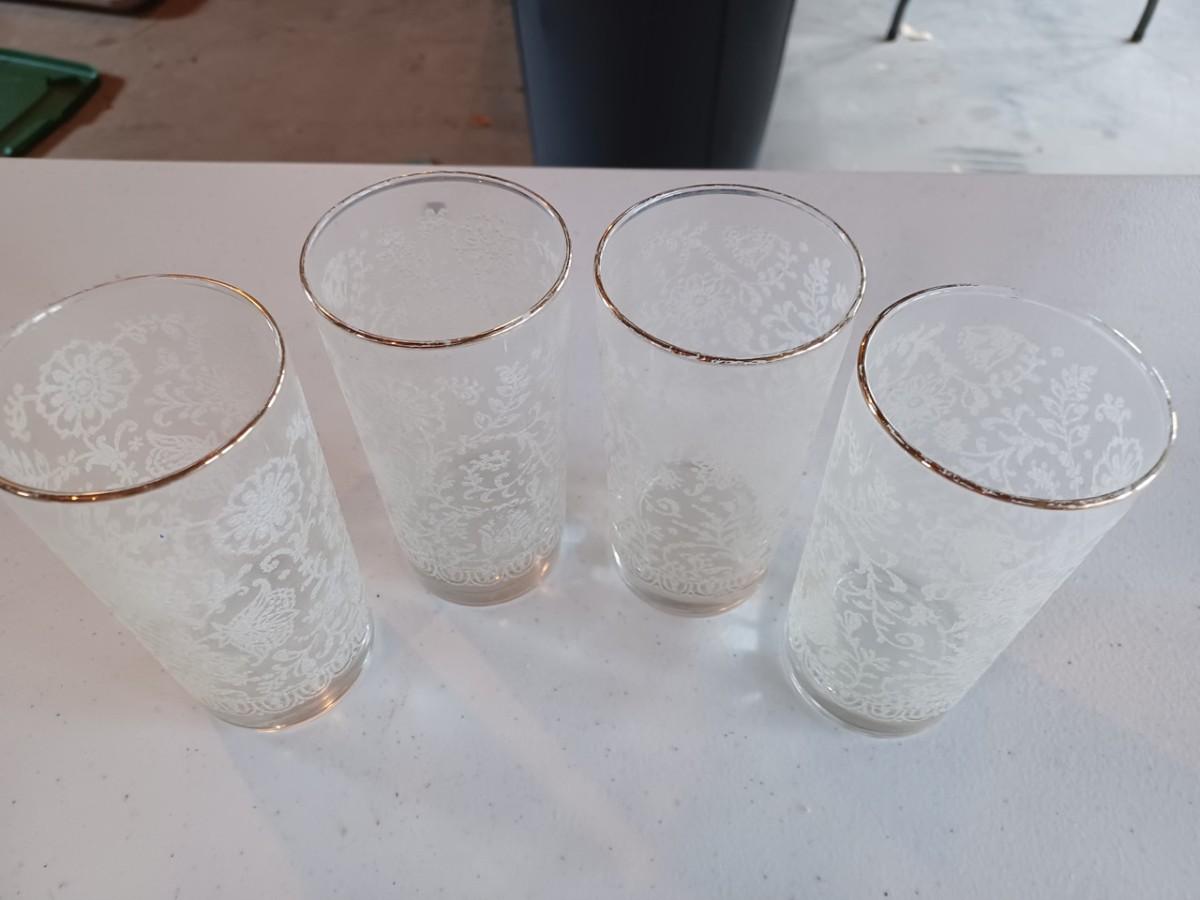 4 Vintage White Embossed Floral Libbey Tumbler/Drinking Glass, White Raised/Frosted Design & Gold Rim