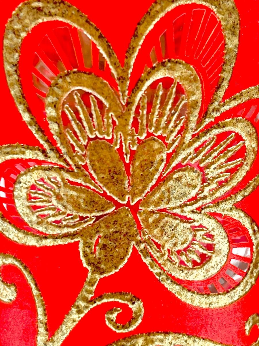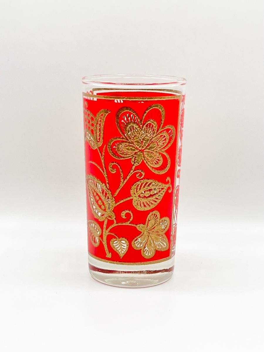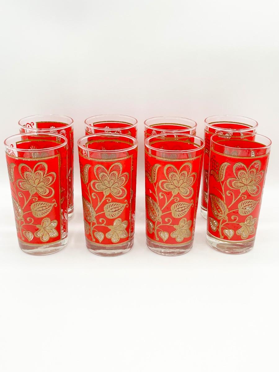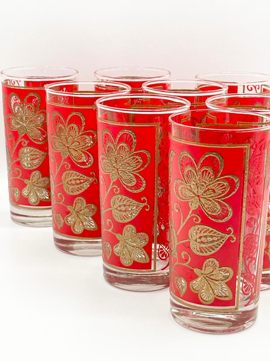 LIBBEY ~ Vtg. Red & Gold Embossed Floral Highballs ~ Set Of Eight (8)