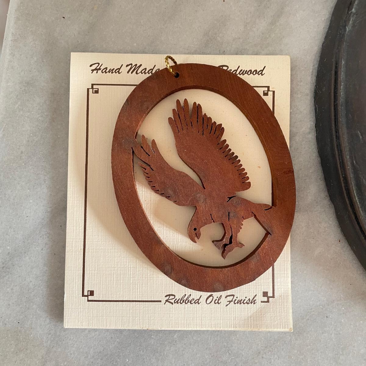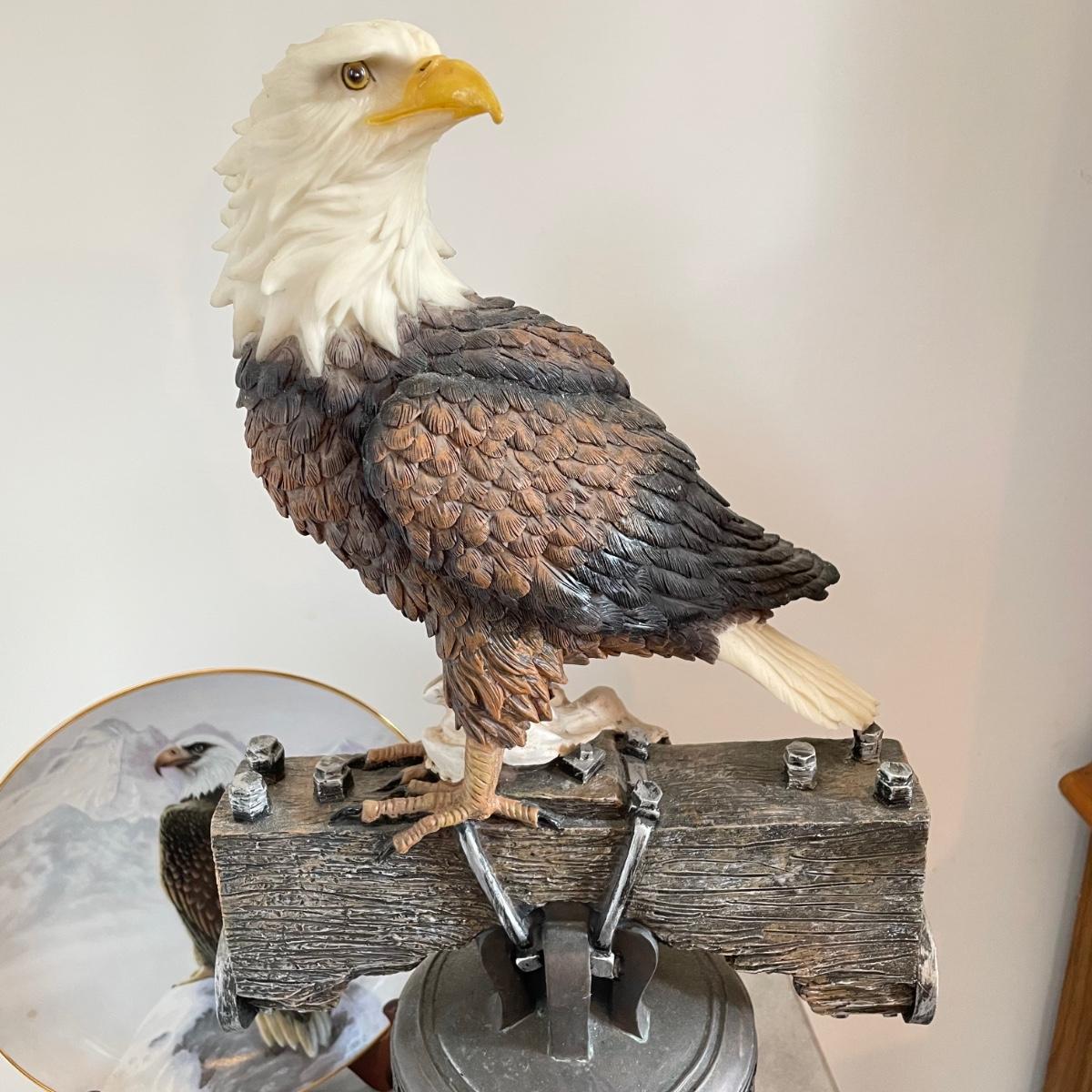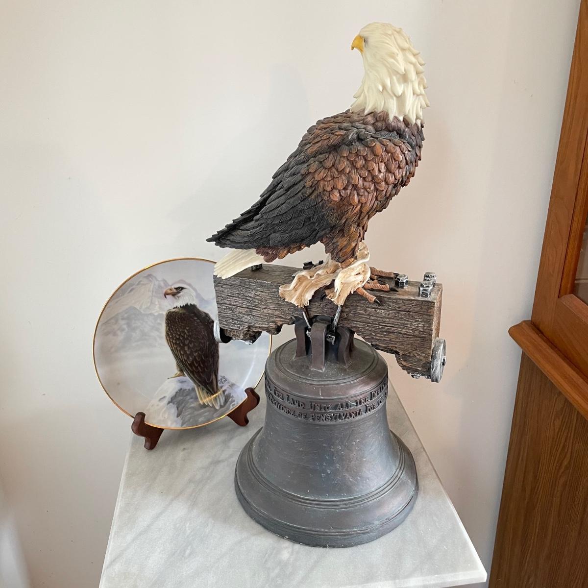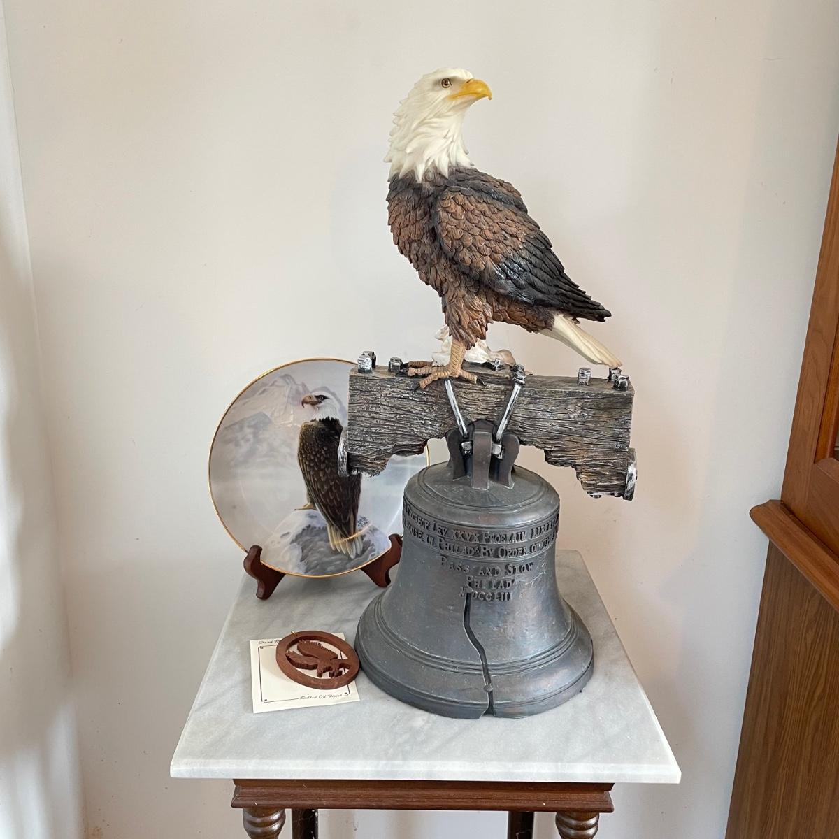 A bald Eagle perched on top of our Liberty Bell stands 8.25”d x 19". This statuette appears to be made from resin. Next, we have a Perillo “American Bald Eagle” (8.25”) plate with wooden stand and a handmade redwood eagle ornament. See images. Local pick up only.