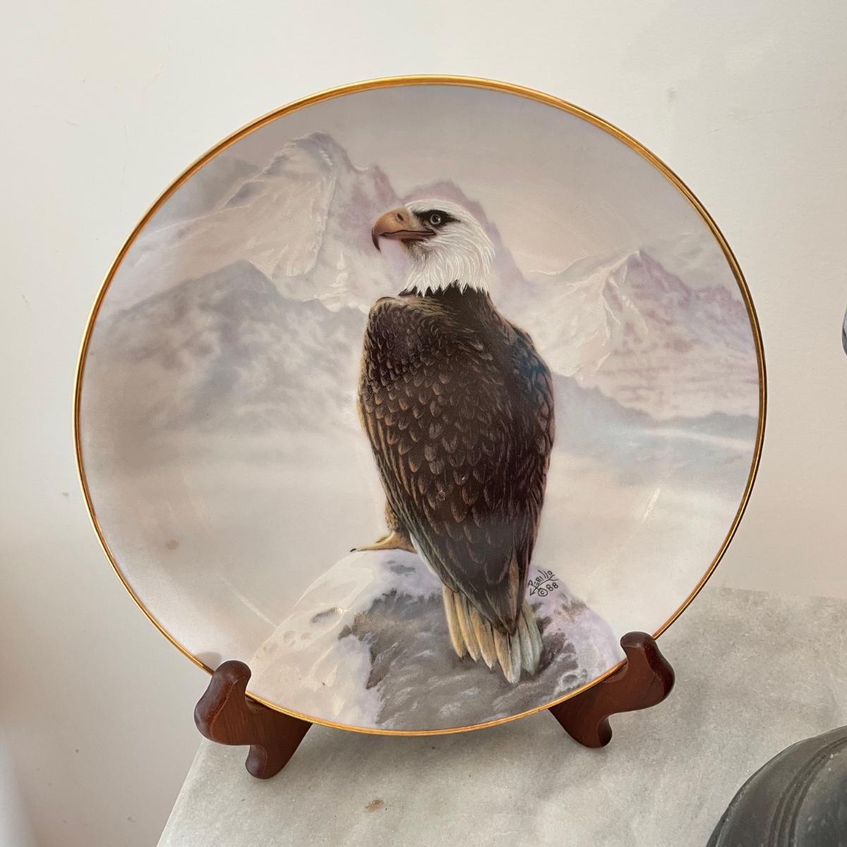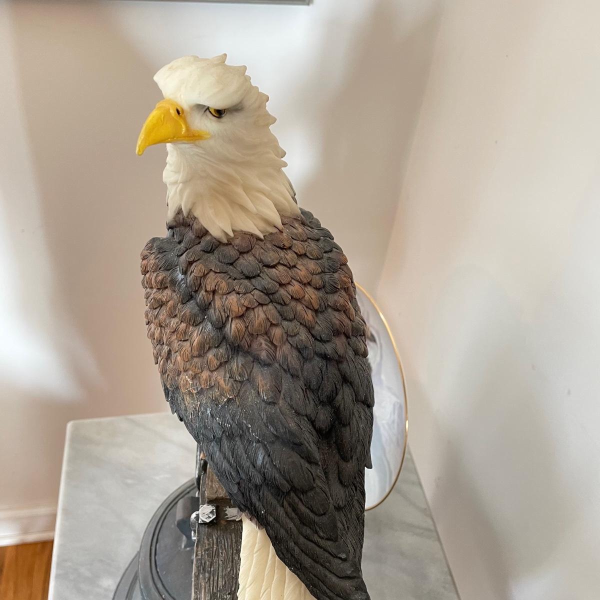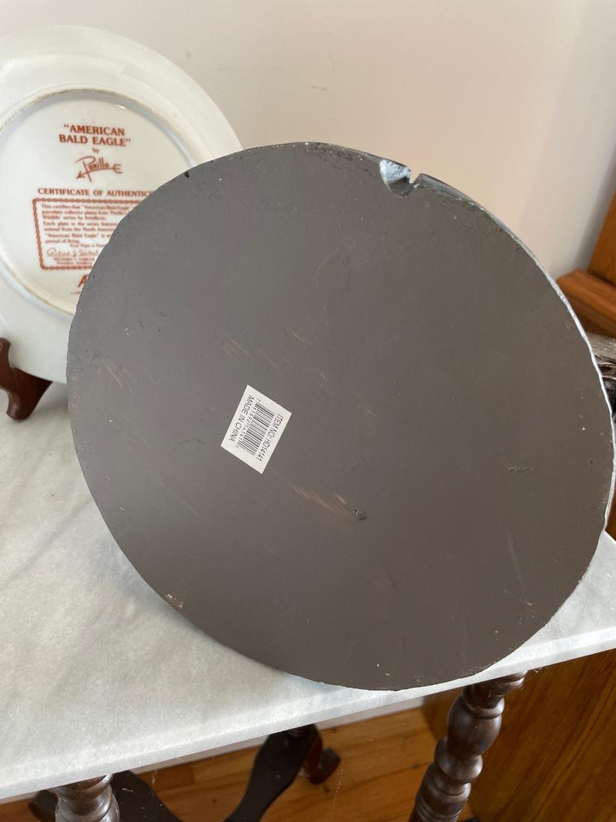 A bald Eagle perched on top of our Liberty Bell stands 8.25”d x 19". This statuette appears to be made from resin. Next, we have a Perillo “American Bald Eagle” (8.25”) plate with wooden stand and a handmade redwood eagle ornament. See images. Local pick up only.