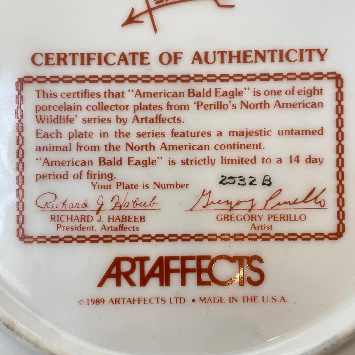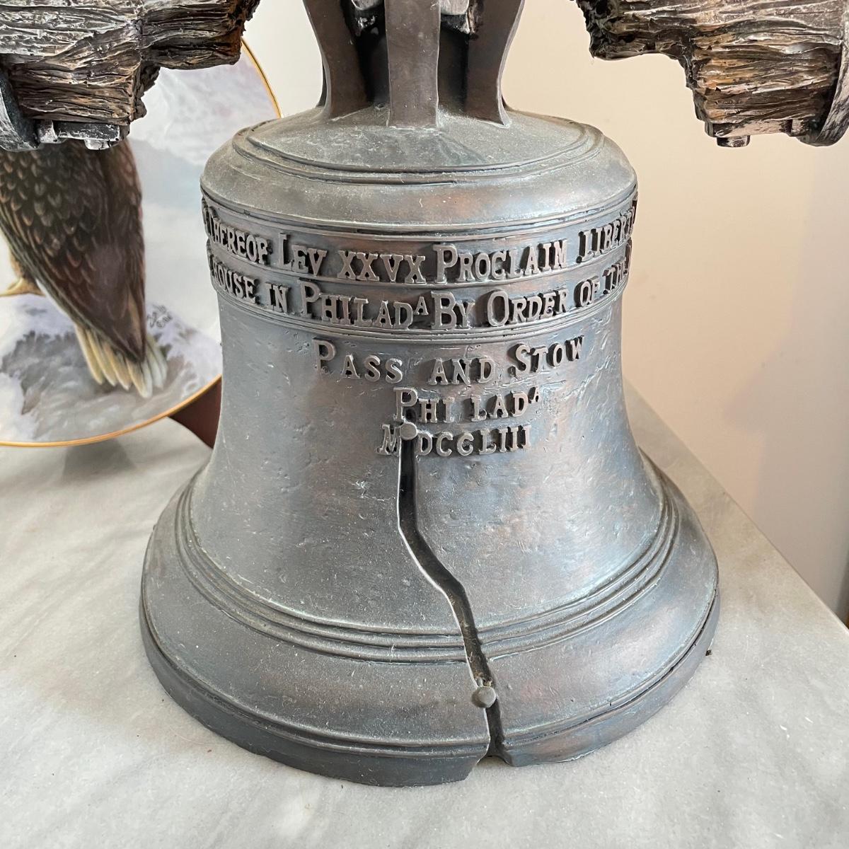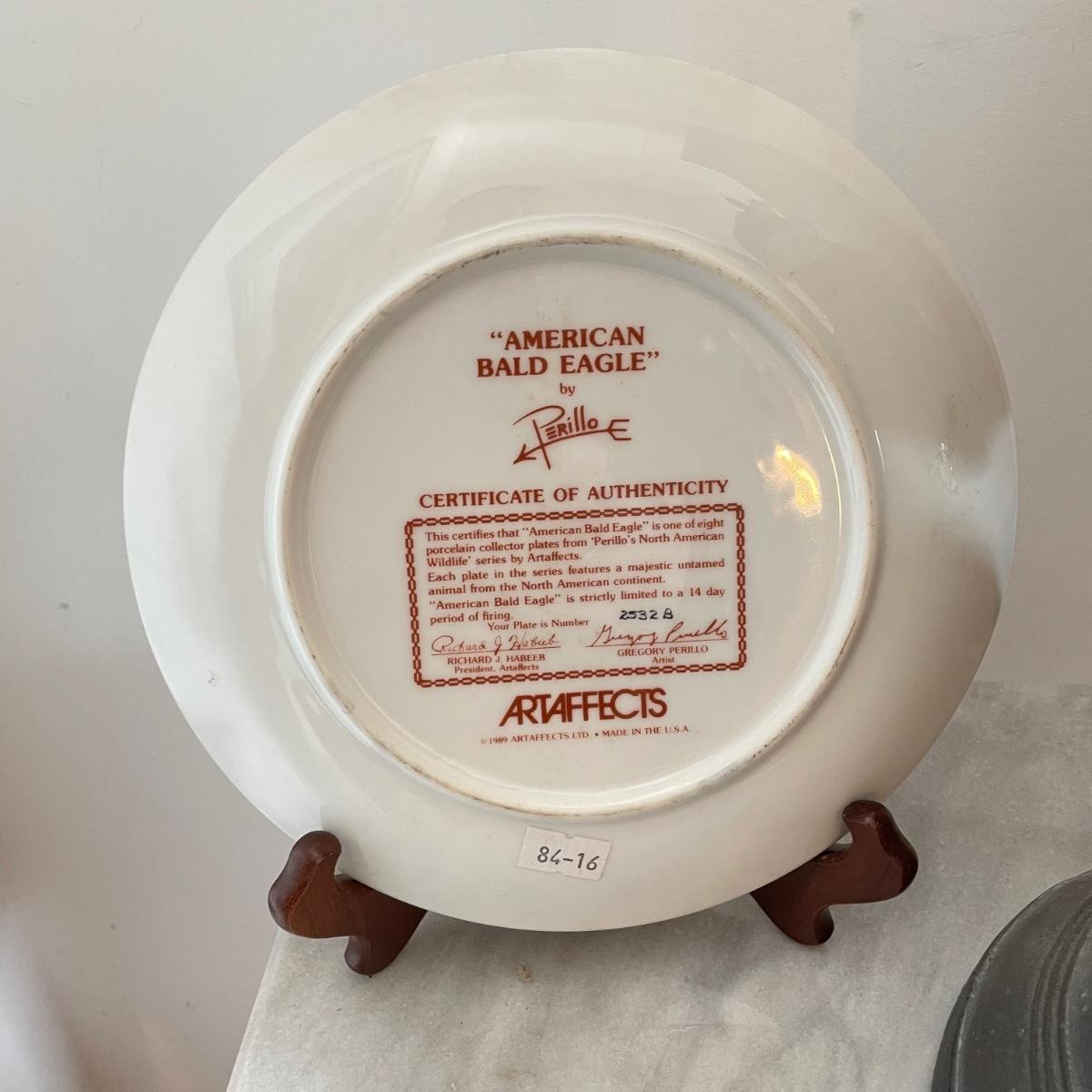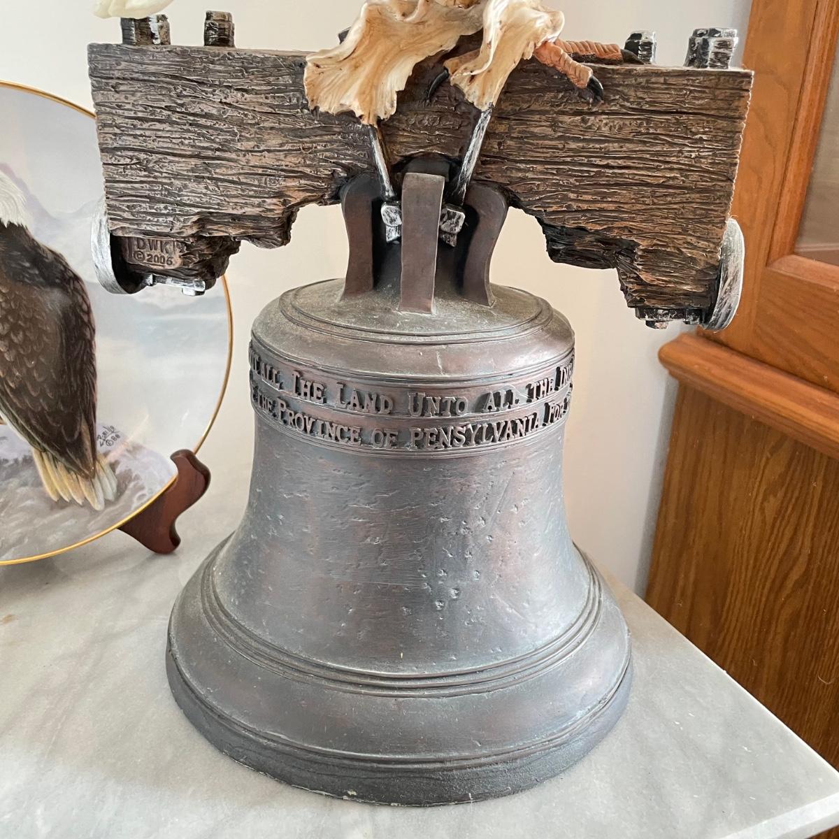 A bald Eagle perched on top of our Liberty Bell stands 8.25”d x 19". This statuette appears to be made from resin. Next, we have a Perillo “American Bald Eagle” (8.25”) plate with wooden stand and a handmade redwood eagle ornament. See images. Local pick up only.