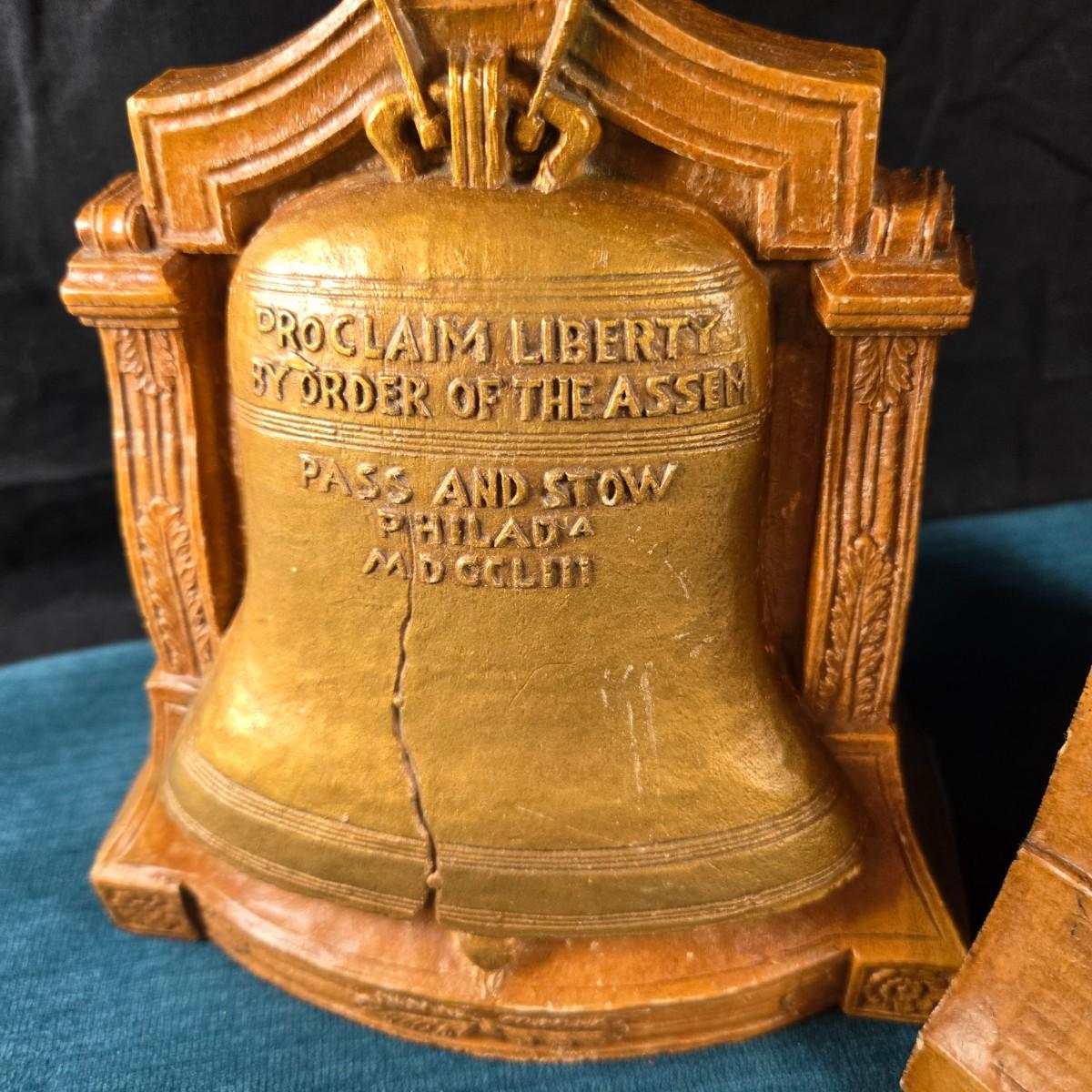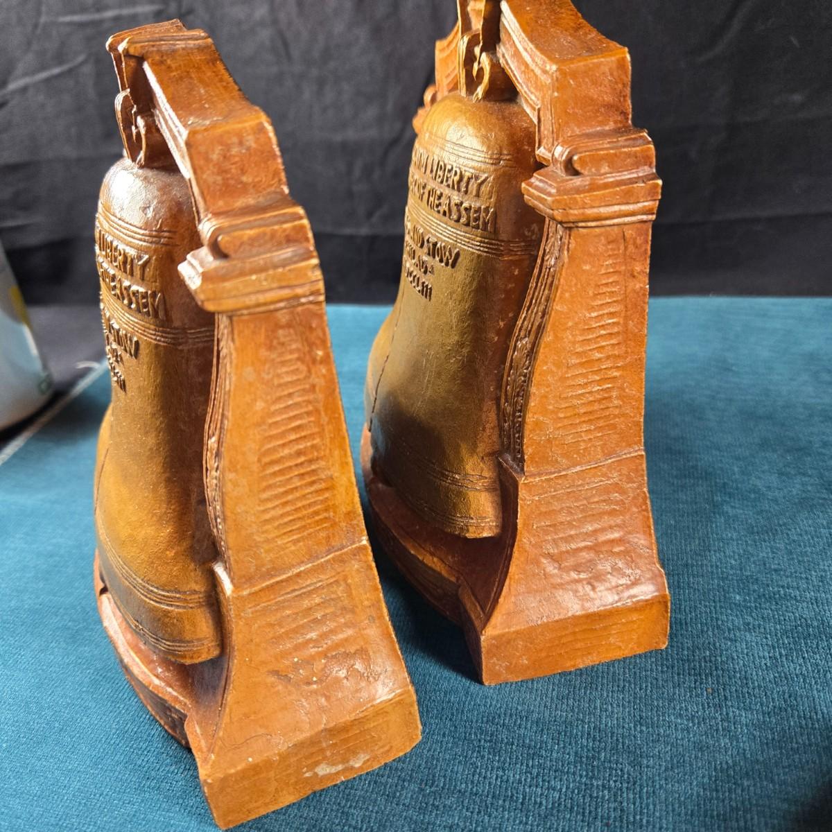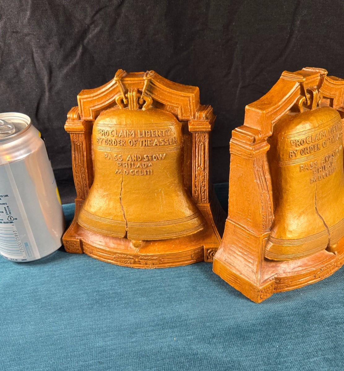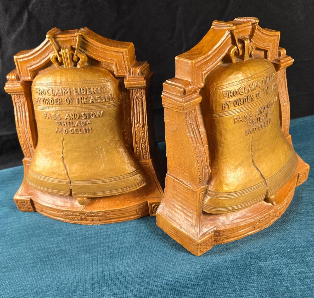 This auction lot is for a set of vintage Liberty Bell Bookends. Looks to be made of resin and are very heavy - perfect to hold up books. They are about 6-inches tall x 6-inches wide.