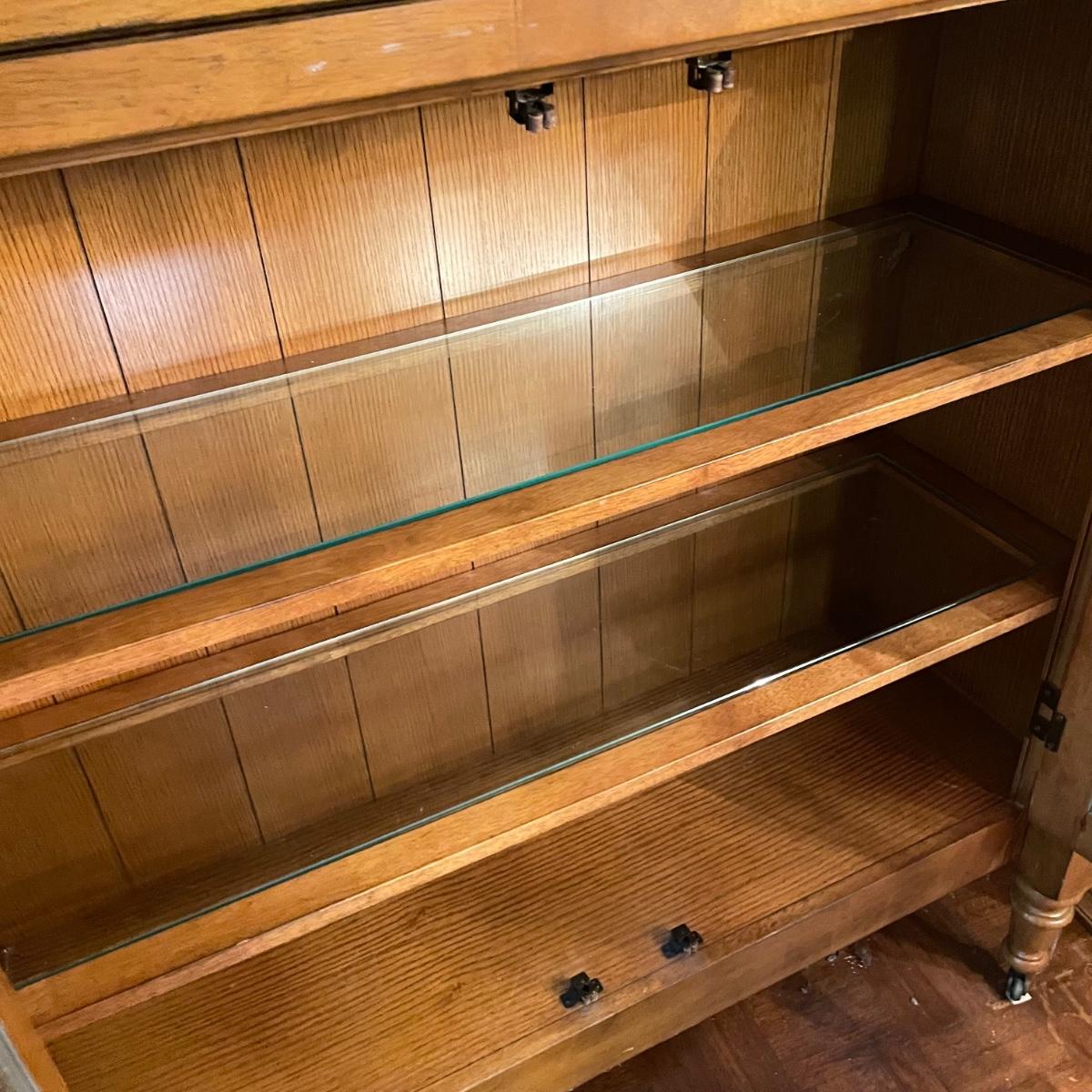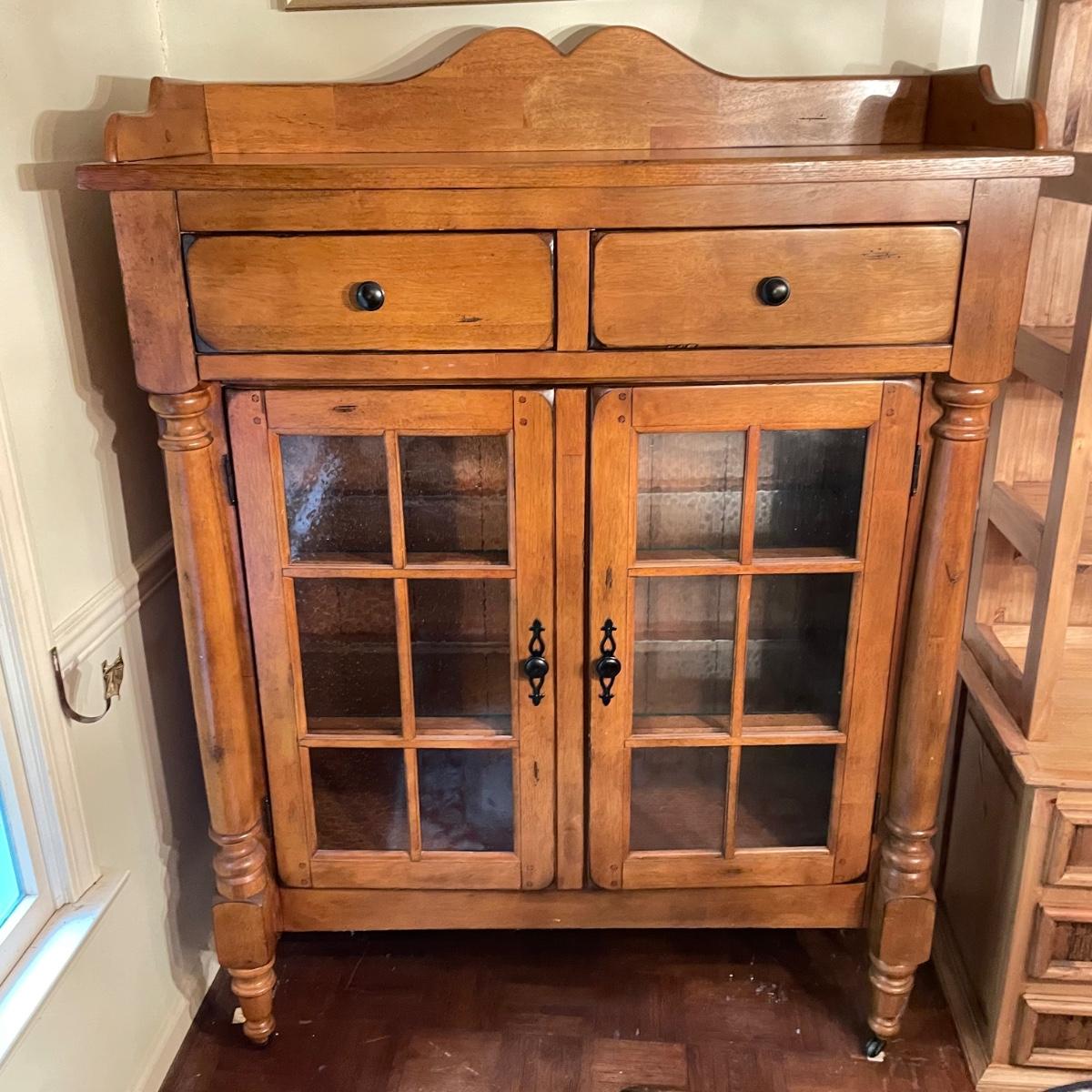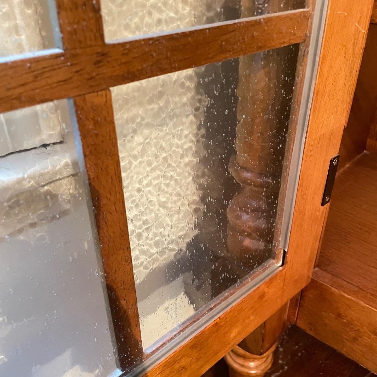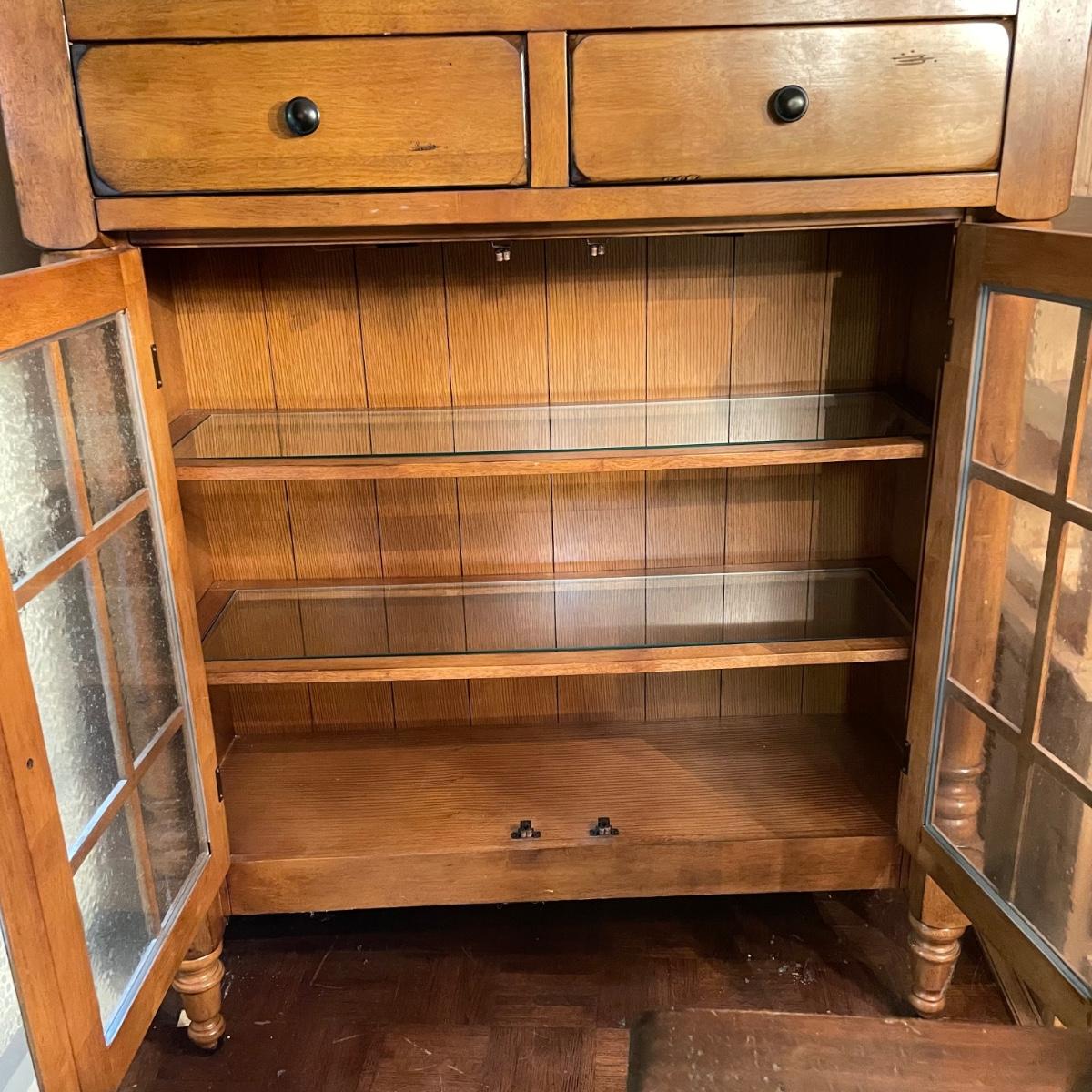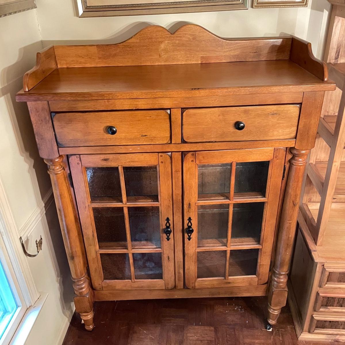 Stunning Liberty Furniture hutch with bubble glass doors and two drawers on casters. Doors and drawers have metal pulls. Hutch has light sockets, they did not turn on when prompted, it is possible the bulbs are burnt out. Hutch rolls, but lubricant on casters may help it roll smoother. Piece appears to be mostly solid wood, it measures 48” x 18” x 65.5”H. There is a decently sized indentation on the back side, see image. Winning bidder must bring assistance to help move and load this item due to its weight and/or size. Local pick up only. Pick Up Thursday only.