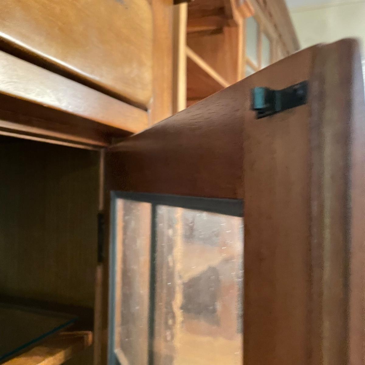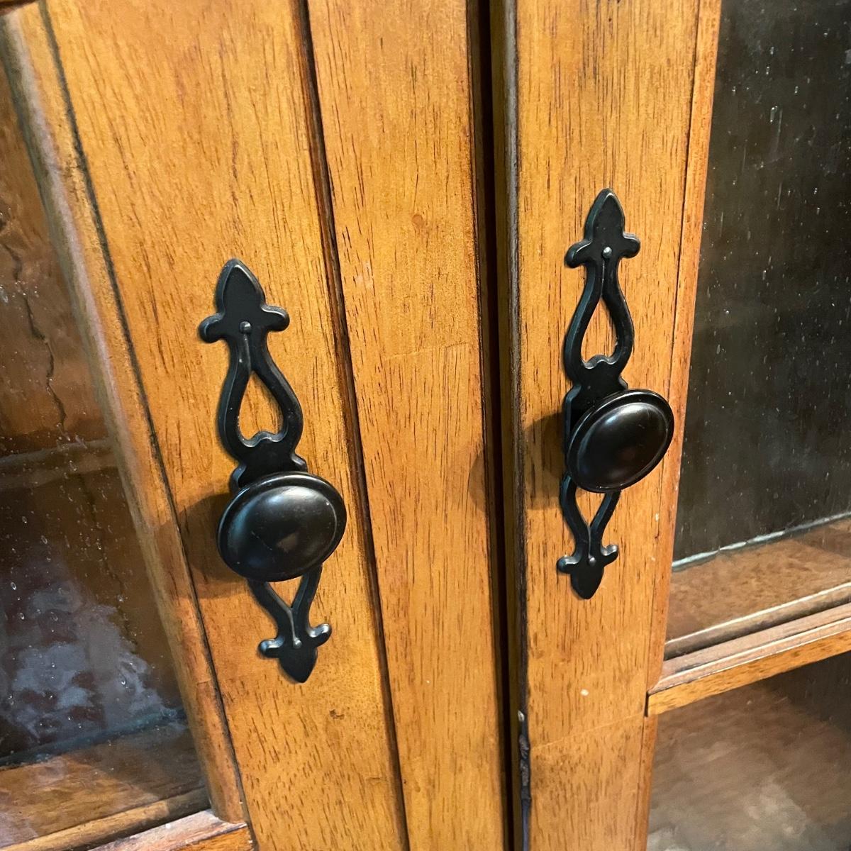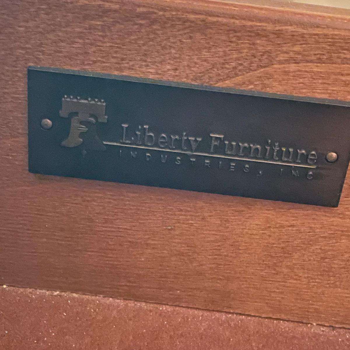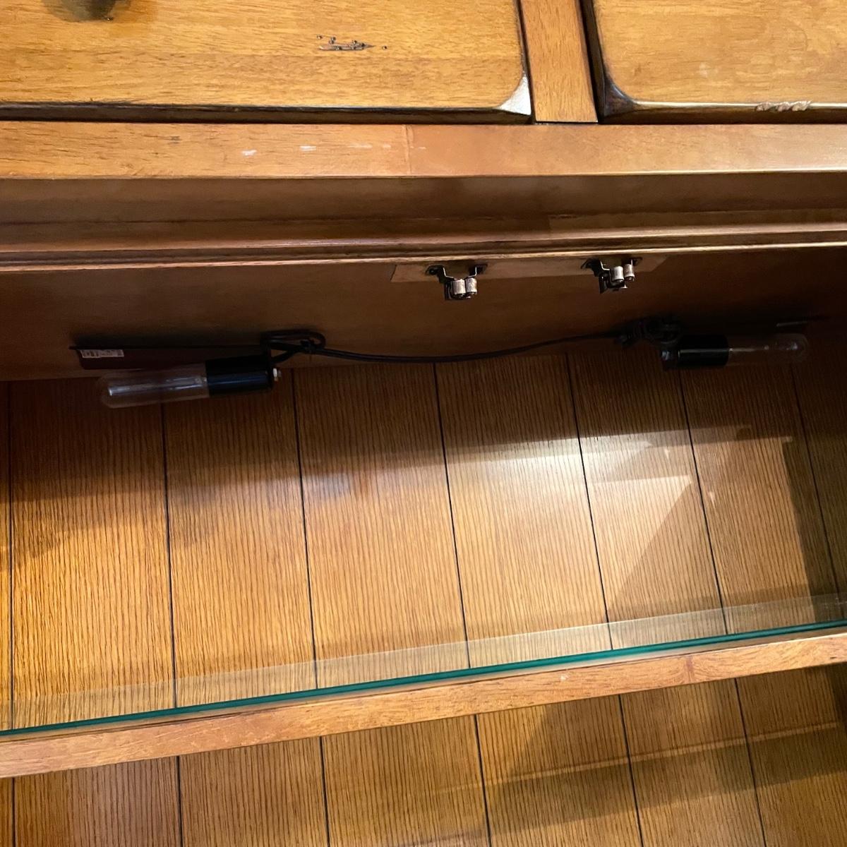 Stunning Liberty Furniture hutch with bubble glass doors and two drawers on casters. Doors and drawers have metal pulls. Hutch has light sockets, they did not turn on when prompted, it is possible the bulbs are burnt out. Hutch rolls, but lubricant on casters may help it roll smoother. Piece appears to be mostly solid wood, it measures 48” x 18” x 65.5”H. There is a decently sized indentation on the back side, see image. Winning bidder must bring assistance to help move and load this item due to its weight and/or size. Local pick up only. Pick Up Thursday only.