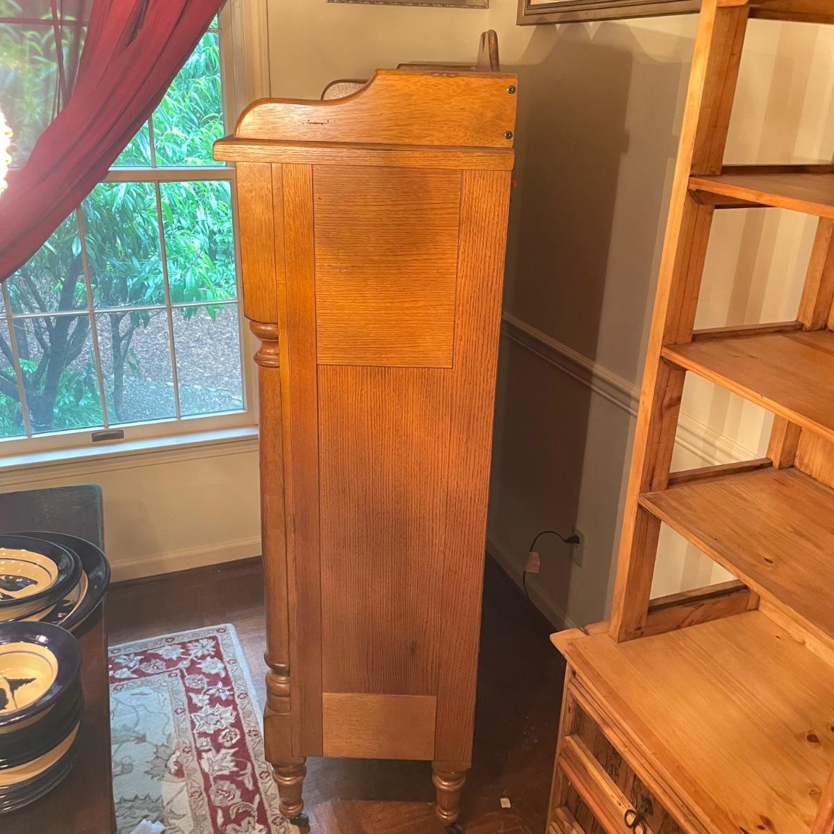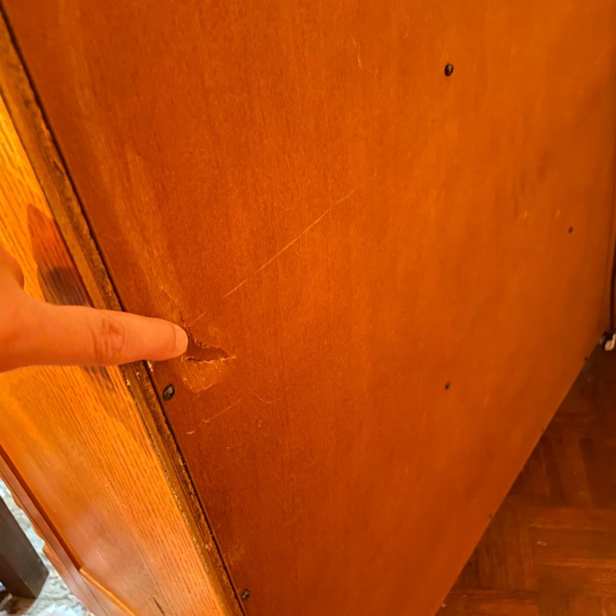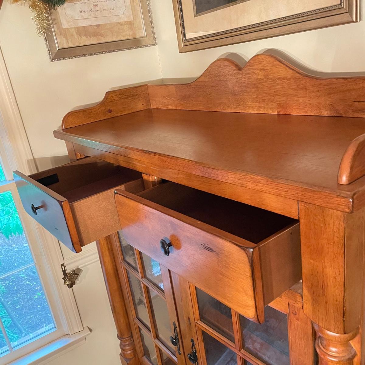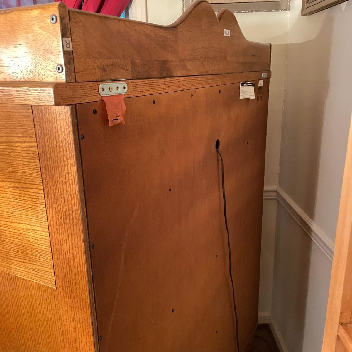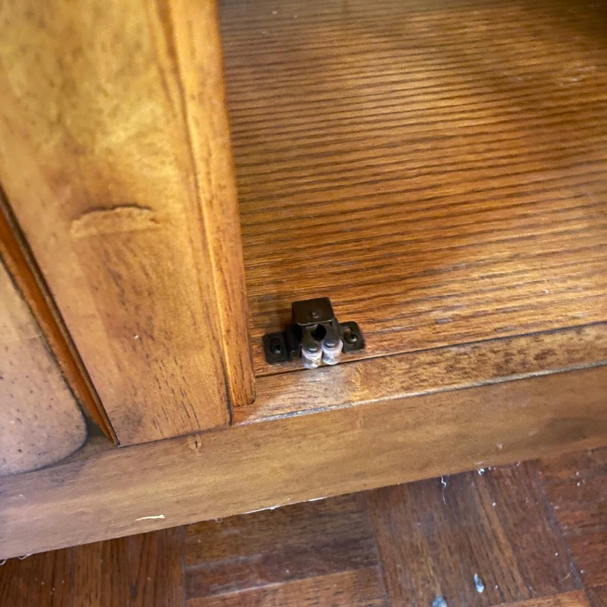 Stunning Liberty Furniture hutch with bubble glass doors and two drawers on casters. Doors and drawers have metal pulls. Hutch has light sockets, they did not turn on when prompted, it is possible the bulbs are burnt out. Hutch rolls, but lubricant on casters may help it roll smoother. Piece appears to be mostly solid wood, it measures 48” x 18” x 65.5”H. There is a decently sized indentation on the back side, see image. Winning bidder must bring assistance to help move and load this item due to its weight and/or size. Local pick up only. Pick Up Thursday only.