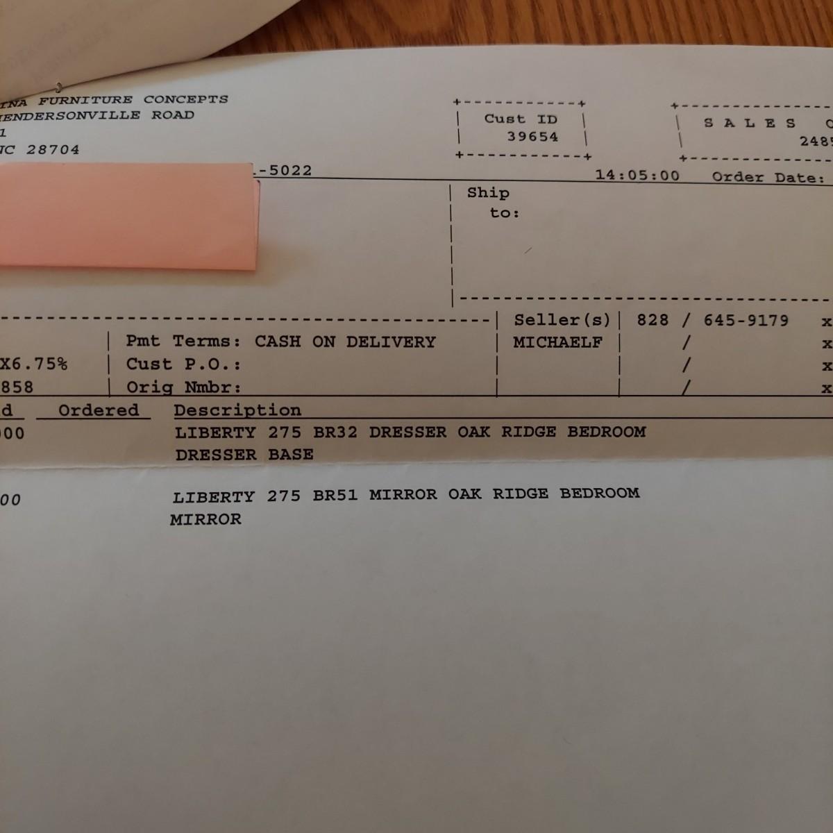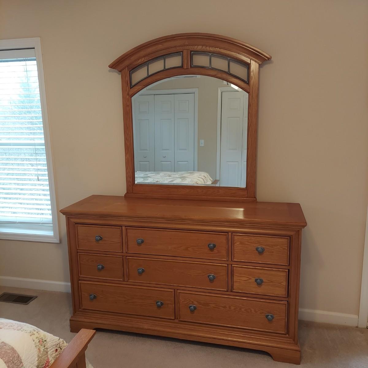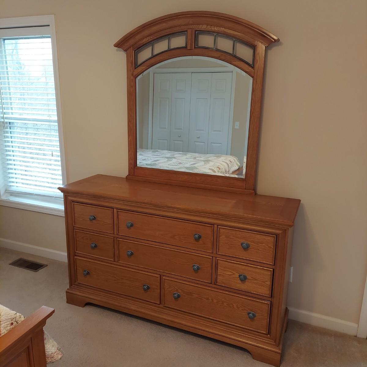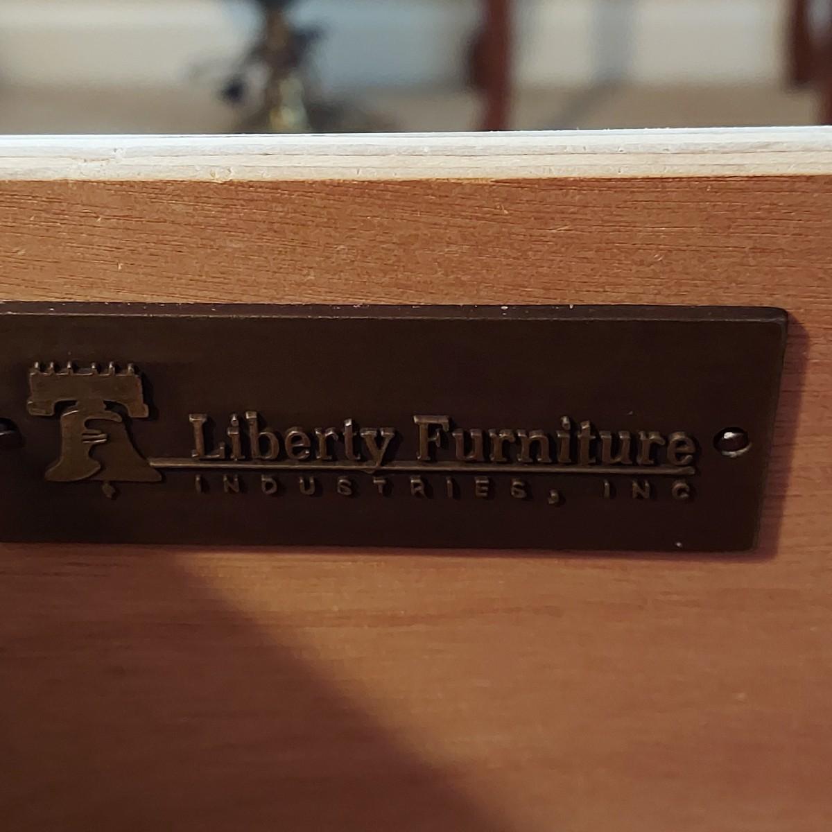 Liberty Furniture Industries Inc brand dresser with mirror in Oak Ridge style. Dresser measures 62” x 18” x 36"H. Mirror measures 44” x 45"H. Mirror is mounted to dresser with hex bolts. Buyer will need to bring the appropriate tools to dismantle. Please see photos for details. There is a matching Queen bed for sale in another lot. The photos of receipts are shown for info. They are not included for buyer. This piece is located on the ground floor. It will need to be moved down the six front steps from the porch to the sidewalk. Local Pickup Only. Winning bidder must bring assistance to help move and load this item due to its weight and/or size.