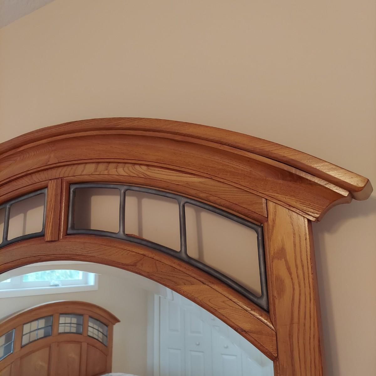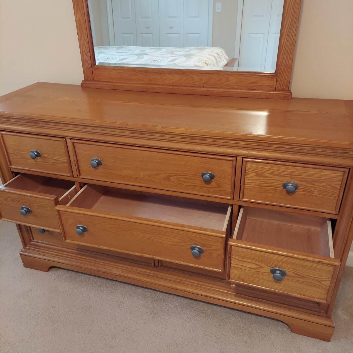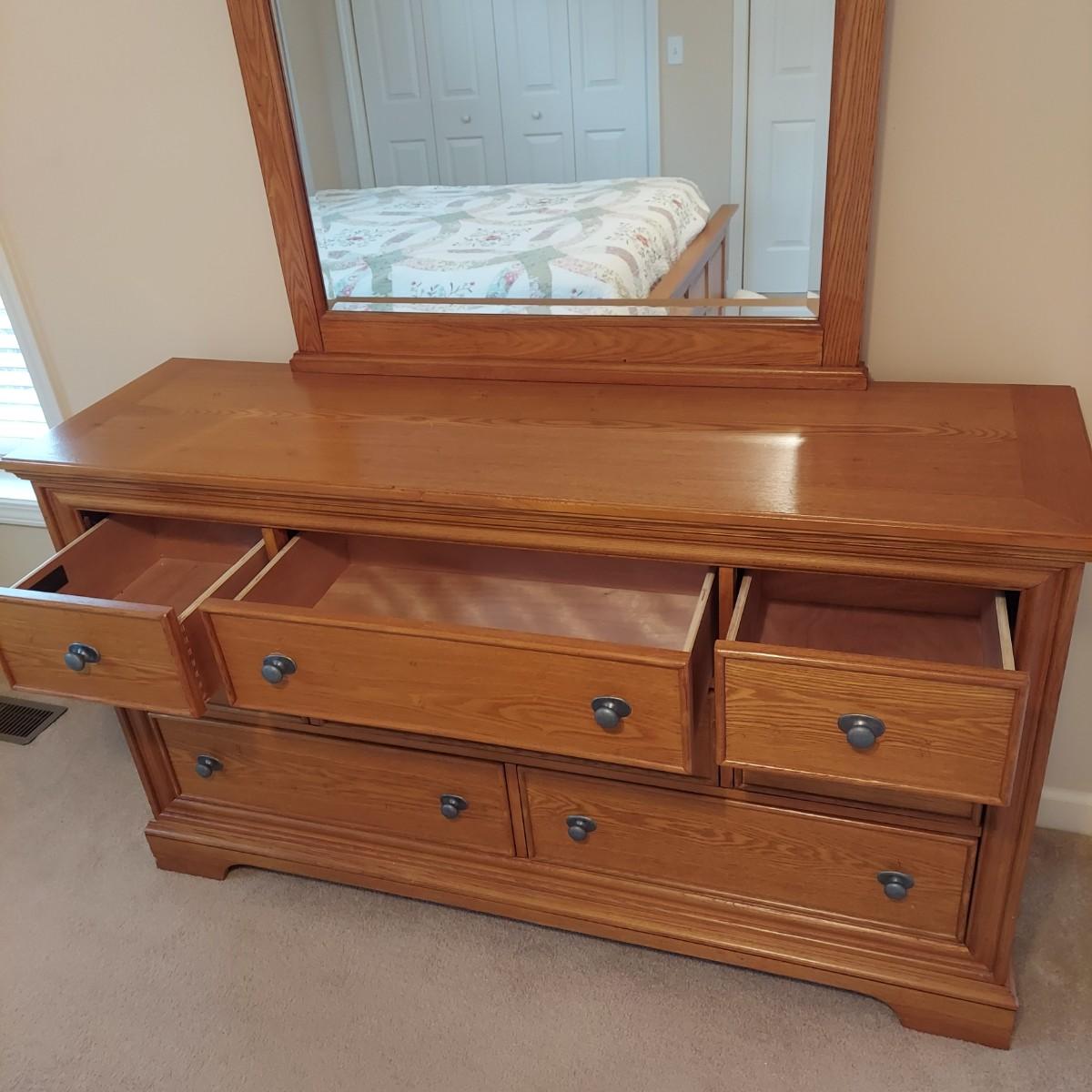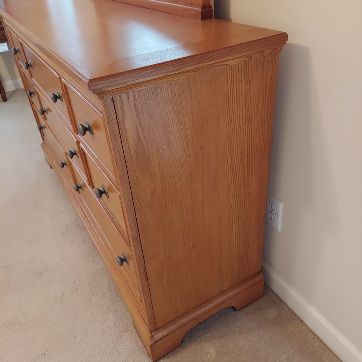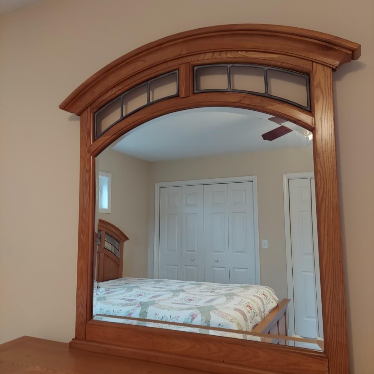 Liberty Furniture Industries Inc brand dresser with mirror in Oak Ridge style. Dresser measures 62” x 18” x 36"H. Mirror measures 44” x 45"H. Mirror is mounted to dresser with hex bolts. Buyer will need to bring the appropriate tools to dismantle. Please see photos for details. There is a matching Queen bed for sale in another lot. The photos of receipts are shown for info. They are not included for buyer. This piece is located on the ground floor. It will need to be moved down the six front steps from the porch to the sidewalk. Local Pickup Only. Winning bidder must bring assistance to help move and load this item due to its weight and/or size.