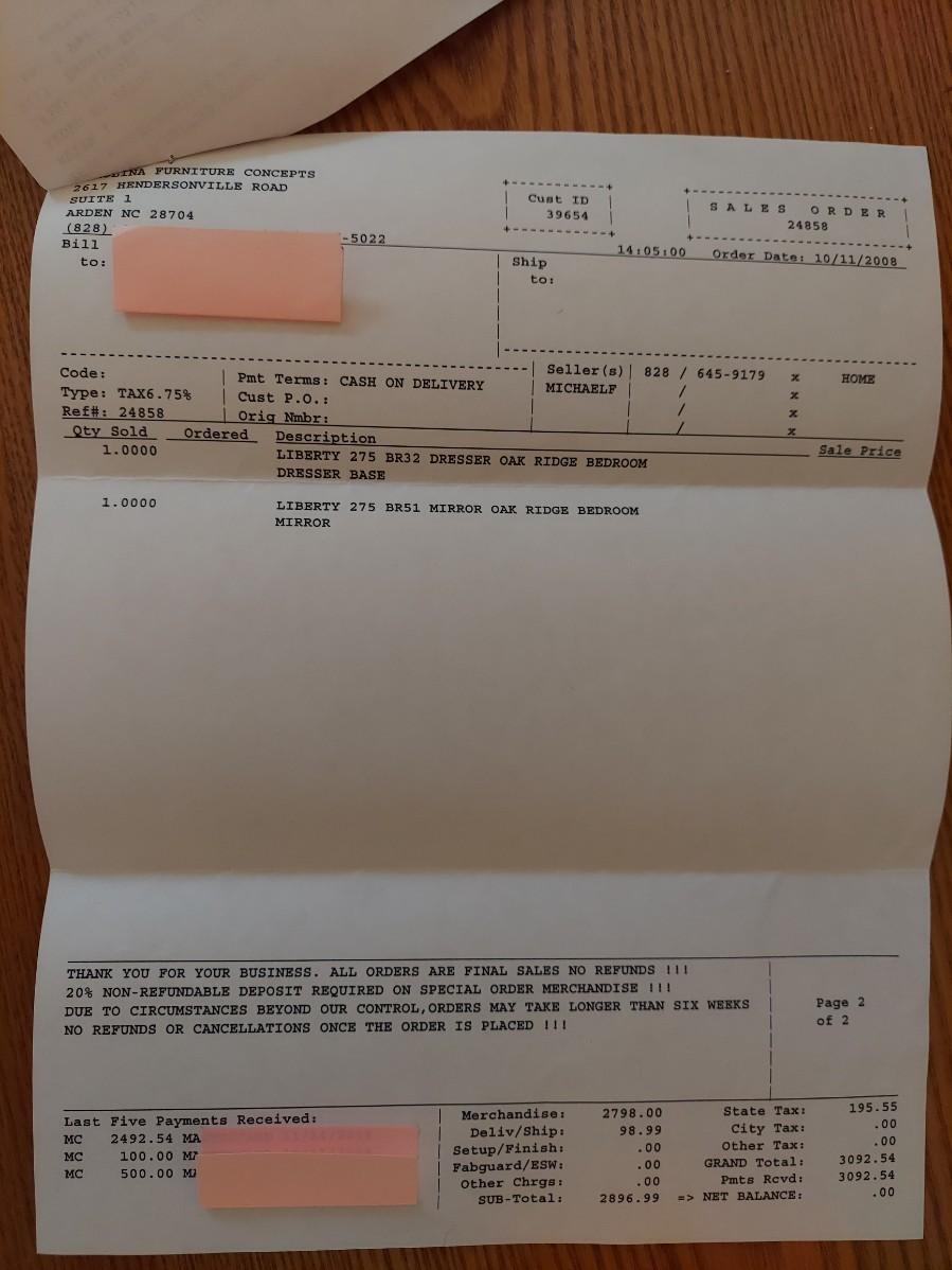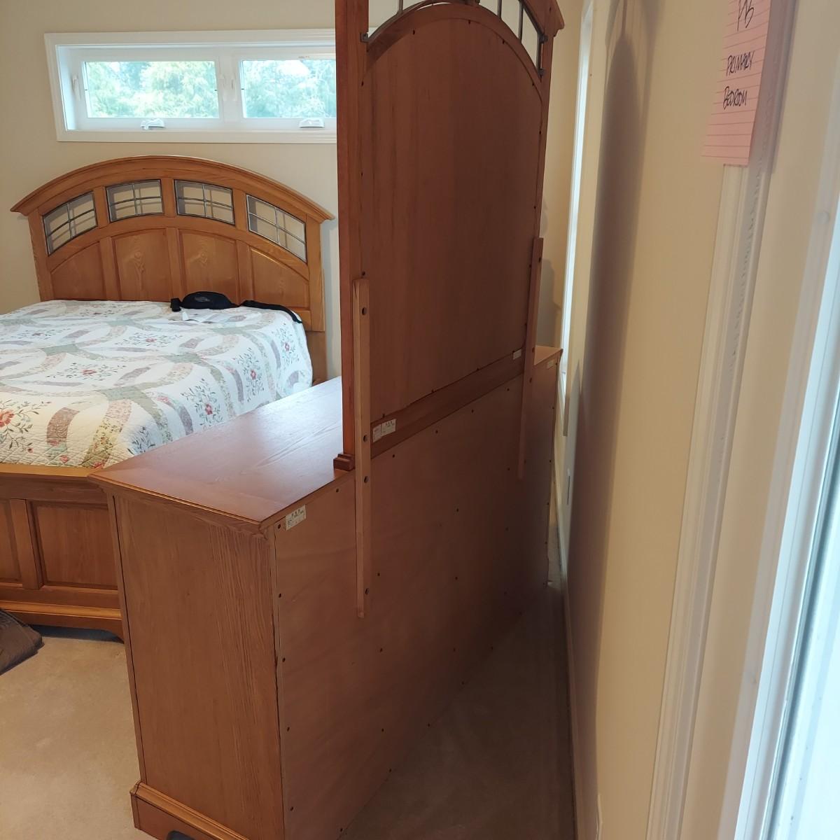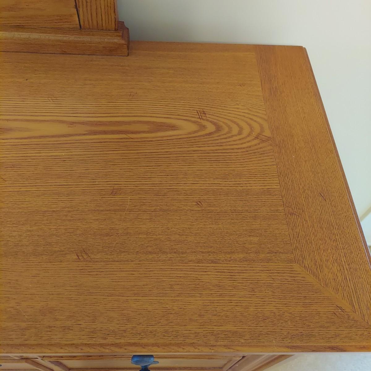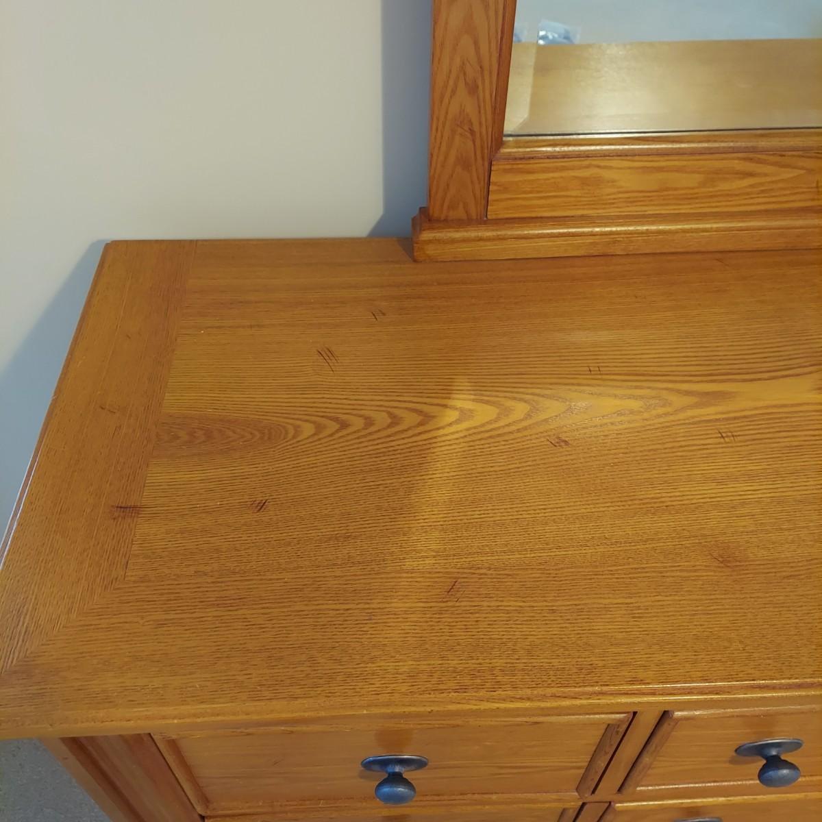 Liberty Furniture Industries Inc brand dresser with mirror in Oak Ridge style. Dresser measures 62” x 18” x 36"H. Mirror measures 44” x 45"H. Mirror is mounted to dresser with hex bolts. Buyer will need to bring the appropriate tools to dismantle. Please see photos for details. There is a matching Queen bed for sale in another lot. The photos of receipts are shown for info. They are not included for buyer. This piece is located on the ground floor. It will need to be moved down the six front steps from the porch to the sidewalk. Local Pickup Only. Winning bidder must bring assistance to help move and load this item due to its weight and/or size.