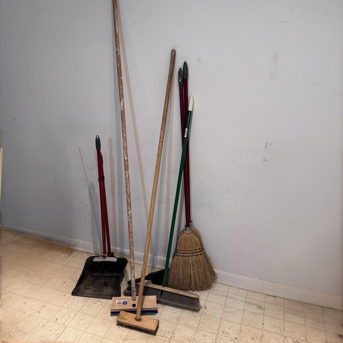 This lot includes five brooms, one smaller duster, and a dust pan with handle. The brooms are from Libman and Quickie, along with some unlabeled brands. The widest broom is the Libman that measures 17” x 50”H. Local pickup only.