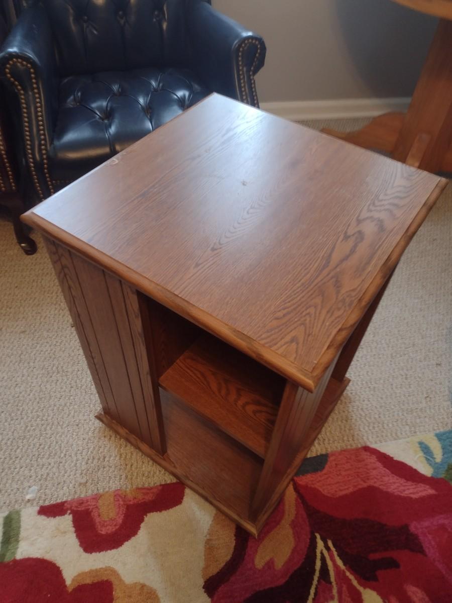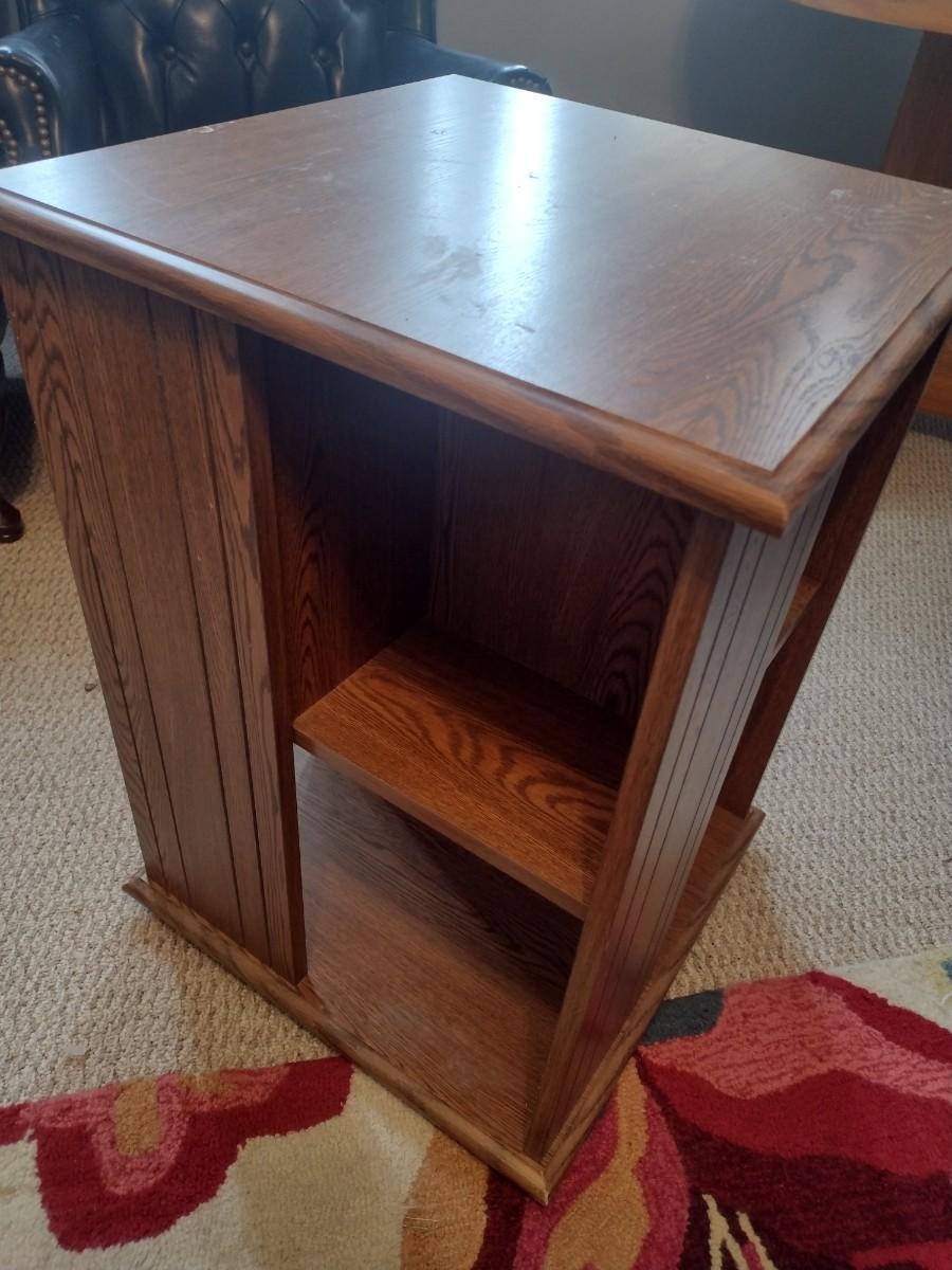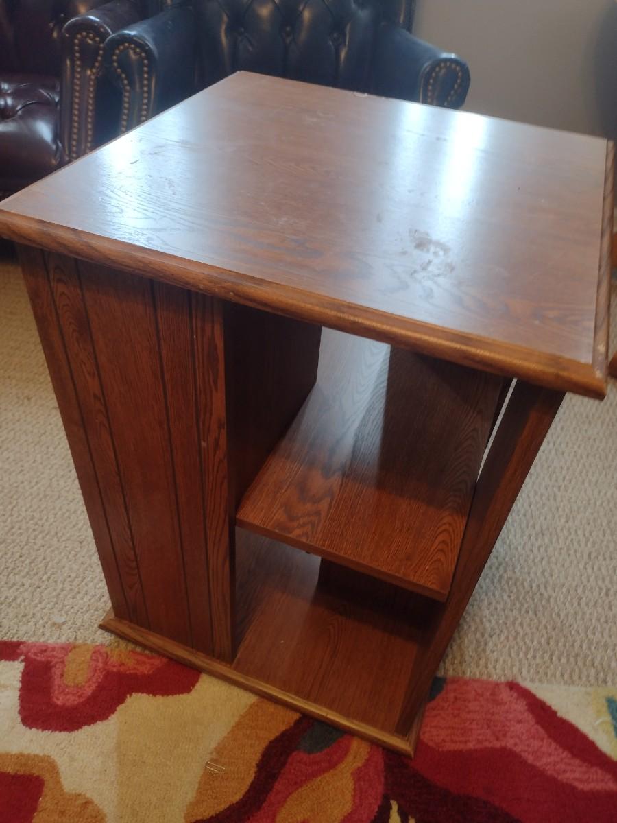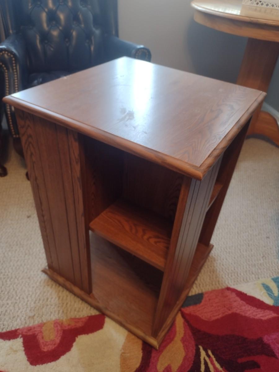 Library Book Spin Stand Laminate Wood Finish. See photos for condition issues.