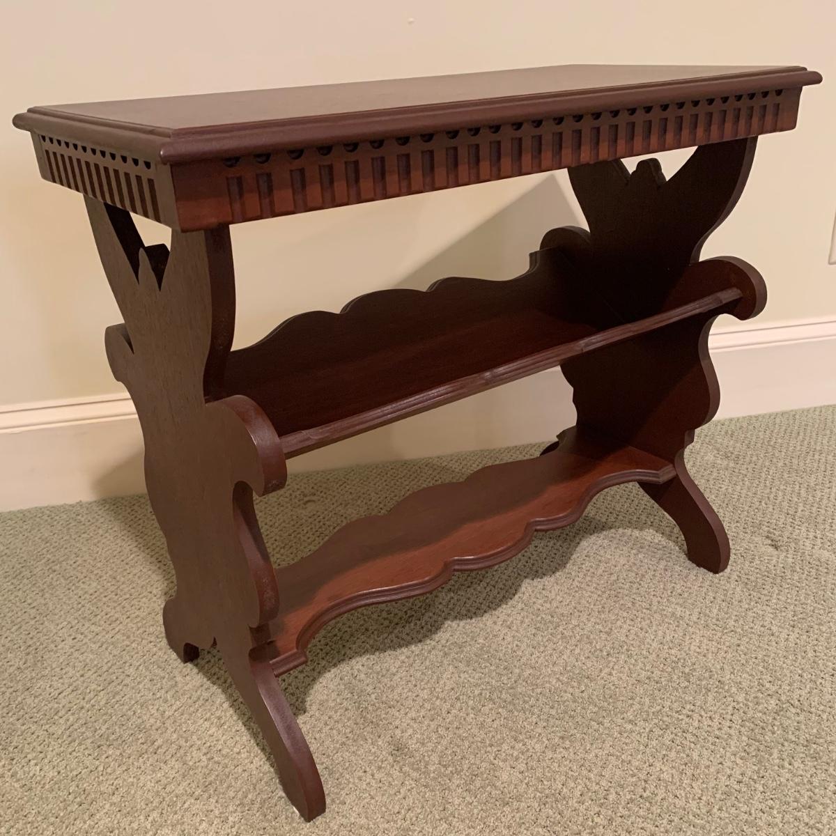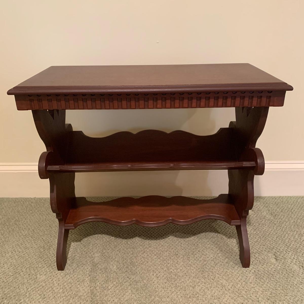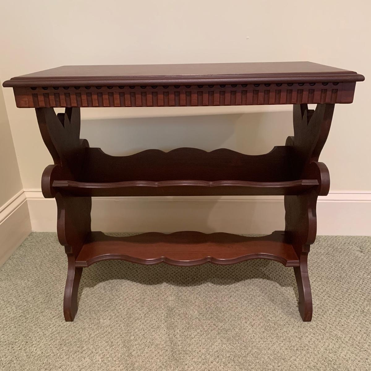 Library-style end table made of solid wood. Table features a dark stain finish and measures, 28” x 14” x 24”H. Local pick-up only.