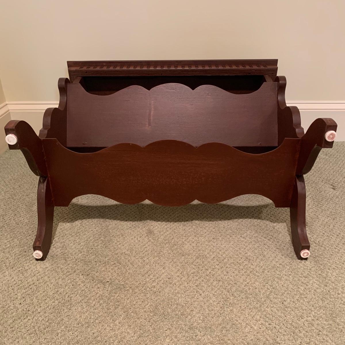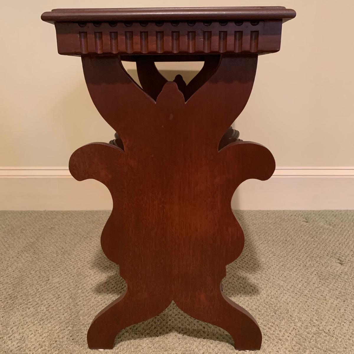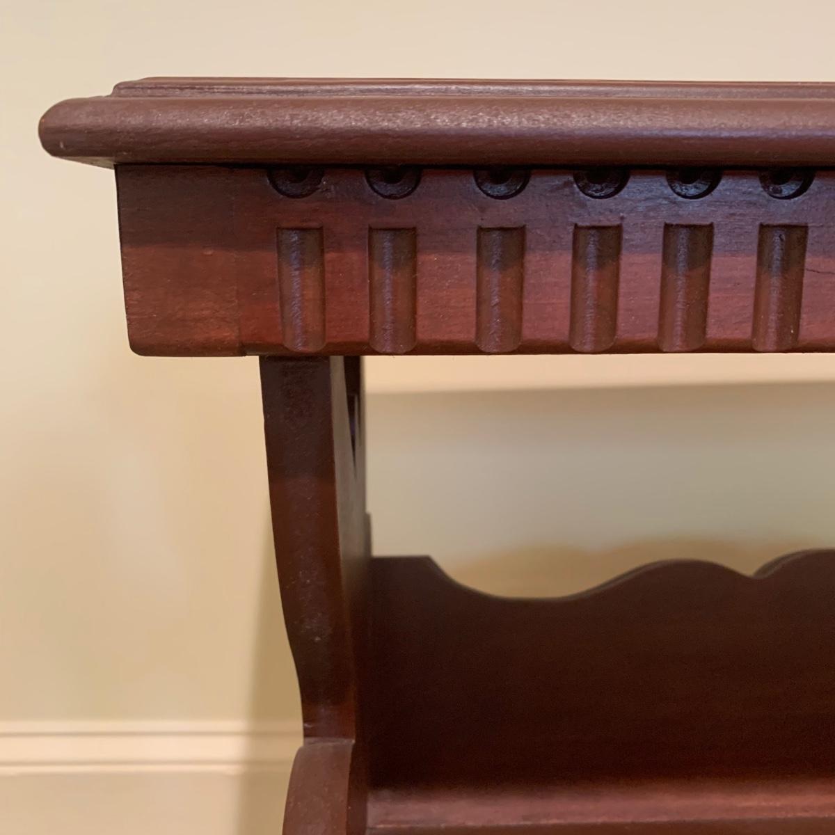 Library-style end table made of solid wood. Table features a dark stain finish and measures, 28” x 14” x 24”H. Local pick-up only.
