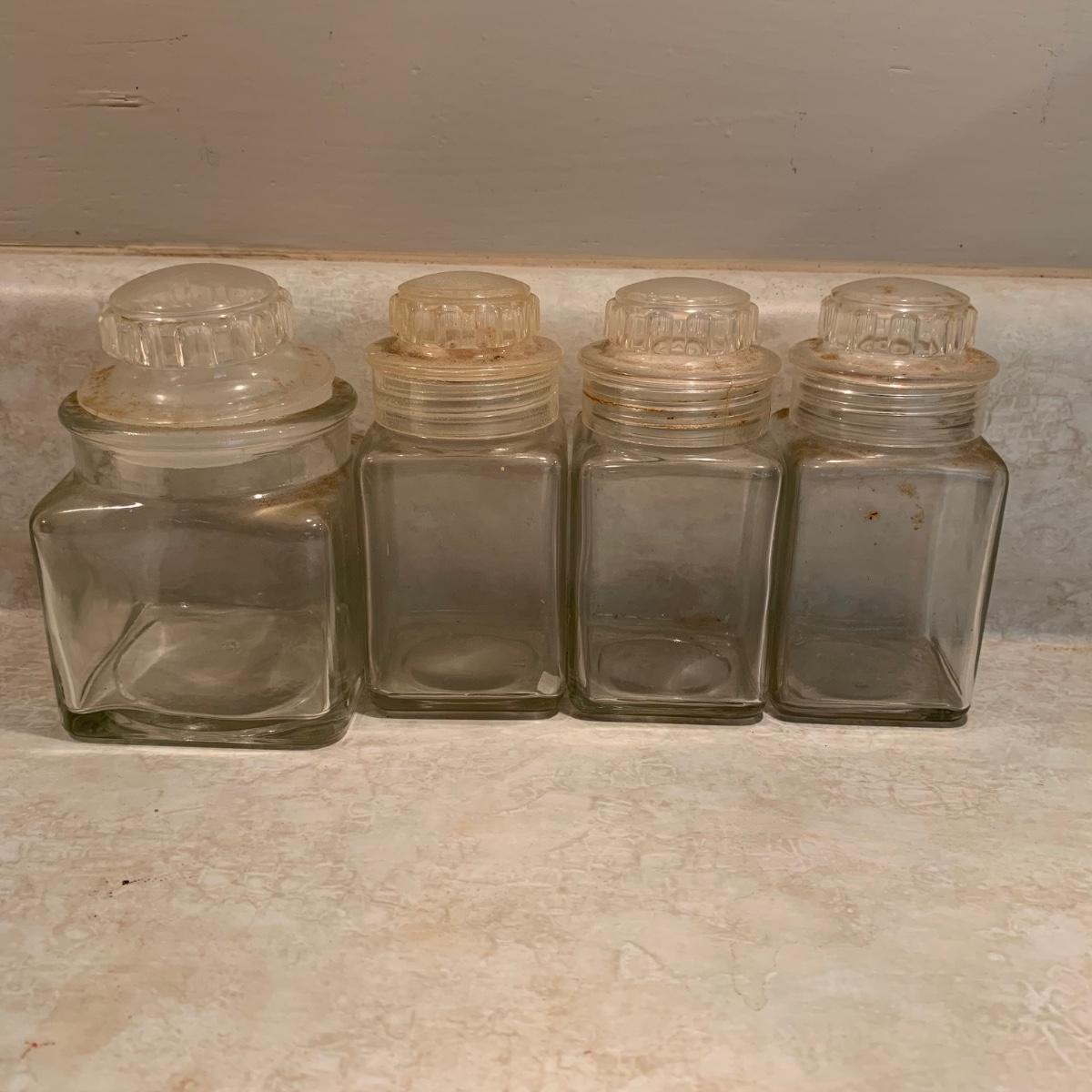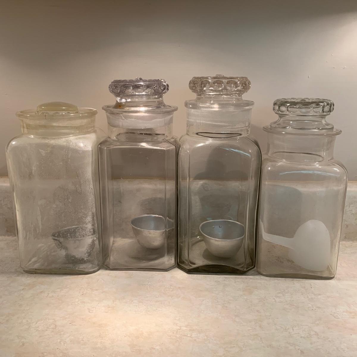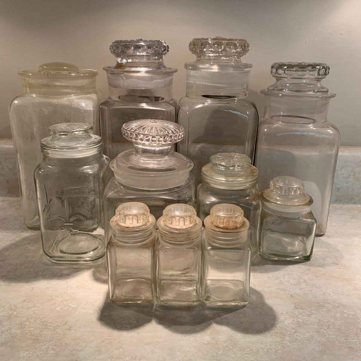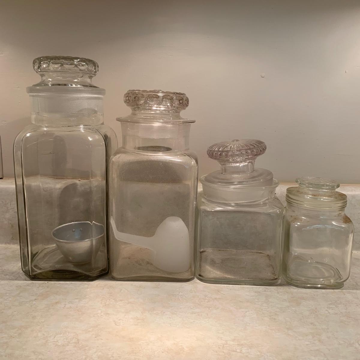Eleven jars total in this lot. The five largest jars have frosted glass around the rims of the jars and the lids. The two medium-sized jars have lids that appear to be glass tops with a plastic layer on the part that seals. The four smallest jars all have plastic lids, three of which screw on. The largest jar in this collection measures 5” x 5” x 12” and the smallest is 2” x 2” x 4.5”. Note that most jars have residue from the sugar, coffee, etc. that was stored in them, and four jars have scoops inside. Local pickup only.