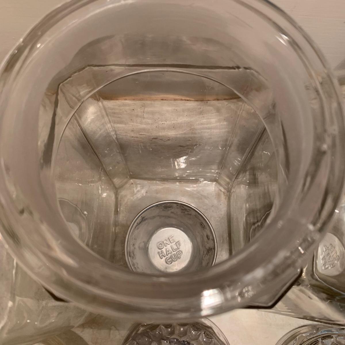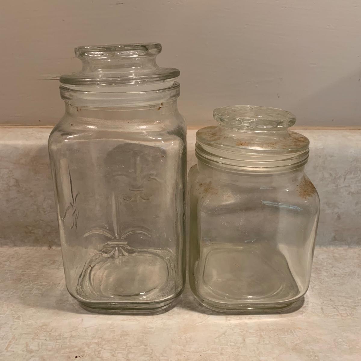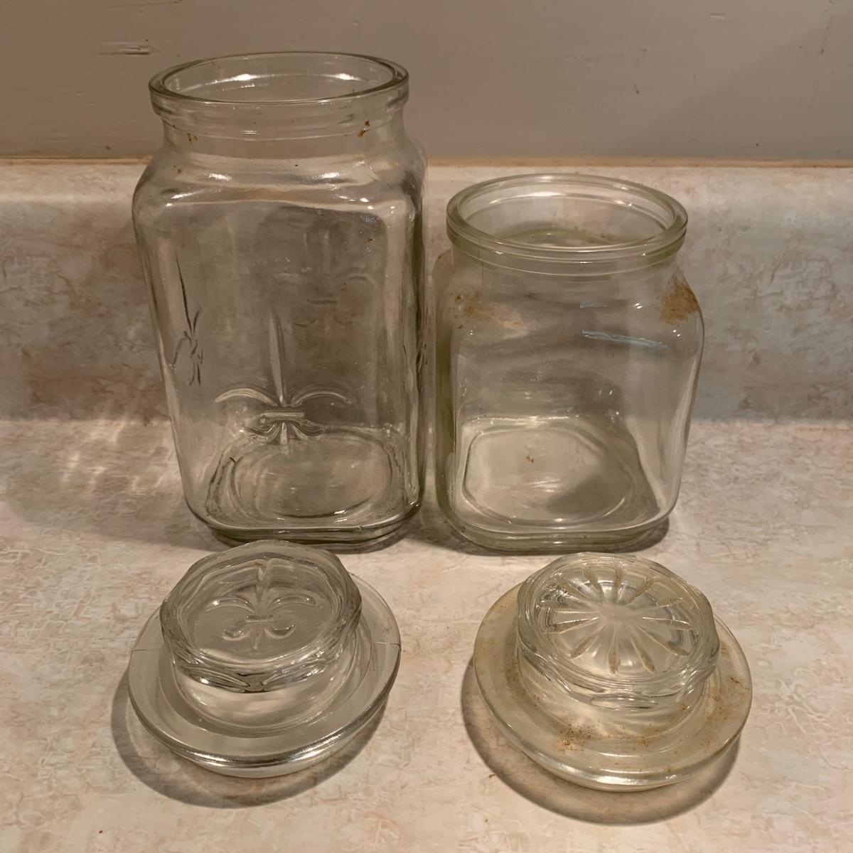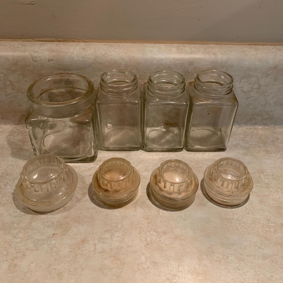 Eleven jars total in this lot. The five largest jars have frosted glass around the rims of the jars and the lids. The two medium-sized jars have lids that appear to be glass tops with a plastic layer on the part that seals. The four smallest jars all have plastic lids, three of which screw on. The largest jar in this collection measures 5” x 5” x 12” and the smallest is 2” x 2” x 4.5”. Note that most jars have residue from the sugar, coffee, etc. that was stored in them, and four jars have scoops inside. Local pickup only.