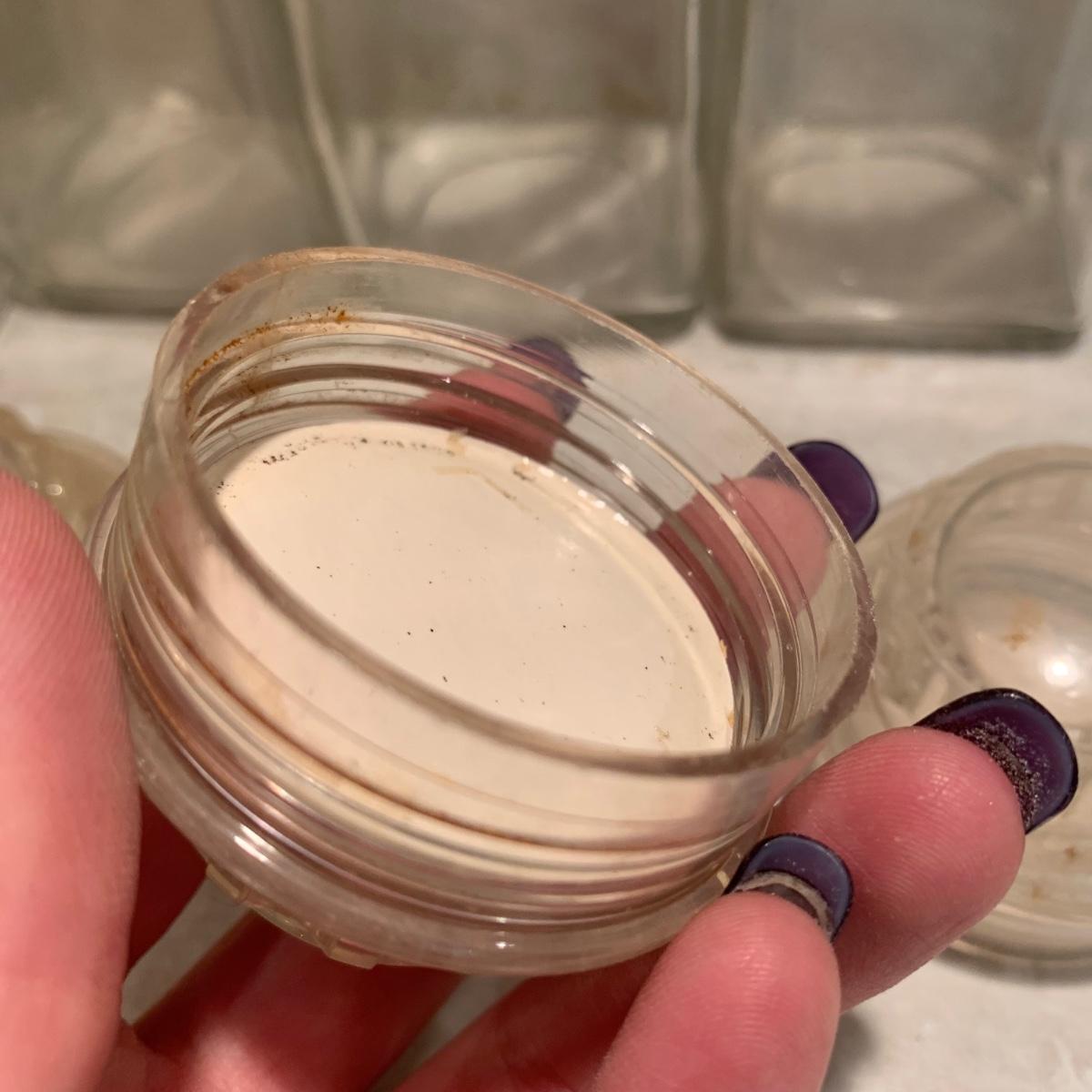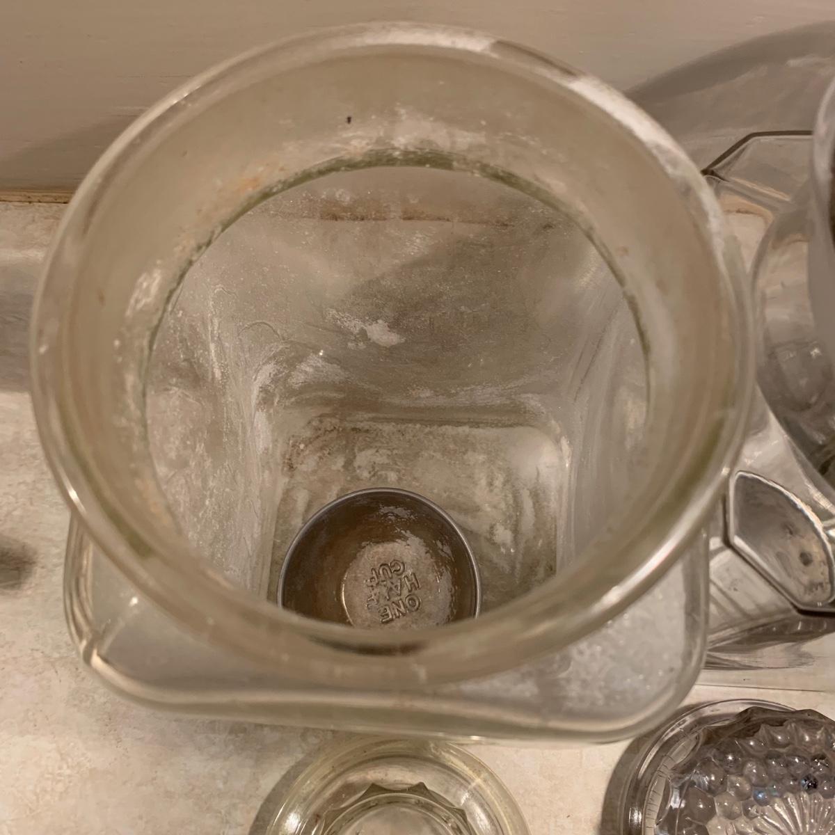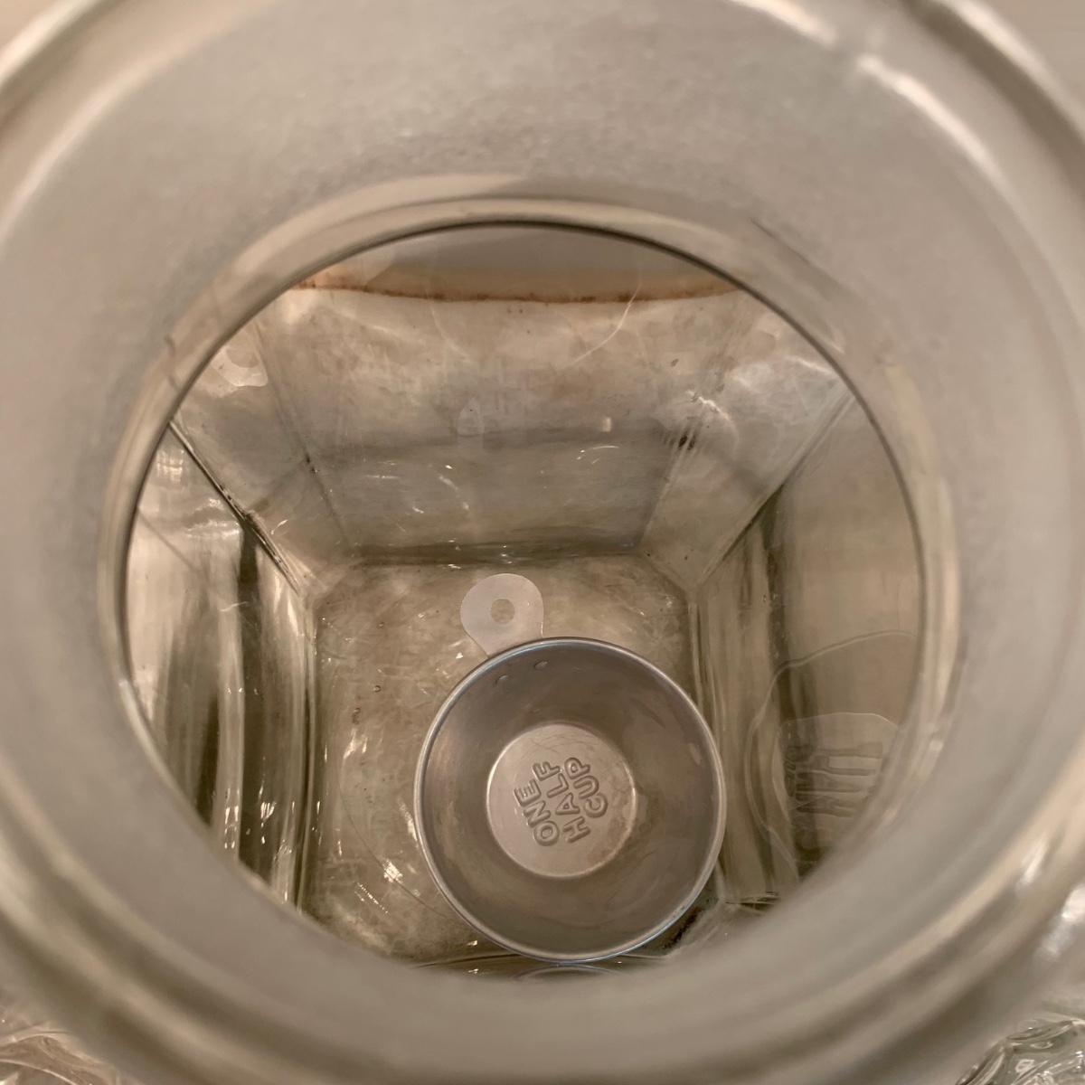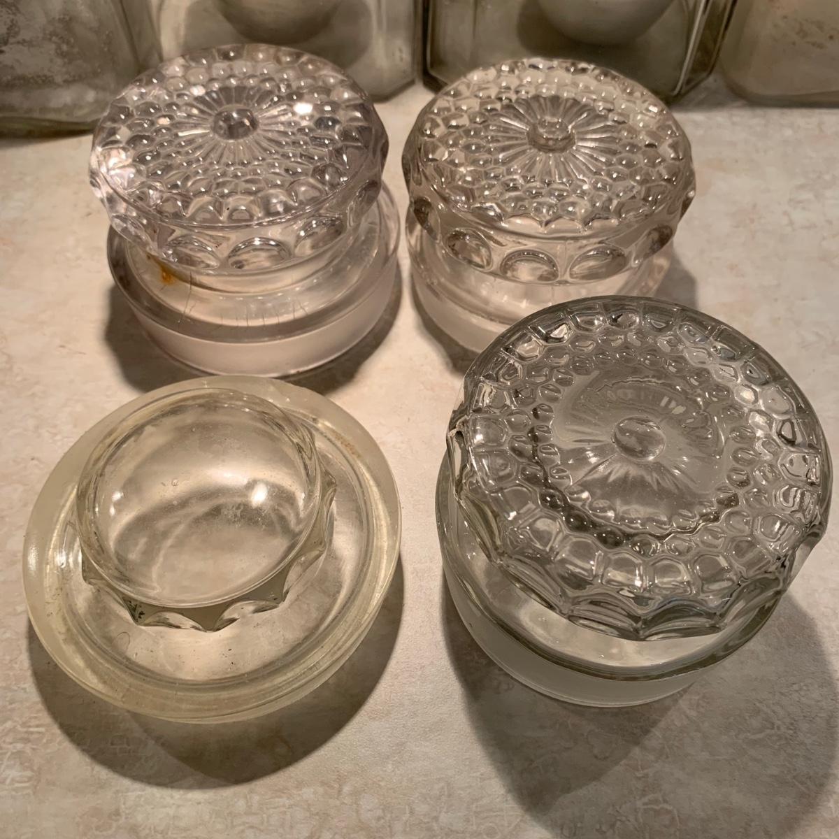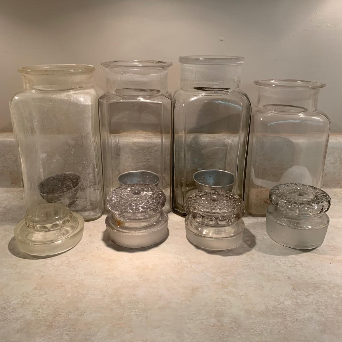 Eleven jars total in this lot. The five largest jars have frosted glass around the rims of the jars and the lids. The two medium-sized jars have lids that appear to be glass tops with a plastic layer on the part that seals. The four smallest jars all have plastic lids, three of which screw on. The largest jar in this collection measures 5” x 5” x 12” and the smallest is 2” x 2” x 4.5”. Note that most jars have residue from the sugar, coffee, etc. that was stored in them, and four jars have scoops inside. Local pickup only.