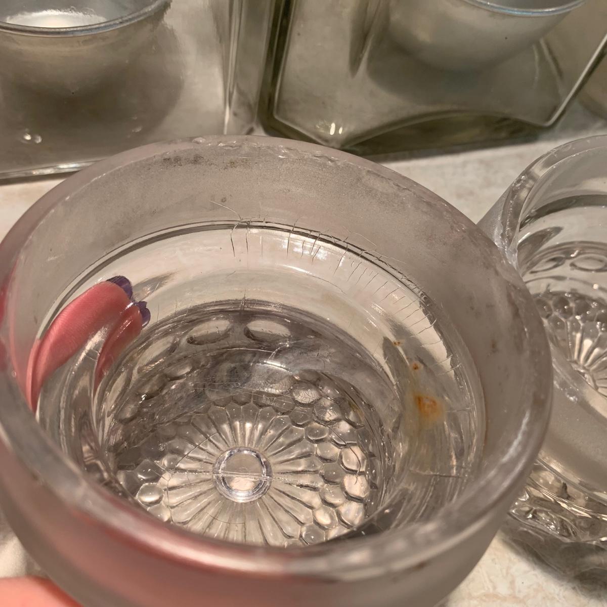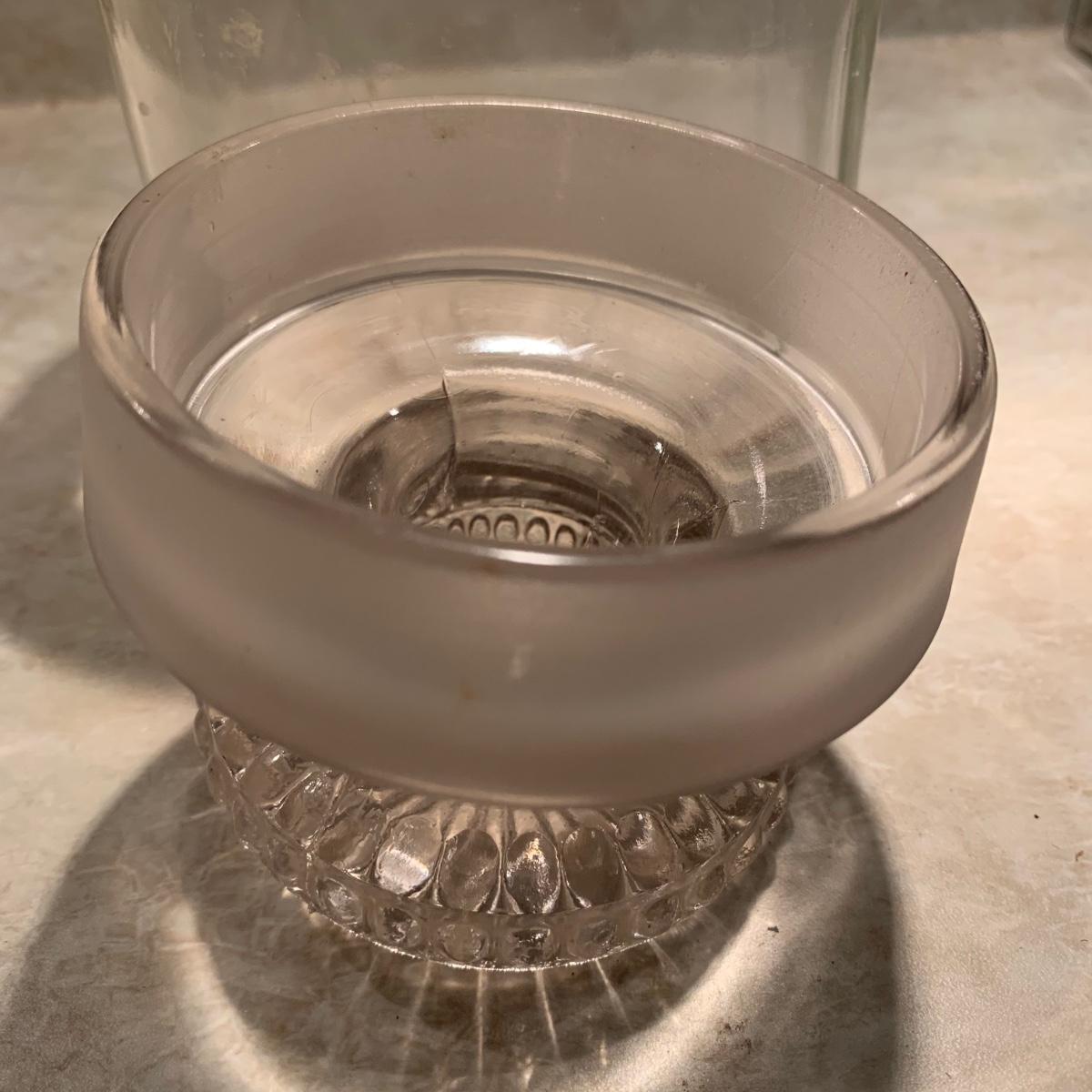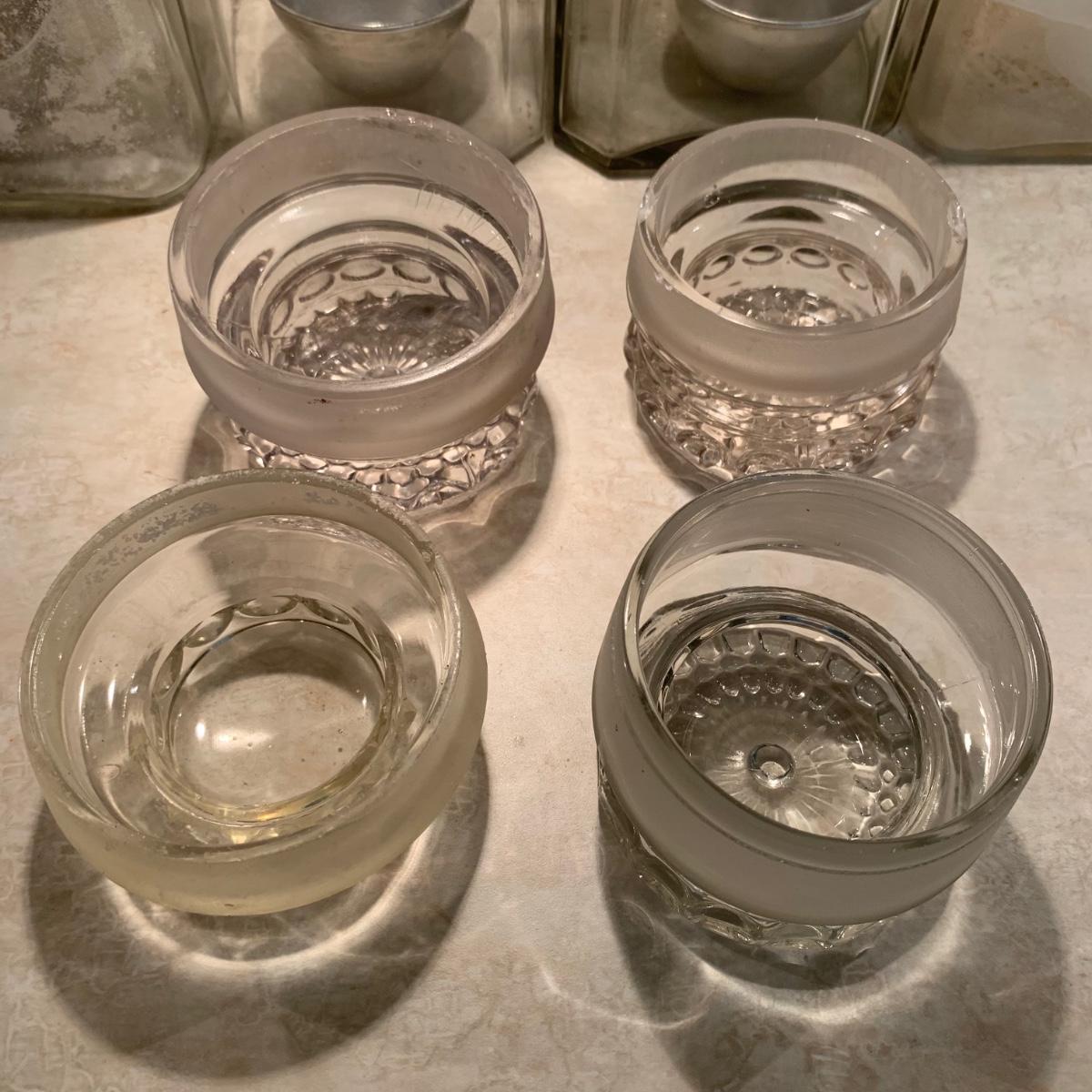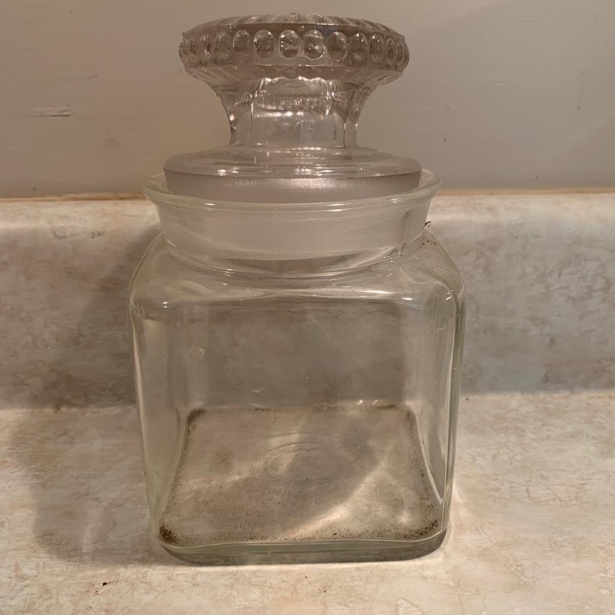 Eleven jars total in this lot. The five largest jars have frosted glass around the rims of the jars and the lids. The two medium-sized jars have lids that appear to be glass tops with a plastic layer on the part that seals. The four smallest jars all have plastic lids, three of which screw on. The largest jar in this collection measures 5” x 5” x 12” and the smallest is 2” x 2” x 4.5”. Note that most jars have residue from the sugar, coffee, etc. that was stored in them, and four jars have scoops inside. Local pickup only.