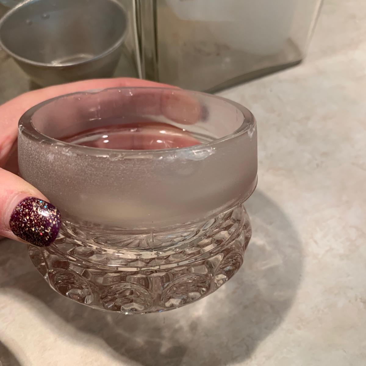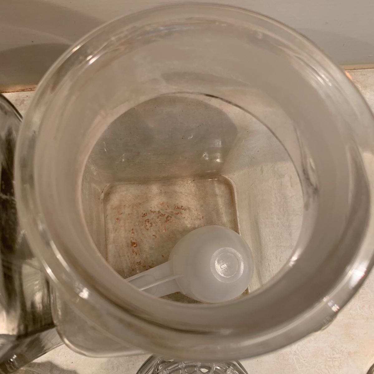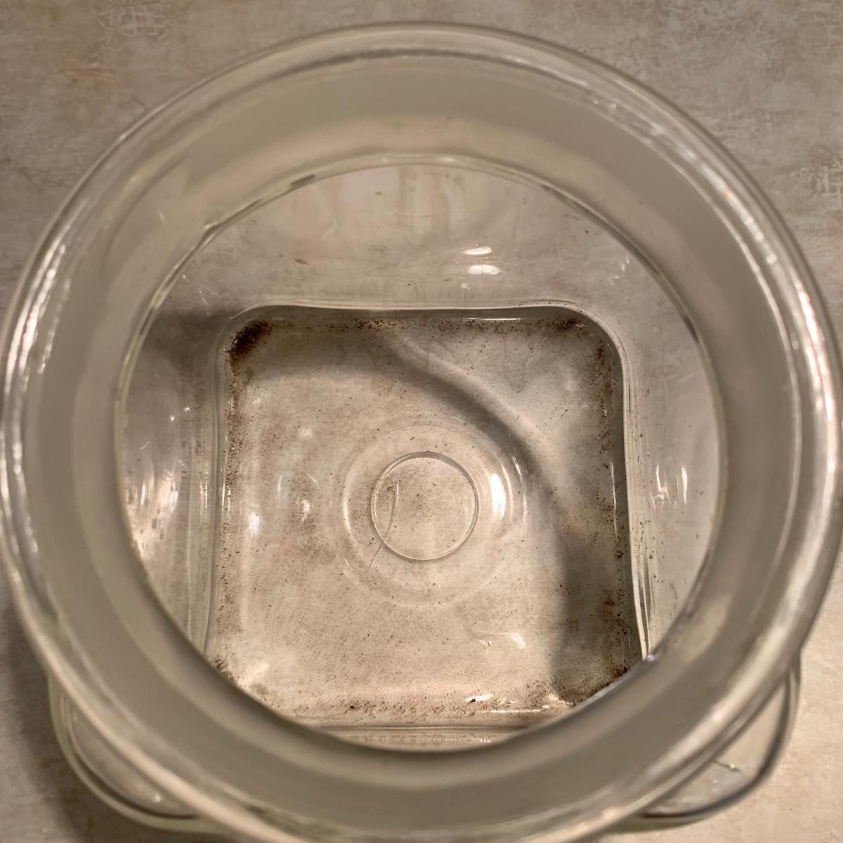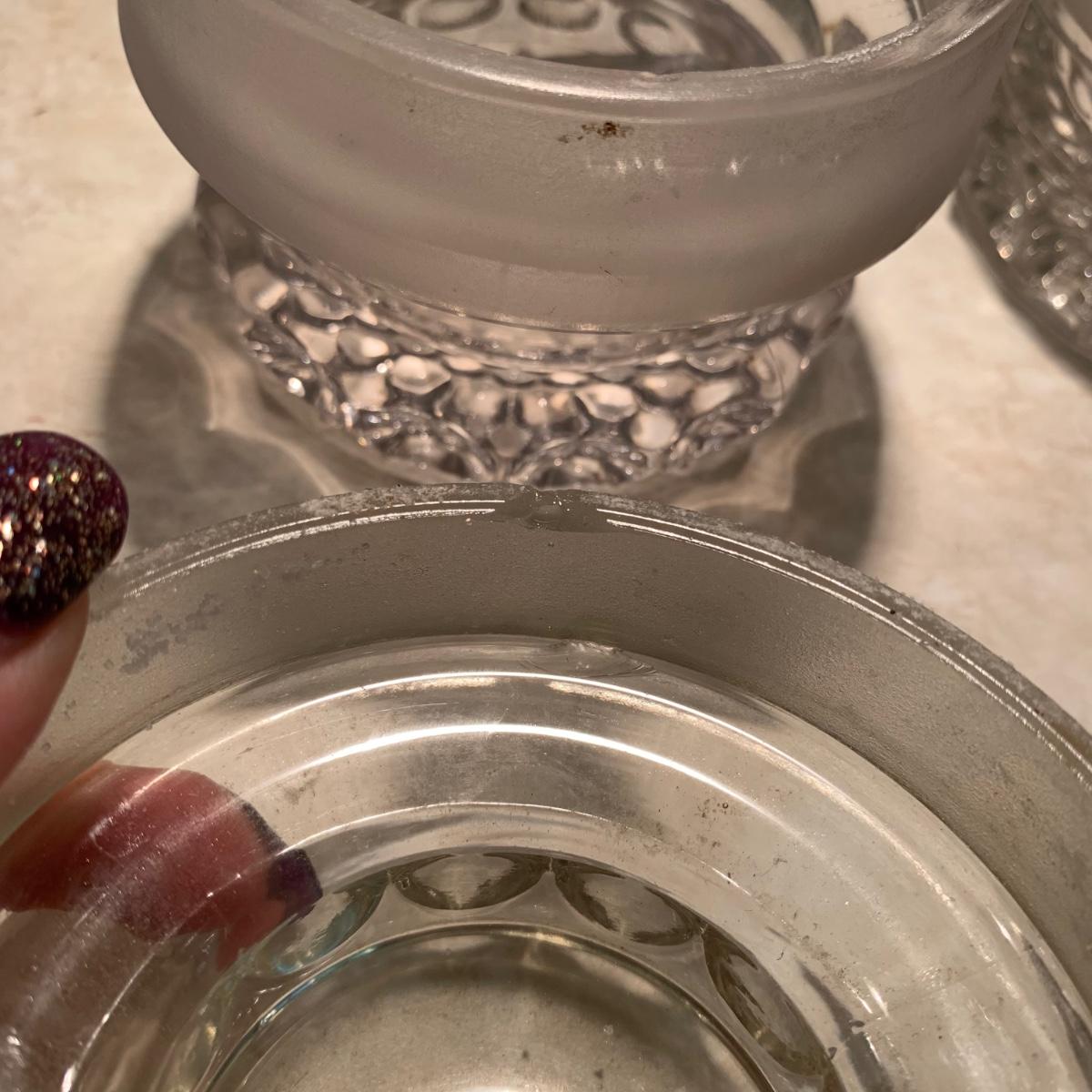 Eleven jars total in this lot. The five largest jars have frosted glass around the rims of the jars and the lids. The two medium-sized jars have lids that appear to be glass tops with a plastic layer on the part that seals. The four smallest jars all have plastic lids, three of which screw on. The largest jar in this collection measures 5” x 5” x 12” and the smallest is 2” x 2” x 4.5”. Note that most jars have residue from the sugar, coffee, etc. that was stored in them, and four jars have scoops inside. Local pickup only.