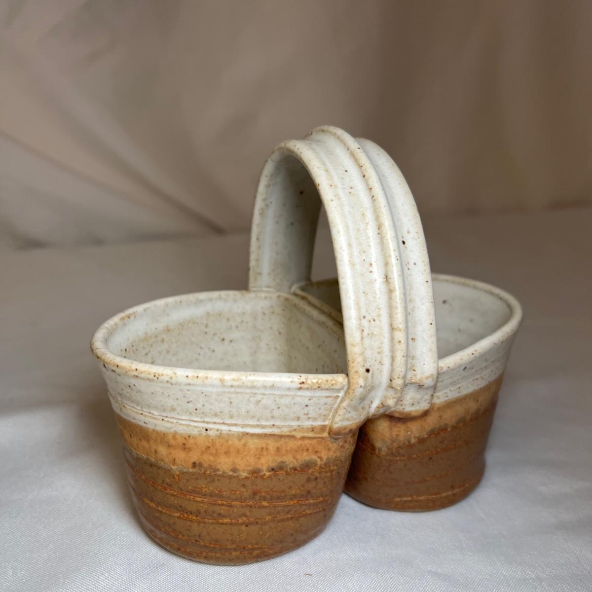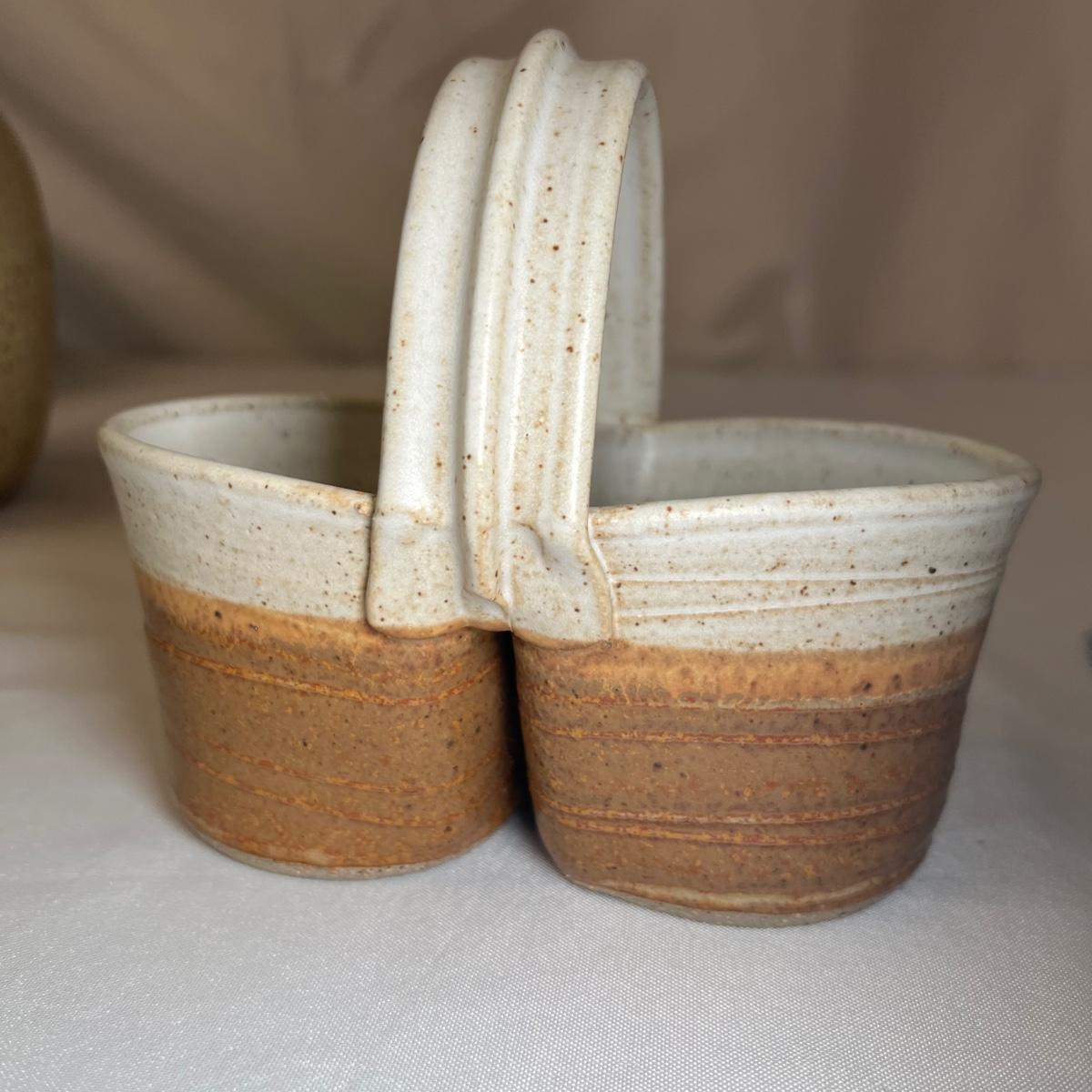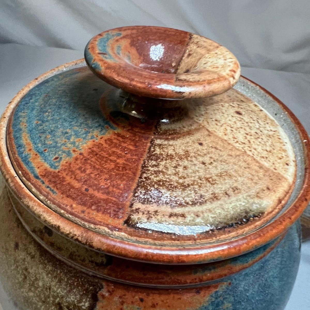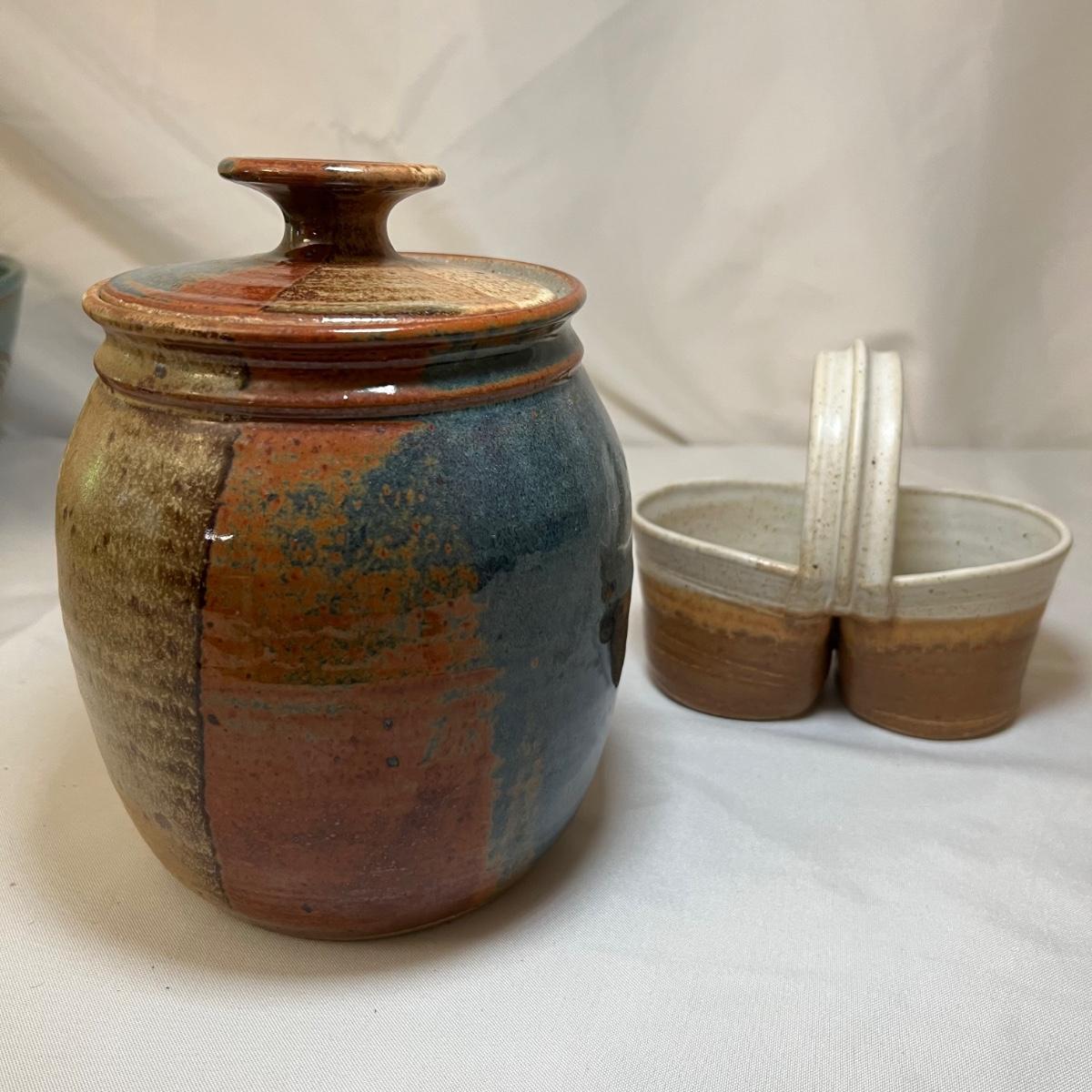 Jar measures 6” D x 8” H. Handled double sided piece measures 6” x 4” x 5.5”.