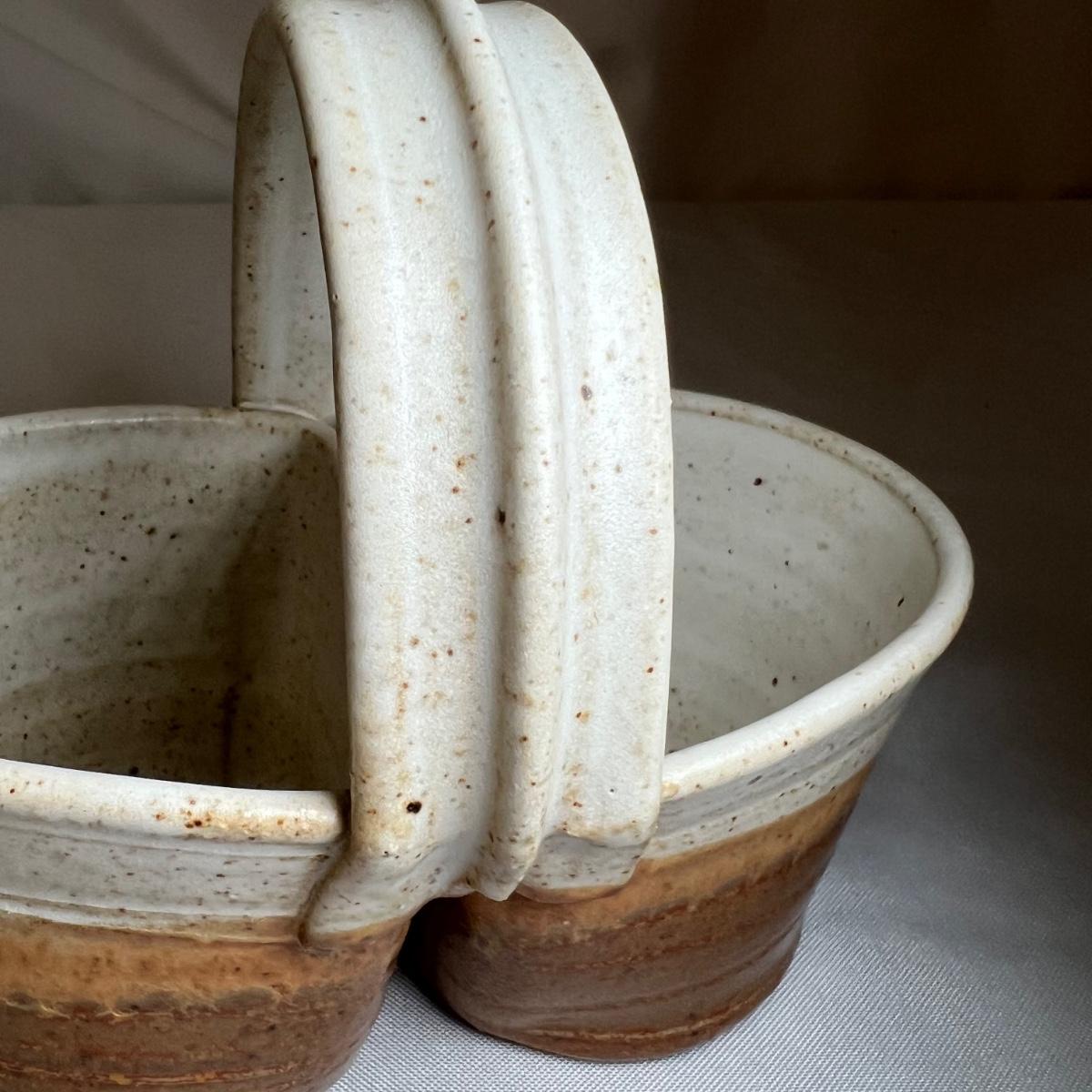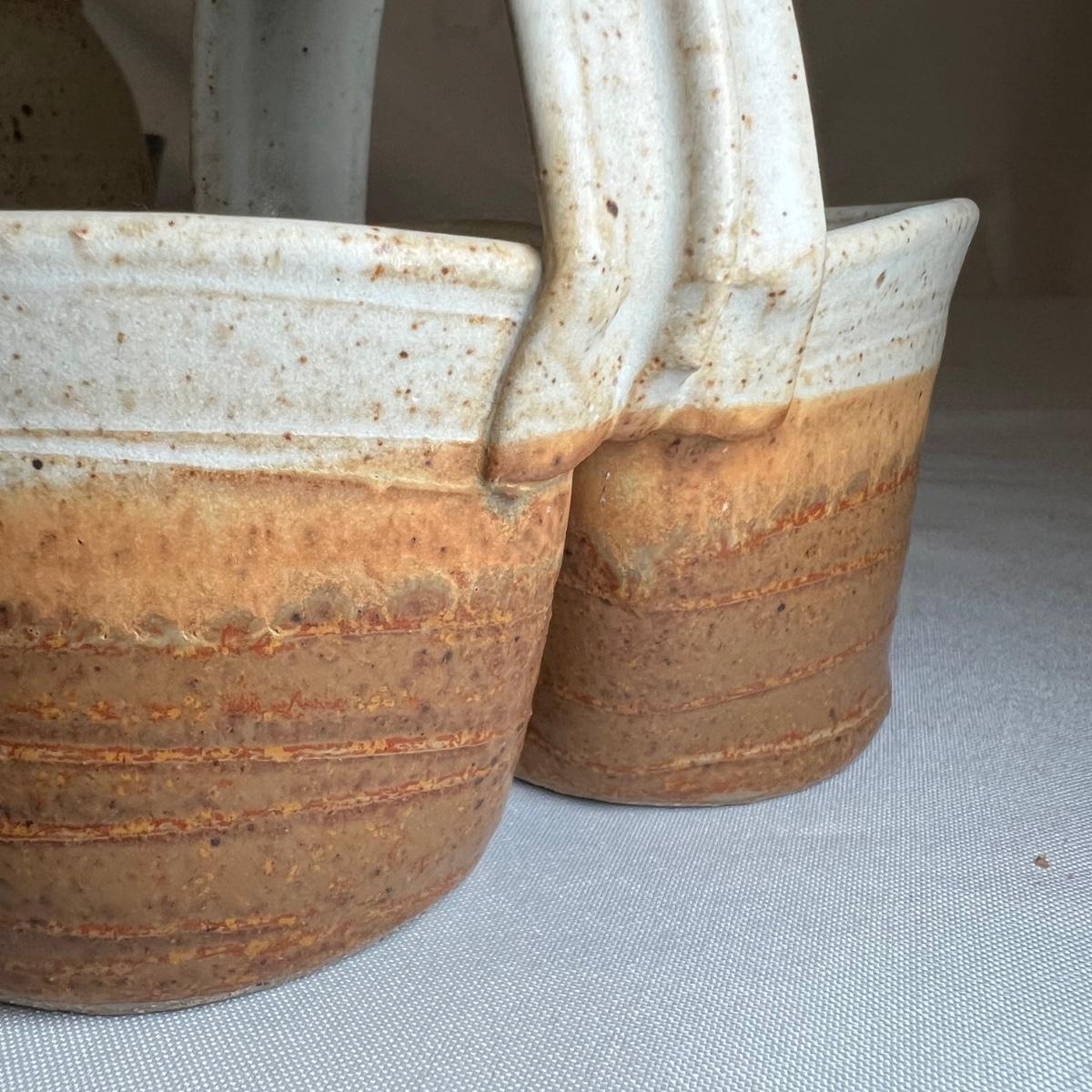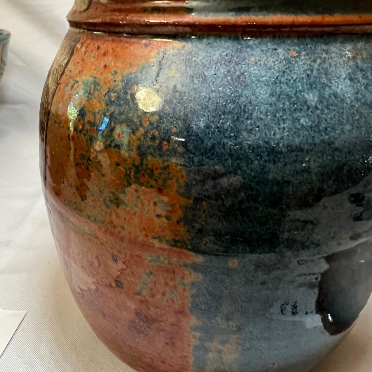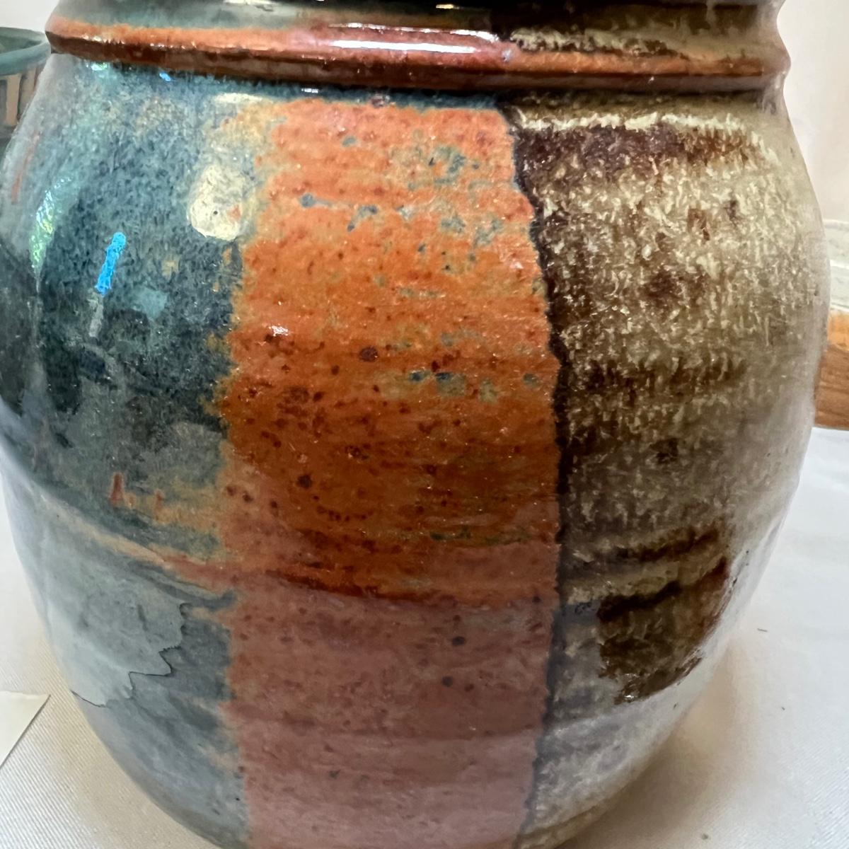 Jar measures 6” D x 8” H. Handled double sided piece measures 6” x 4” x 5.5”.