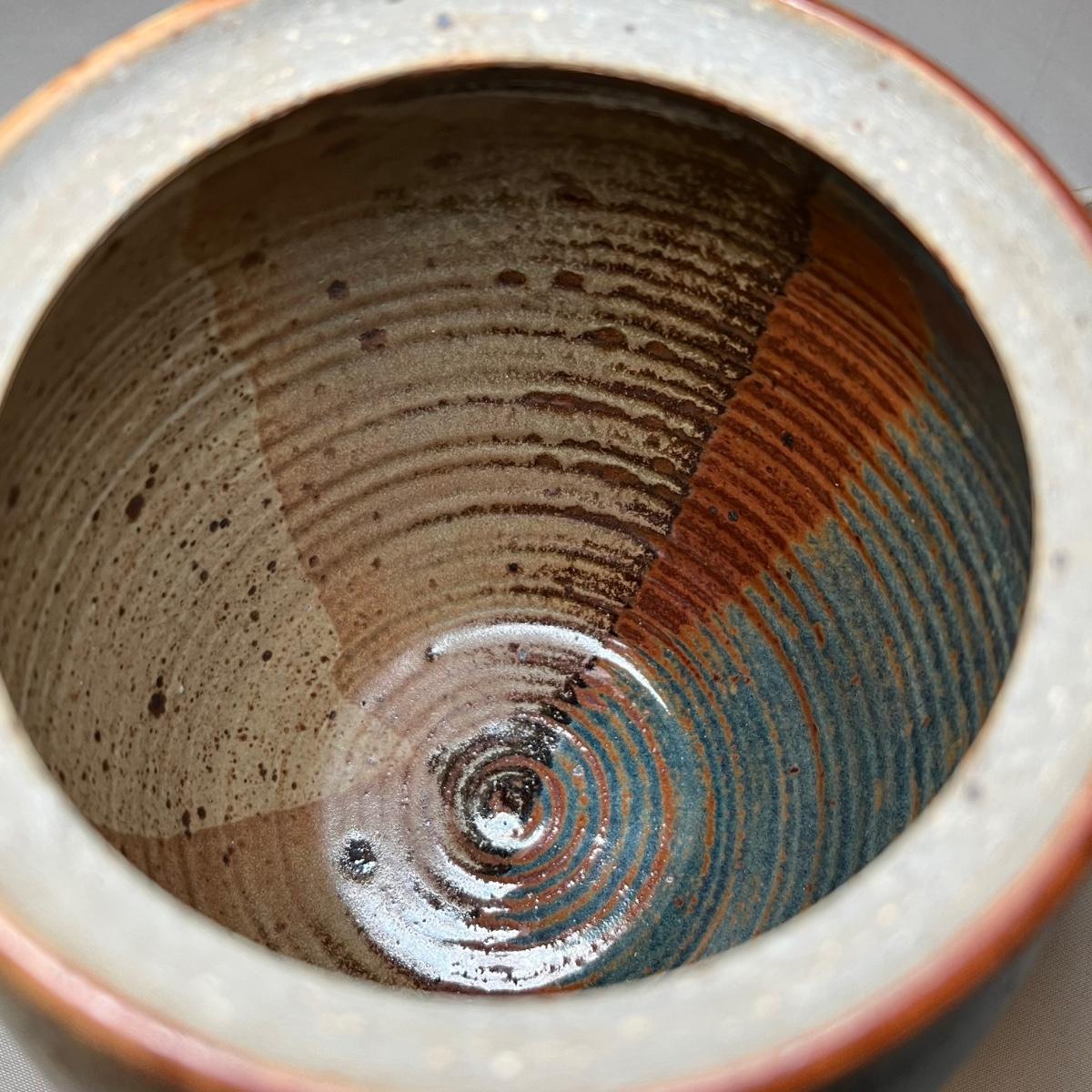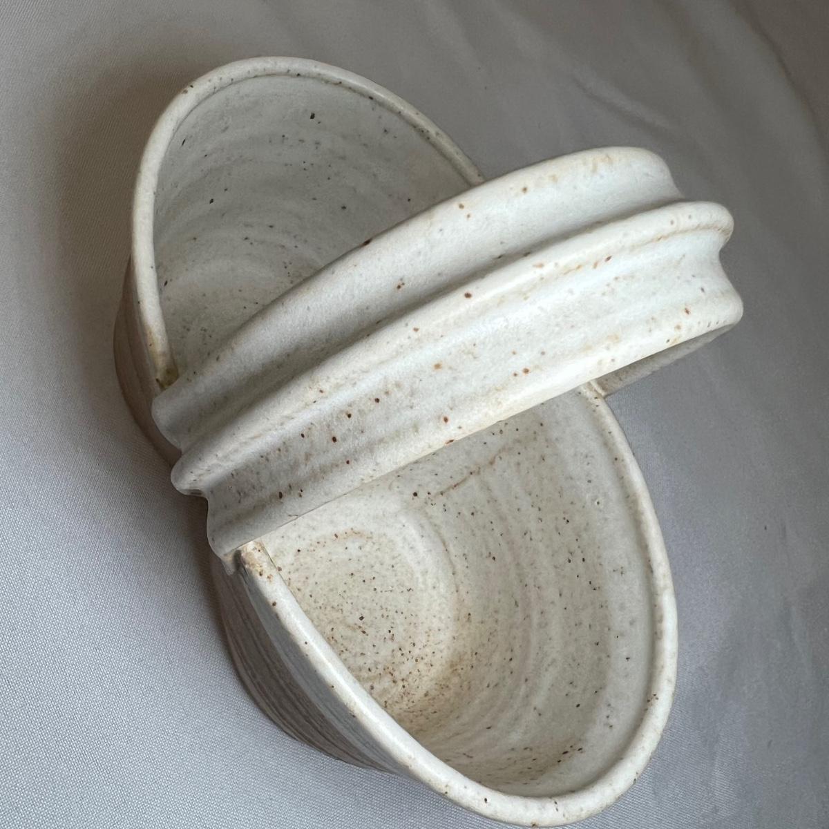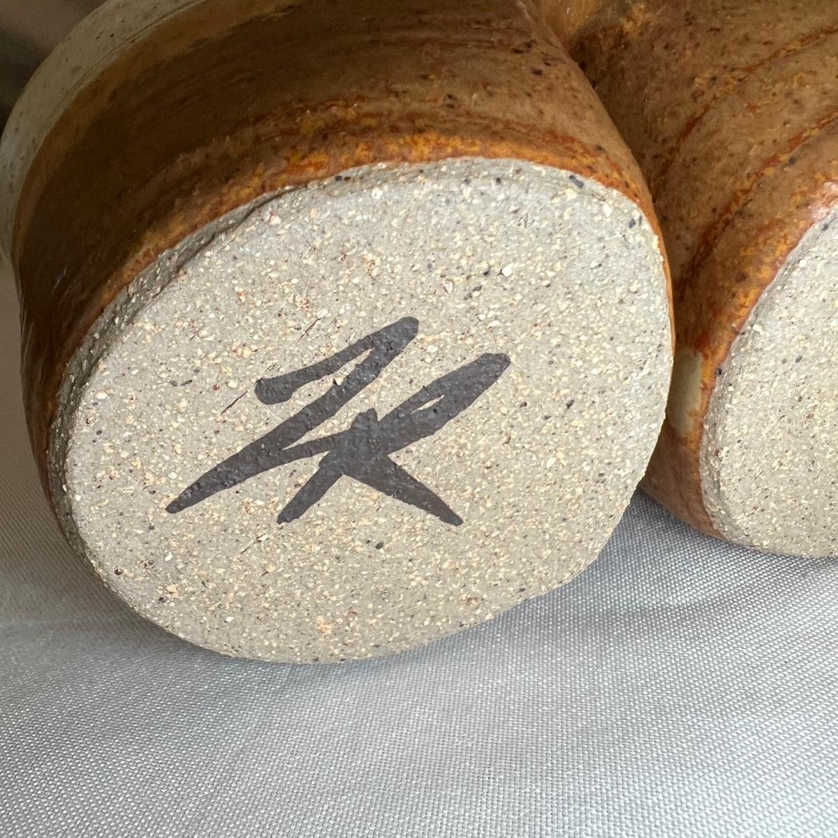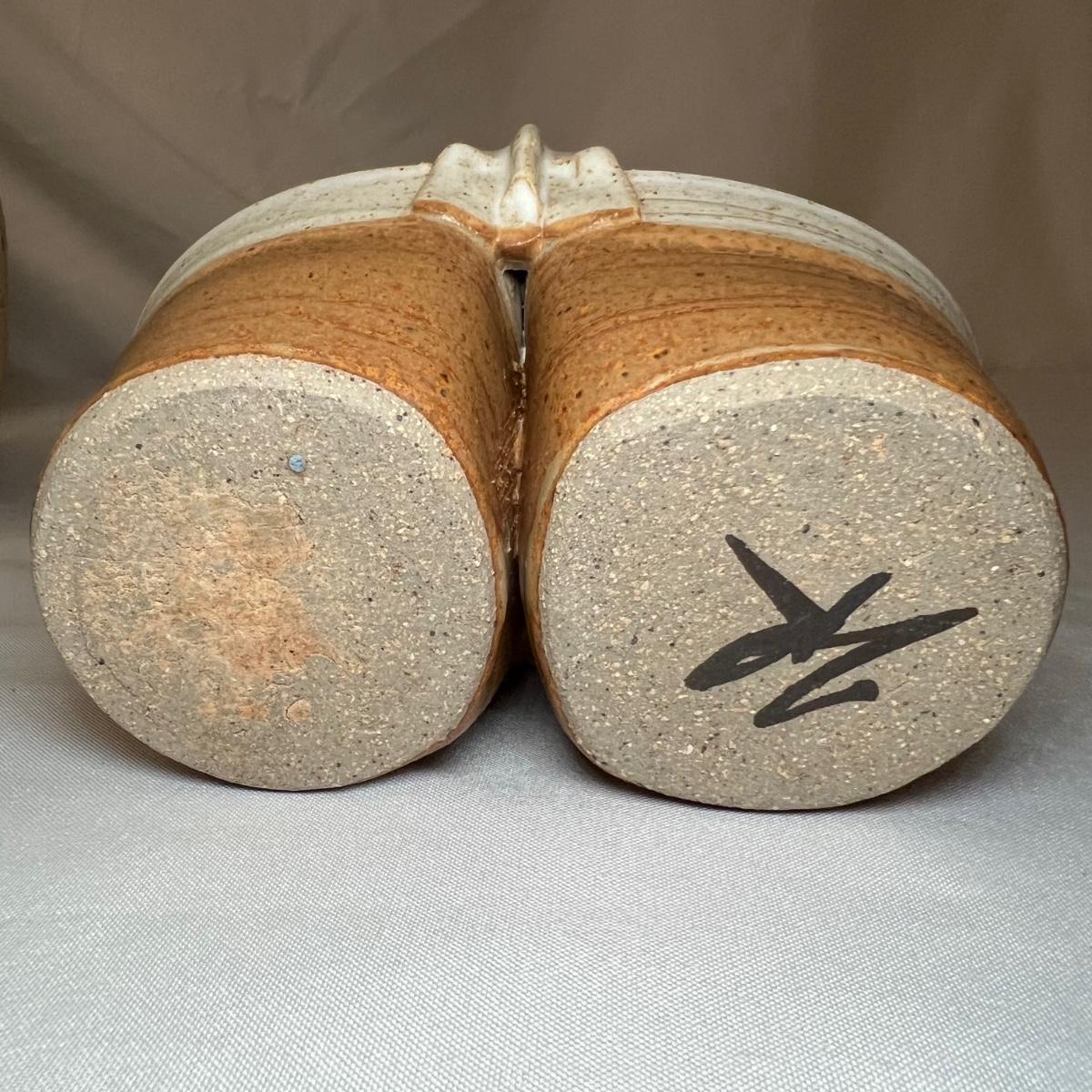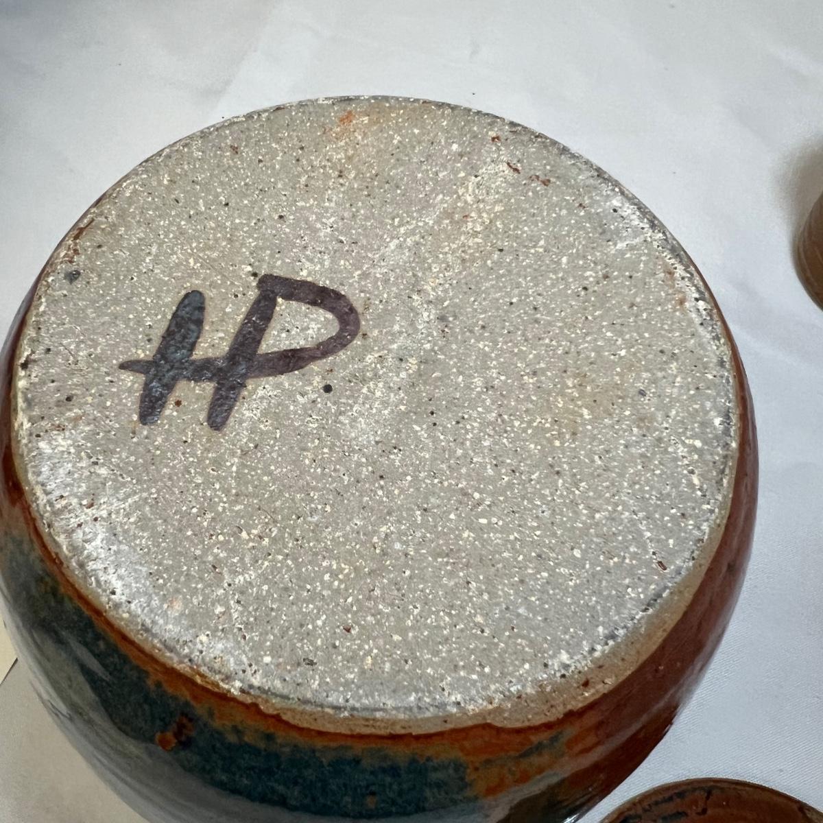 Both of these two pottery items are signed; the lidded pot with the initials HP and the double dish with initials ZR.