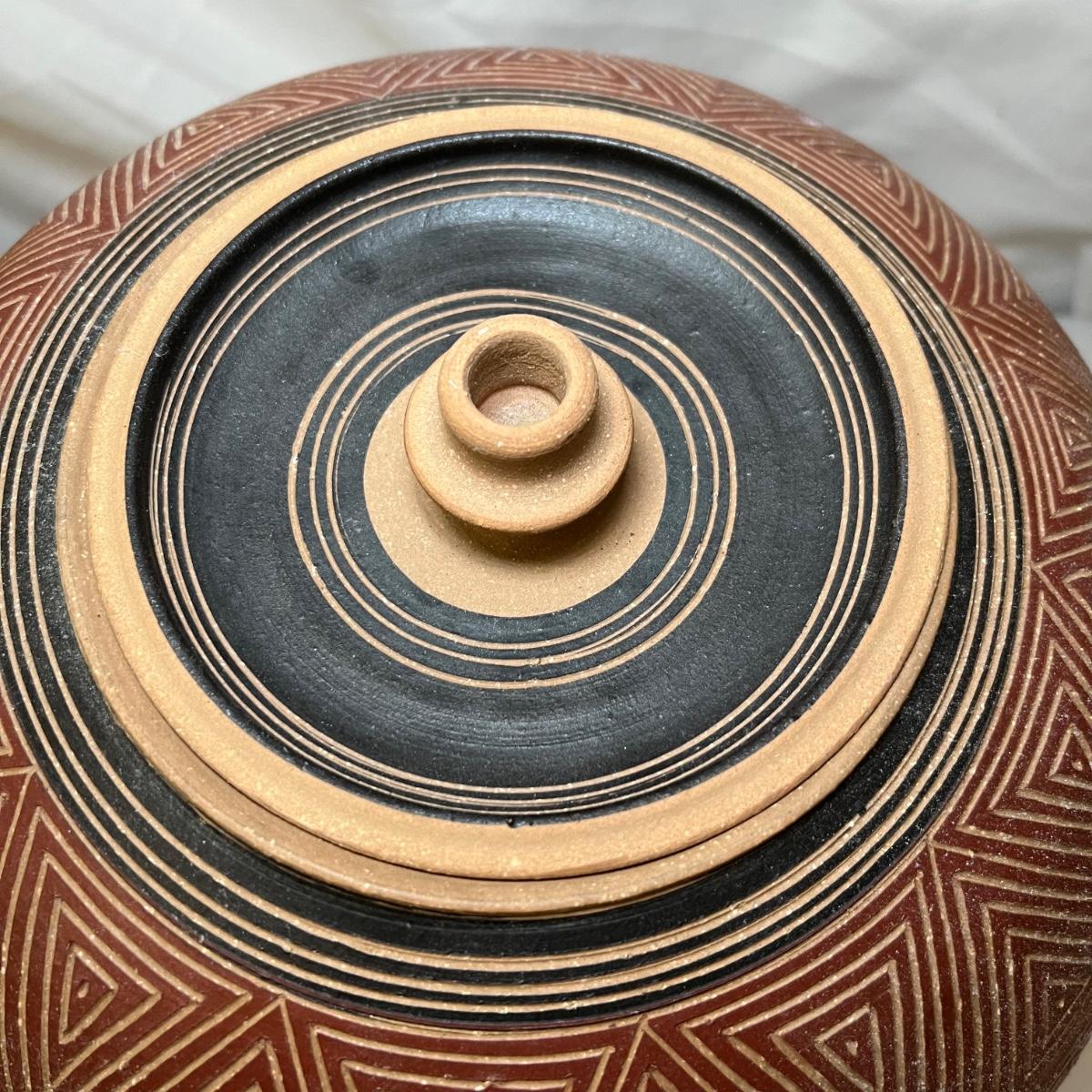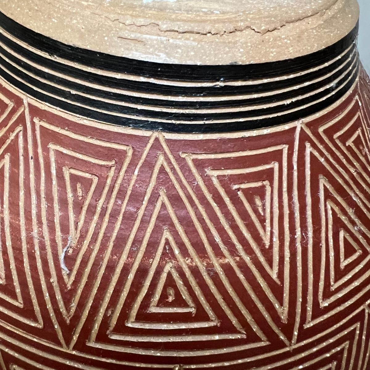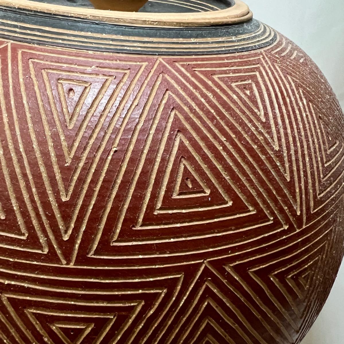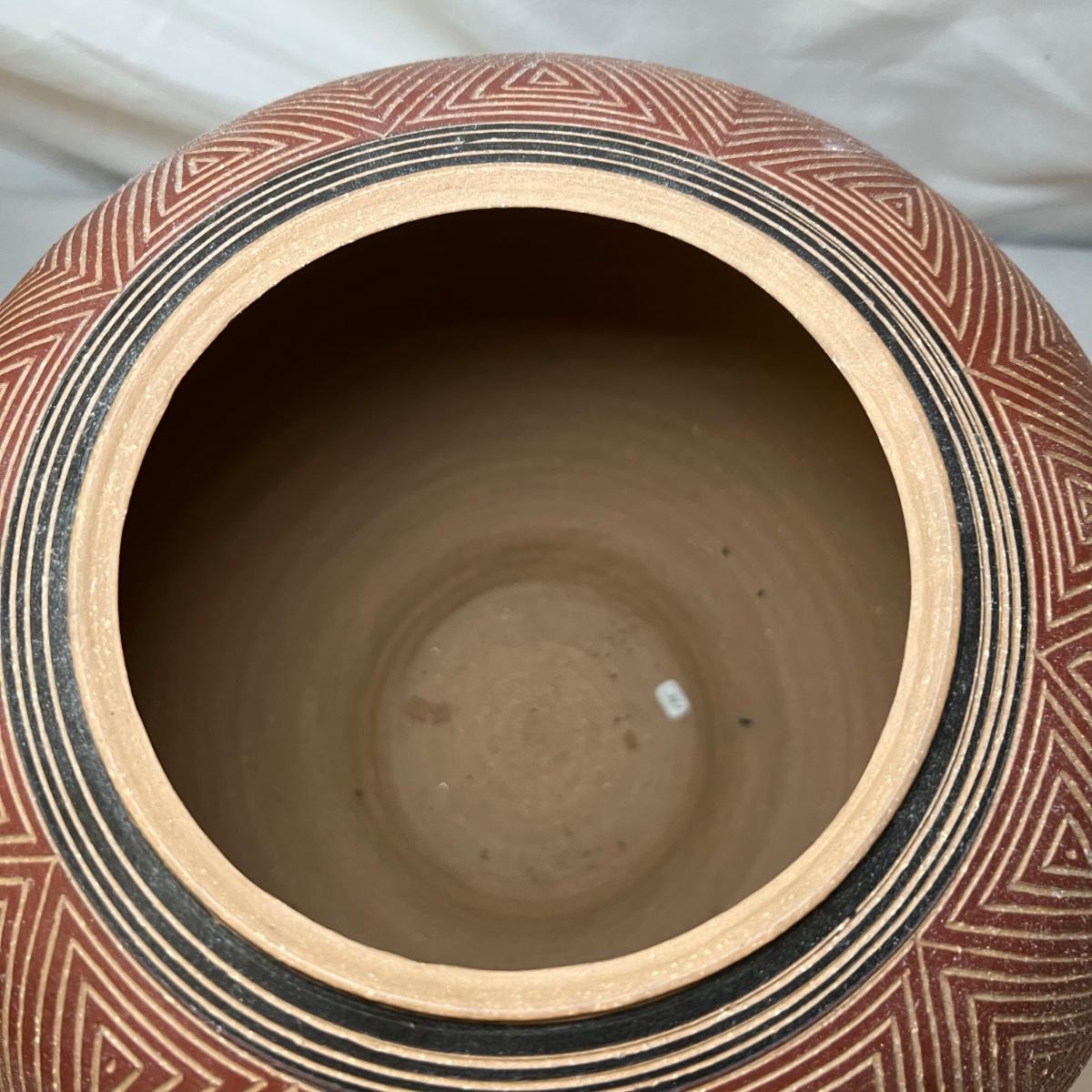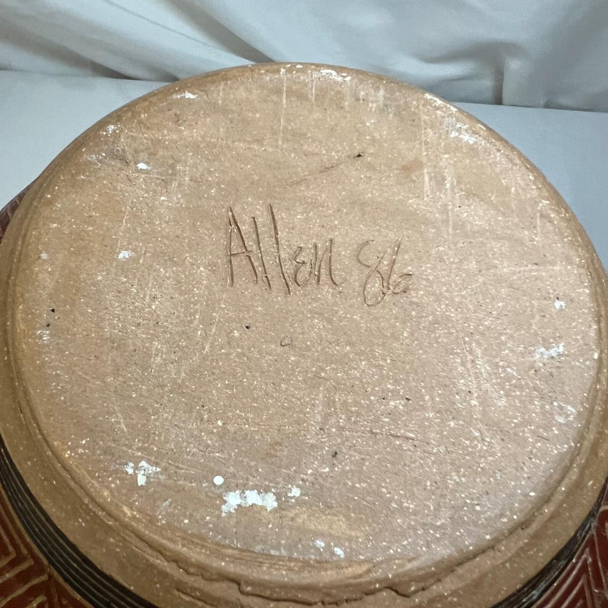 This large vessel is signed by "Allen" indicating its maker Kenneth Allen. It has a geometric design carved through the red stain or slip.