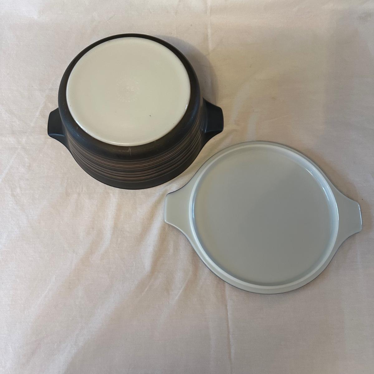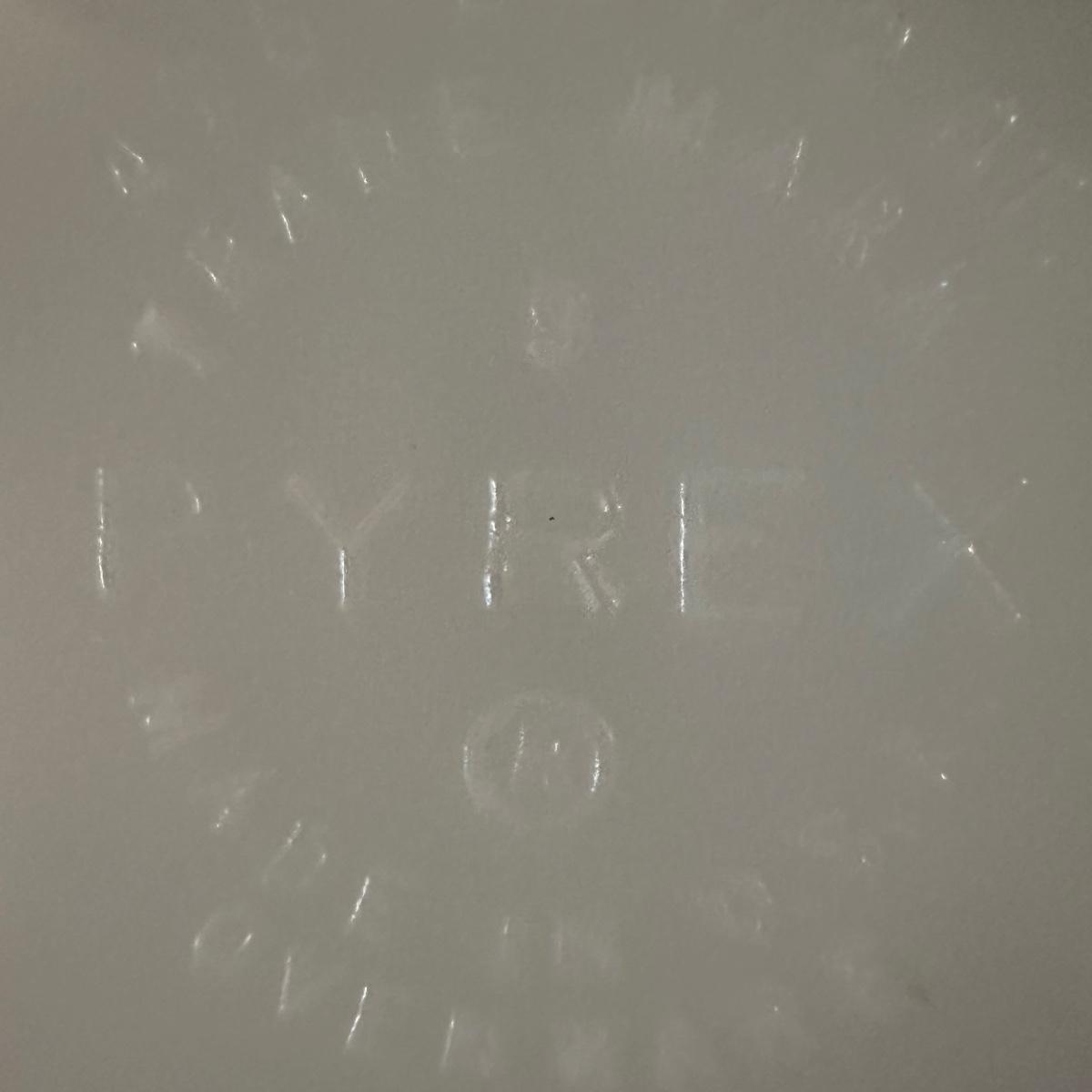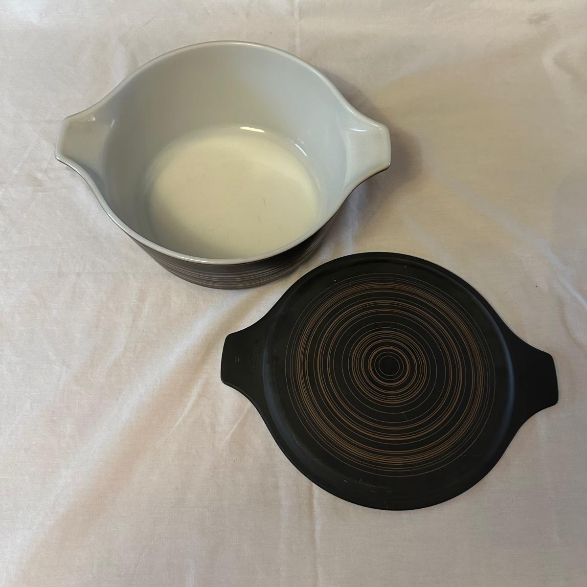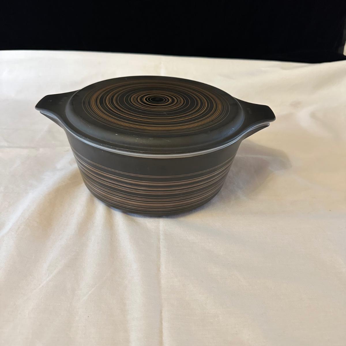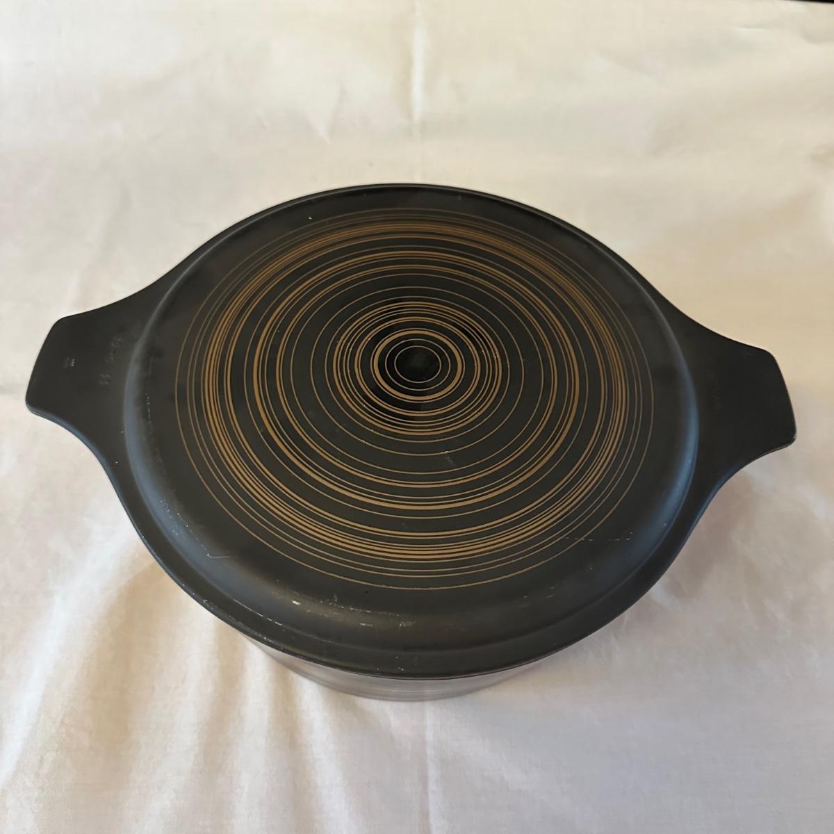 Round, lidded Pyrex baking dish measures 9”D x 4”H. Appears to be the terra black and gold design. Shipping available.
