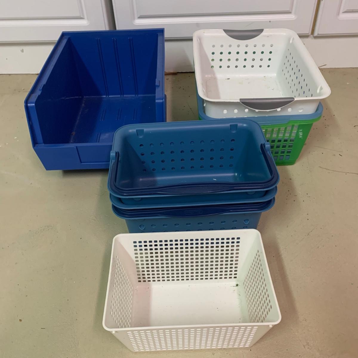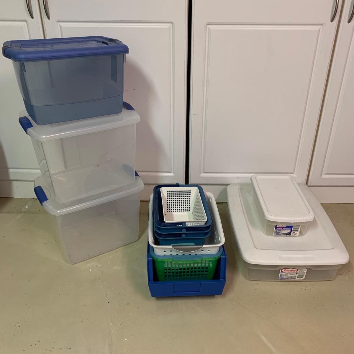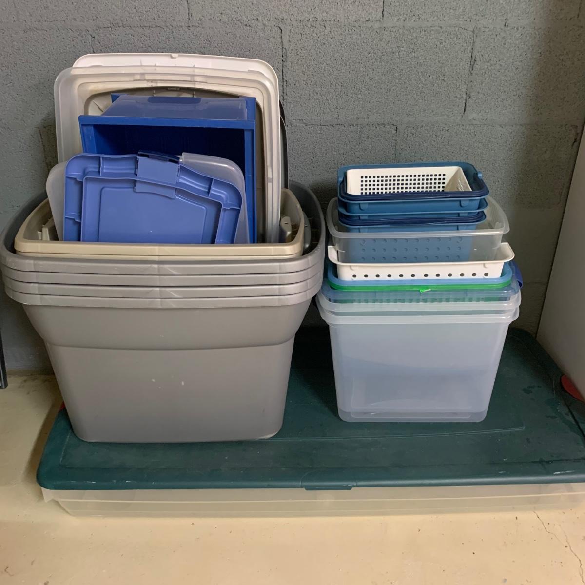 Lidded storage totes and other containers. Lot includes one large under bed storage container with lid, six medium sized totes with lids, two smaller totes with lids, one medium under bed storage container with lid, three transparent lidded containers and a variety of smaller plastic storage baskets. Largest item measures approximately 46” x 26.5” x 6”H. All items are in used condition. Items were stored in a basement and may require cleaning. Please see photos for more details. Local pick-up only.