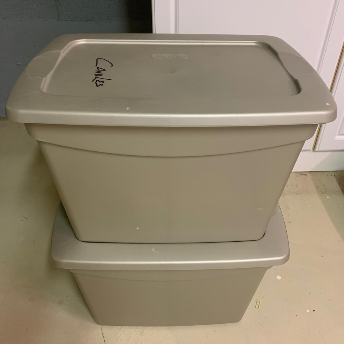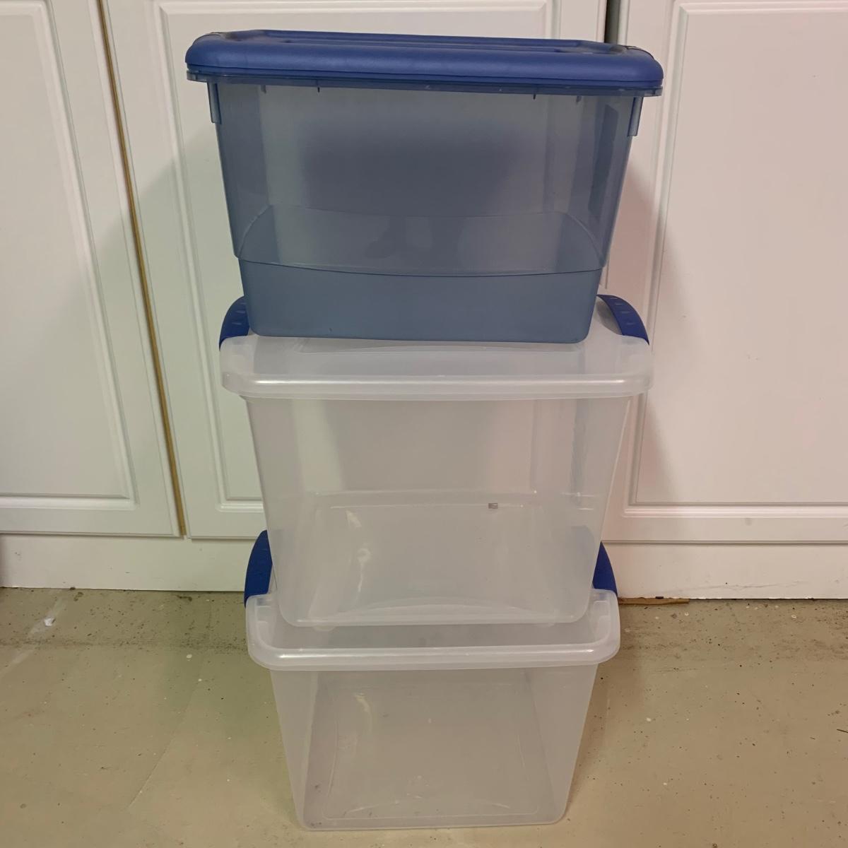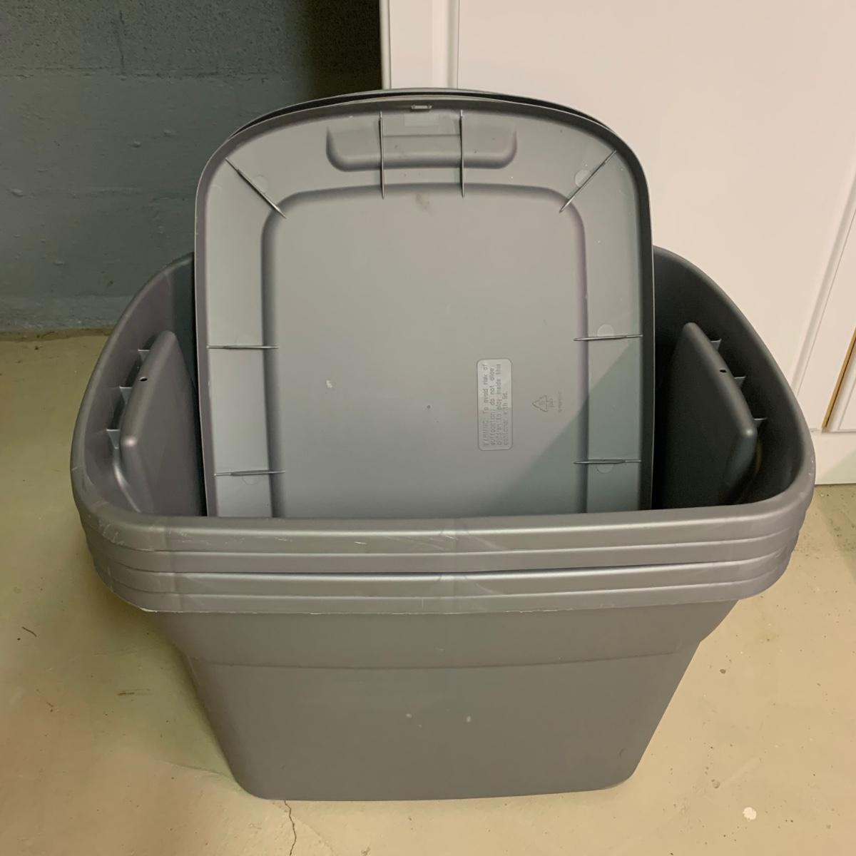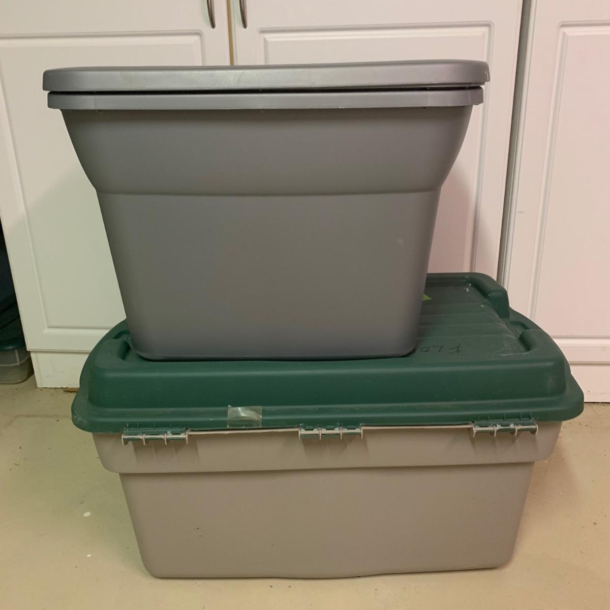Lidded storage totes and other containers. Lot includes one large under bed storage container with lid, six medium sized totes with lids, two smaller totes with lids, one medium under bed storage container with lid, three transparent lidded containers and a variety of smaller plastic storage baskets. Largest item measures approximately 46” x 26.5” x 6”H. All items are in used condition. Items were stored in a basement and may require cleaning. Please see photos for more details. Local pick-up only.